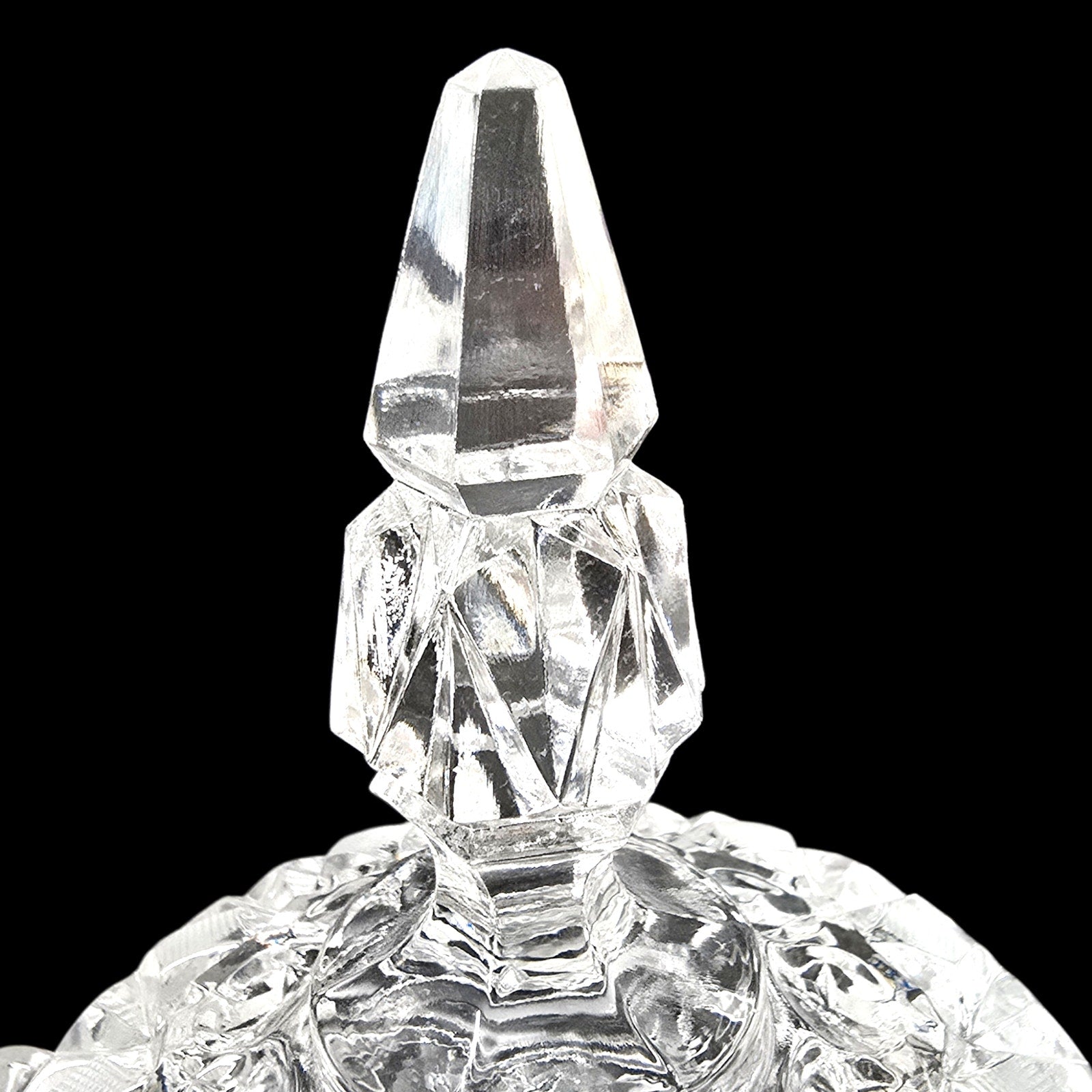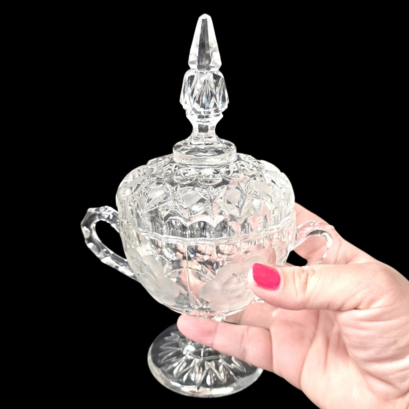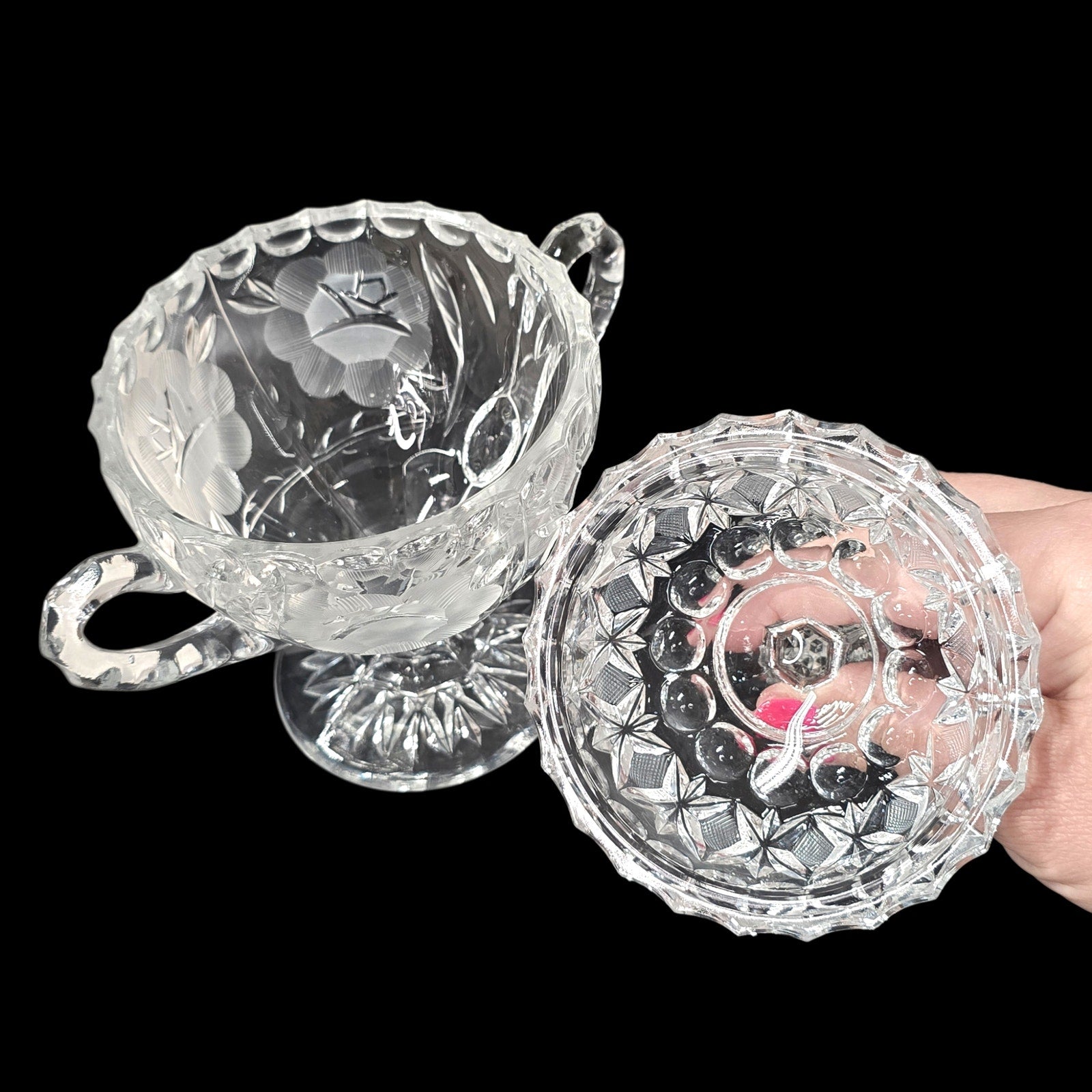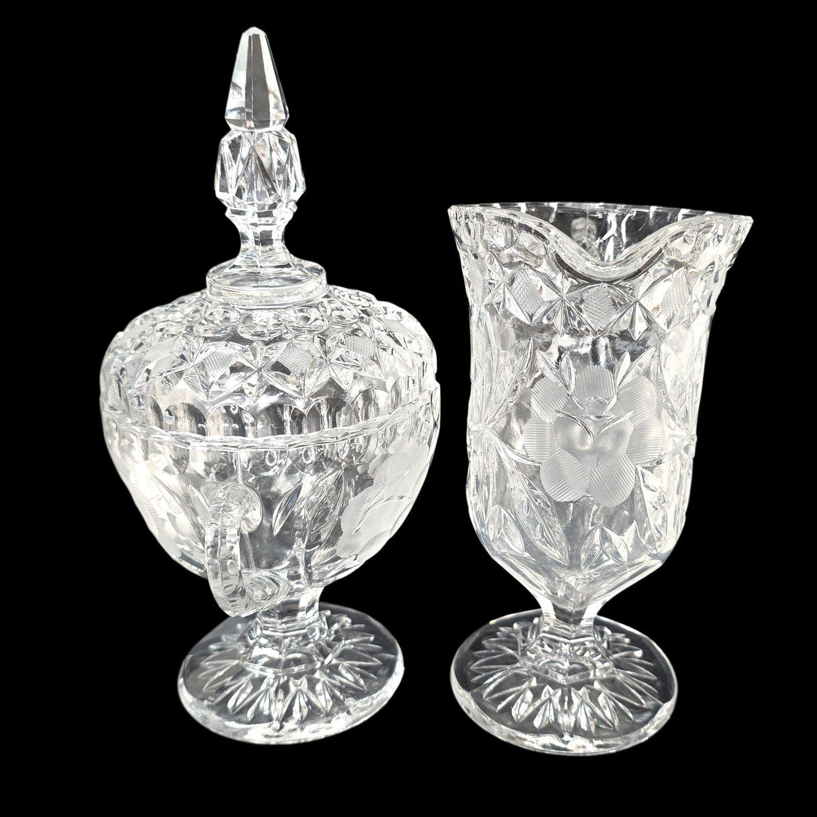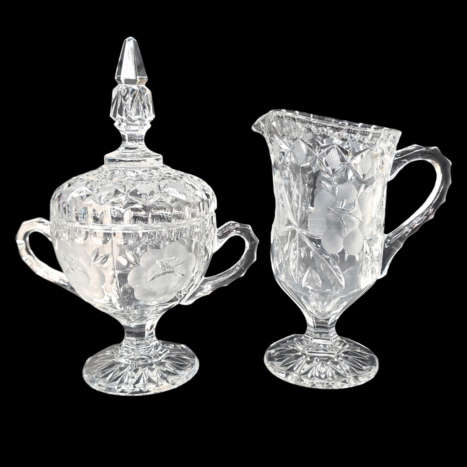 Details: Creamer (6.25") and double-handled Sugar Urn with lid (8"). Features traditional mold seams under handles, typical of high-end 'Near-Cut' elegant glass."
