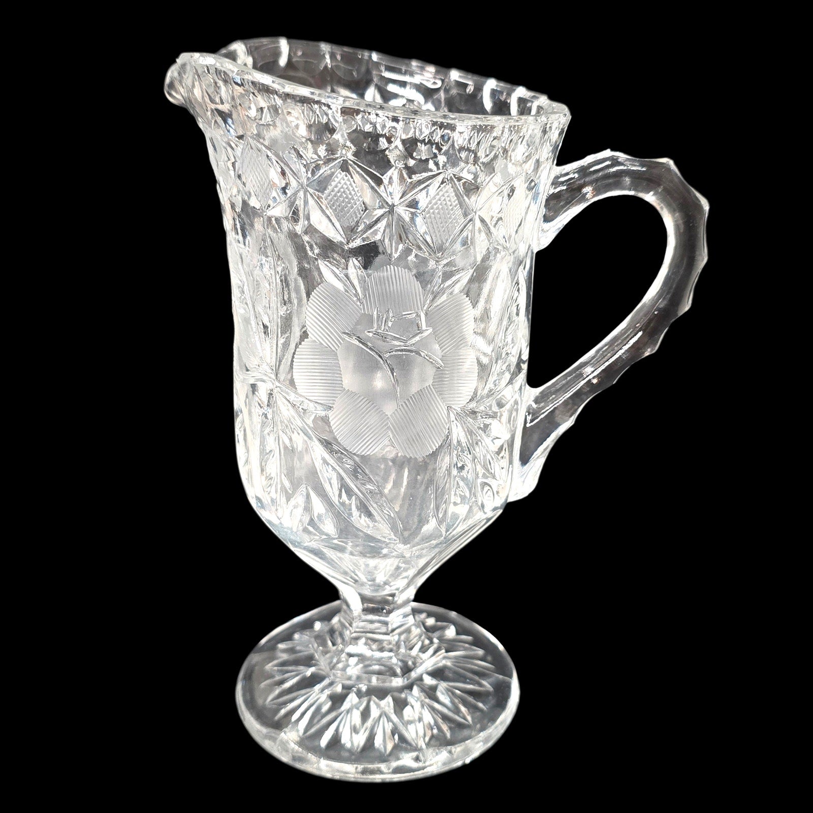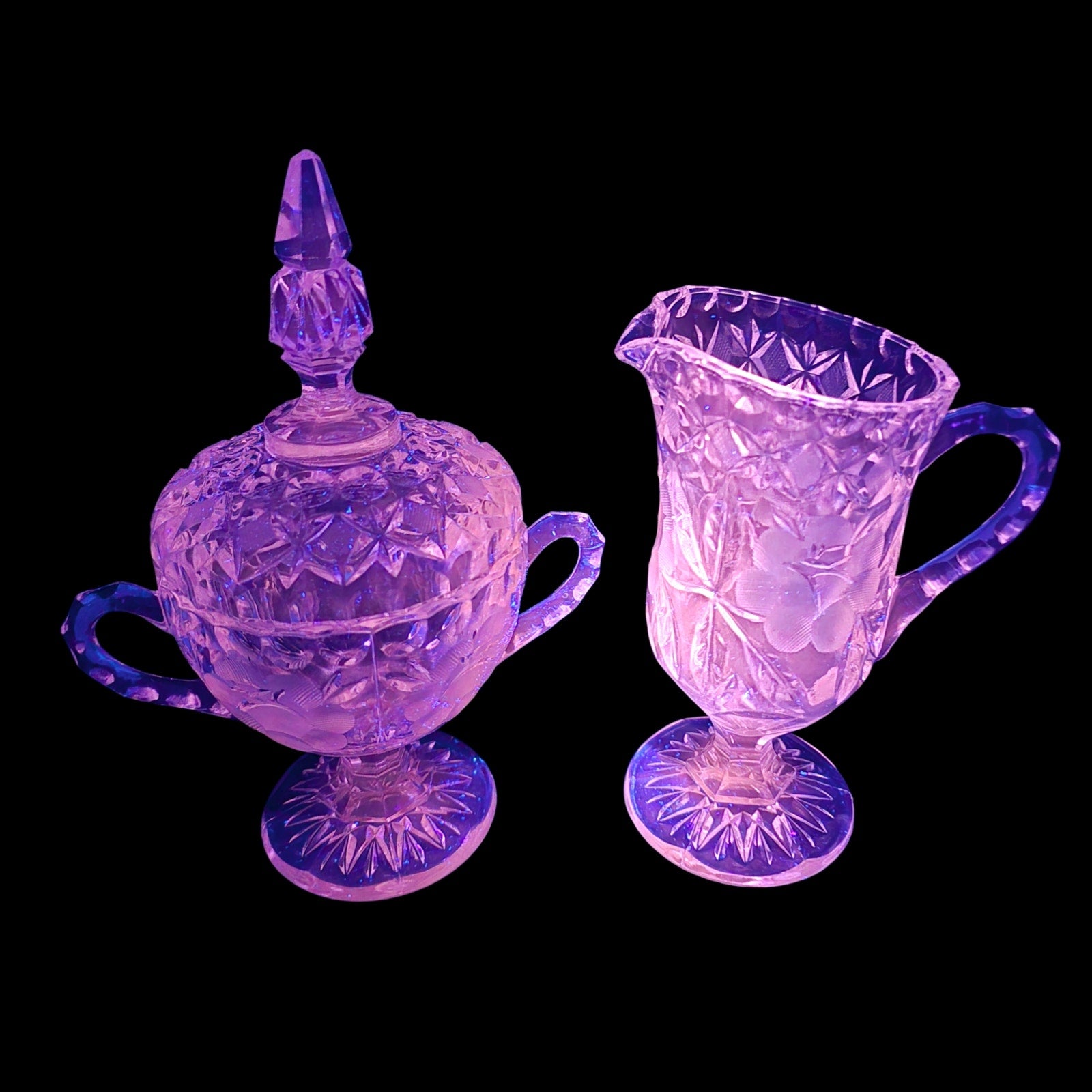 1930's Clear Selenium Glass Creamer & Sugar Set - Frosted Rose - 365nm Pink Glow