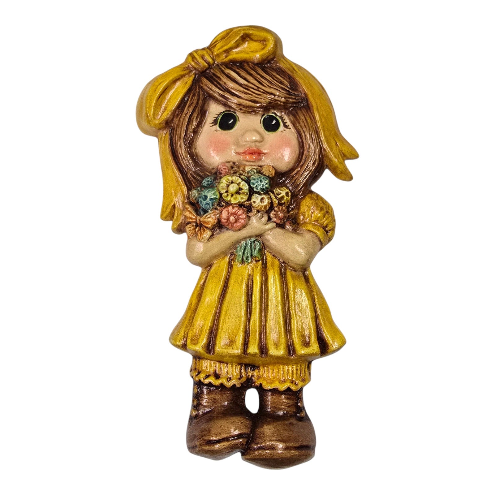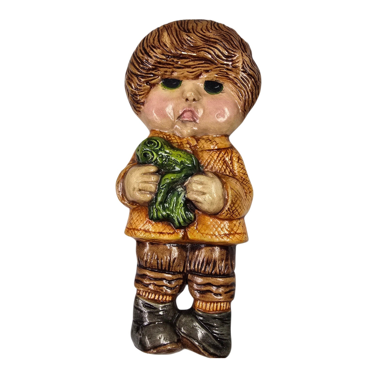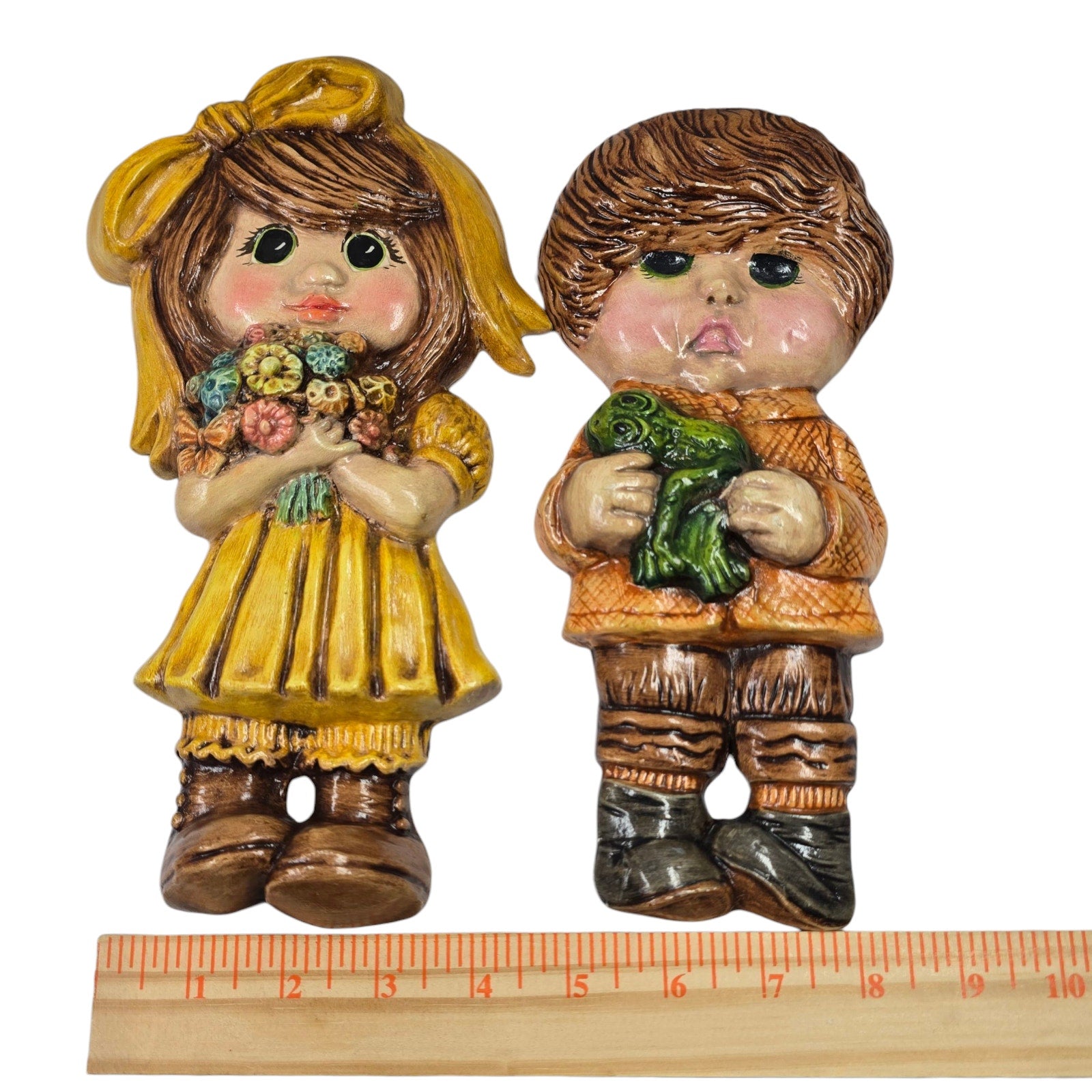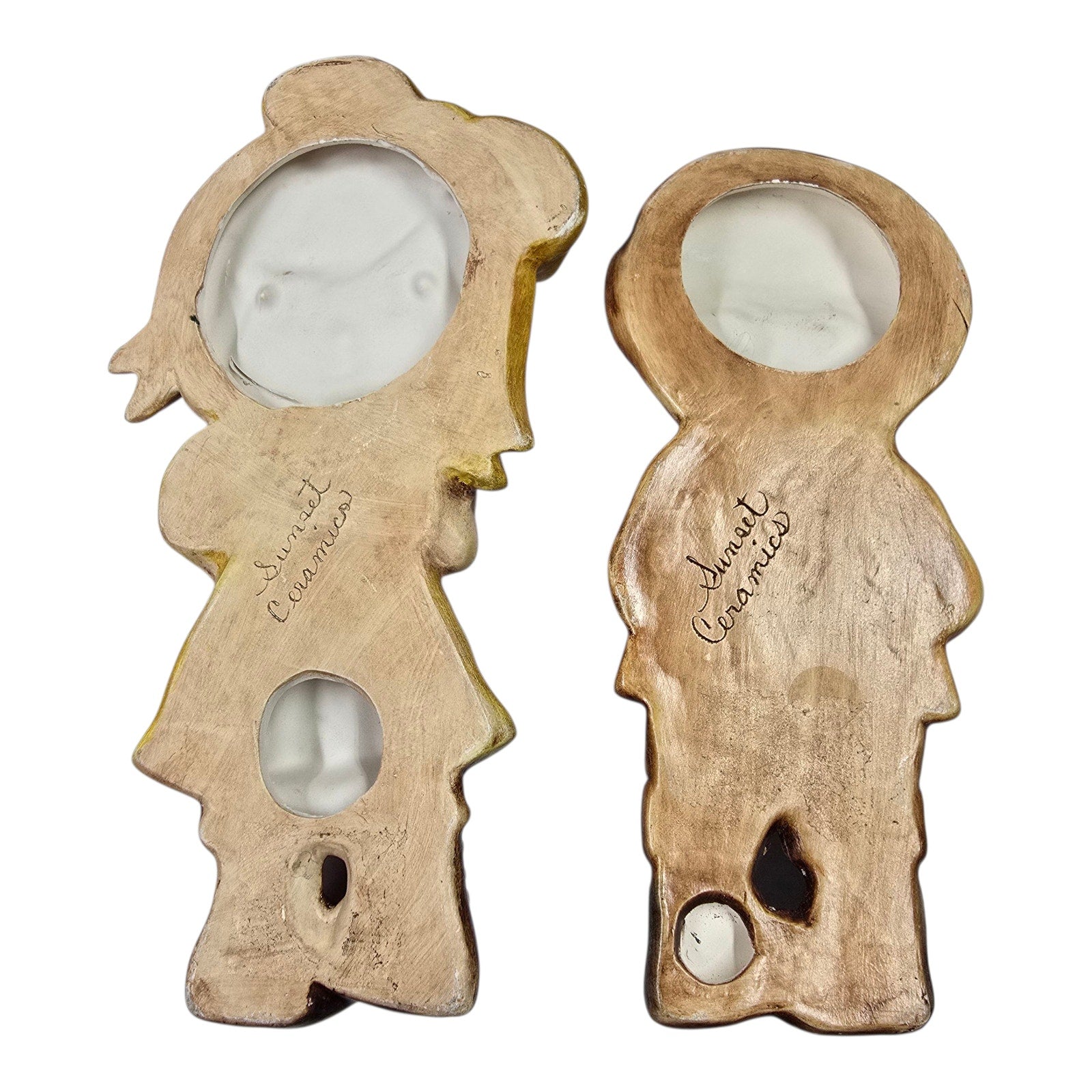 Hand-painted Sunset Ceramics wall plaques: girl with flowers (10.75" H) and boy holding a frog (9.75" H). Bold retro colors and big-eye style—perfect for kitsch/grannycore decor. Ready to hang.