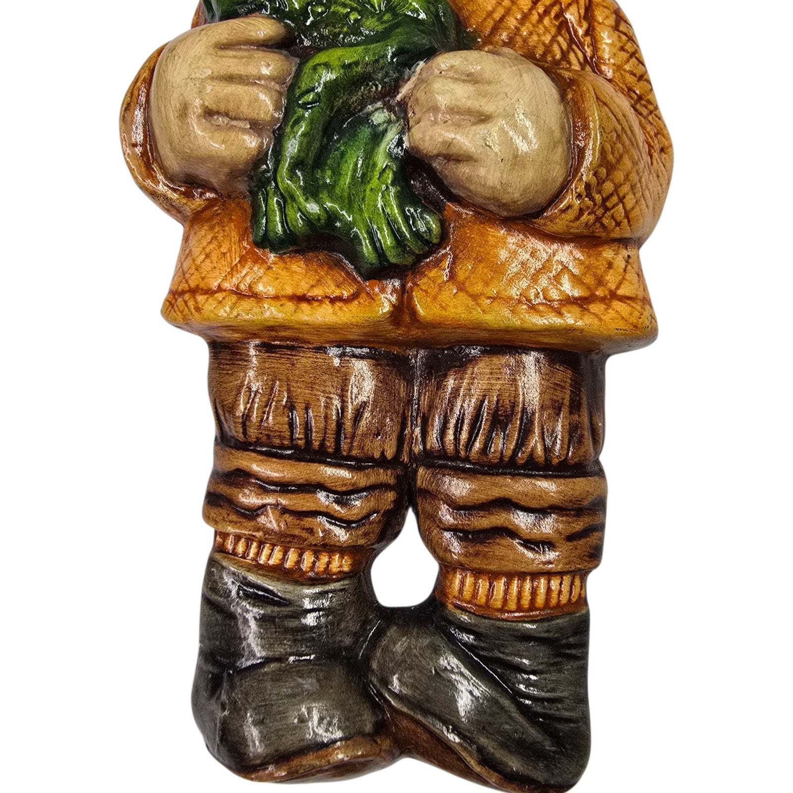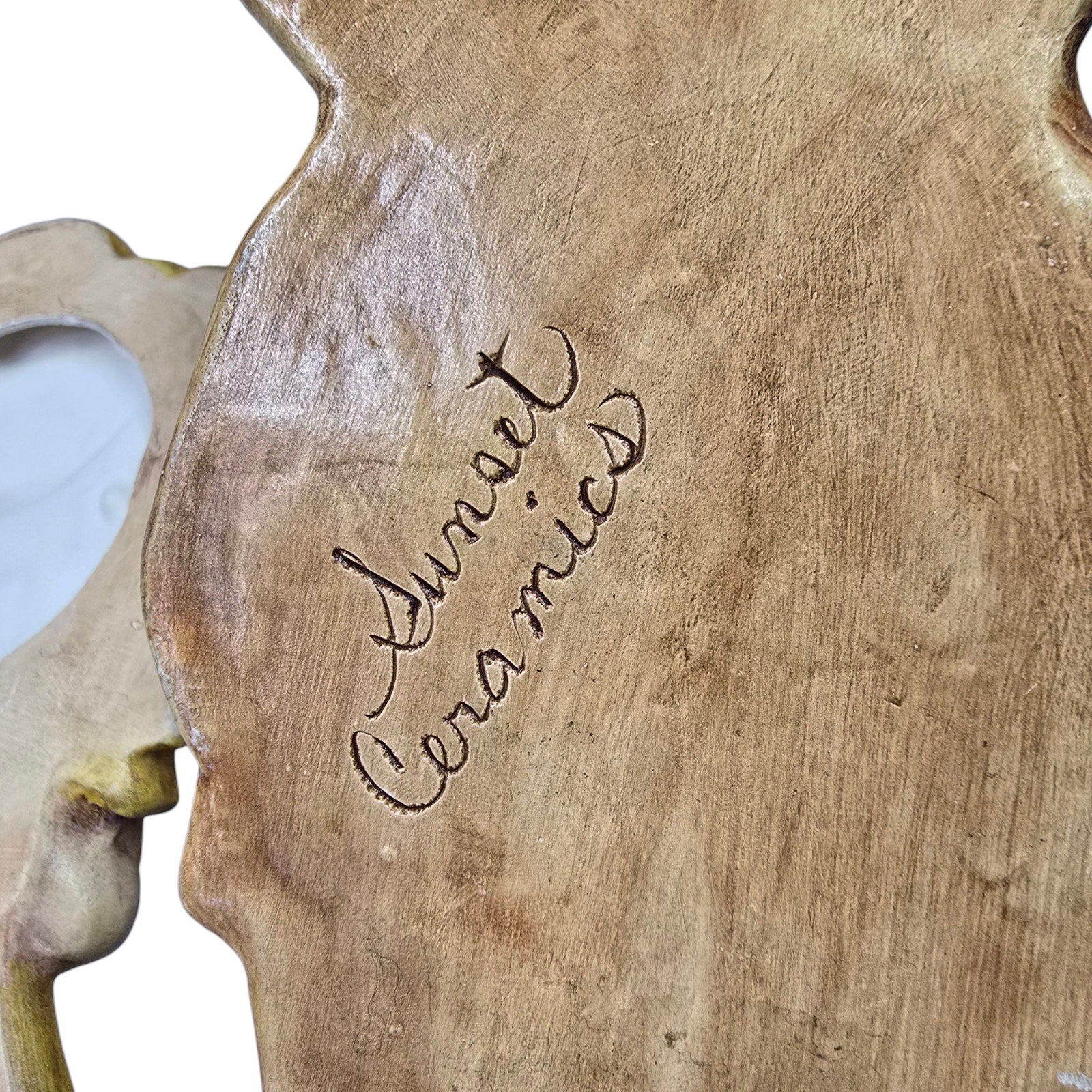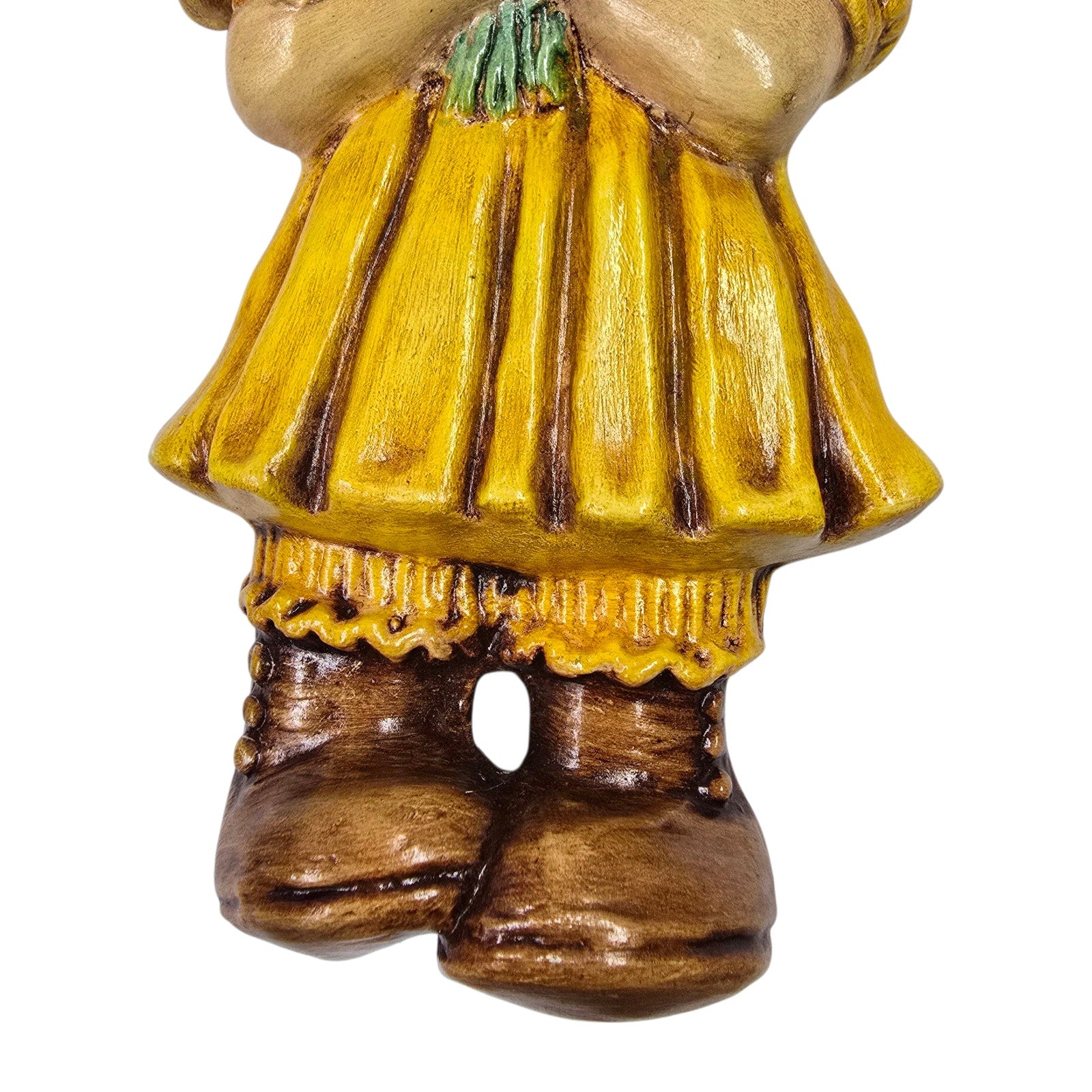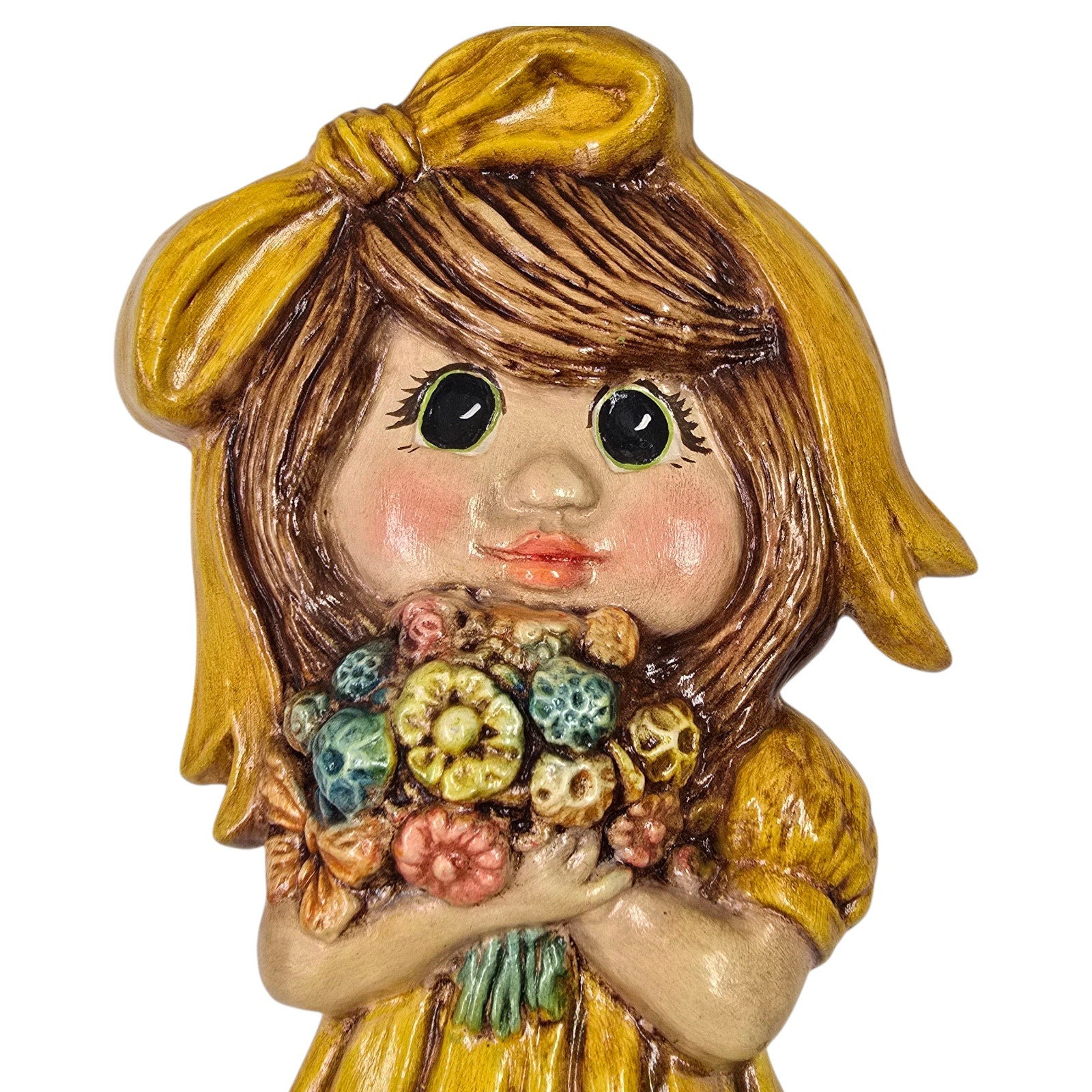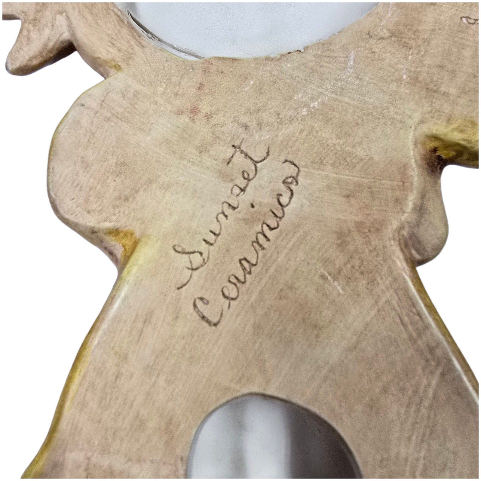 Hand-painted Sunset Ceramics wall plaques: girl with flowers (10.75" H) and boy holding a frog (9.75" H). Bold retro colors and big-eye style—perfect for kitsch/grannycore decor. Ready to hang.