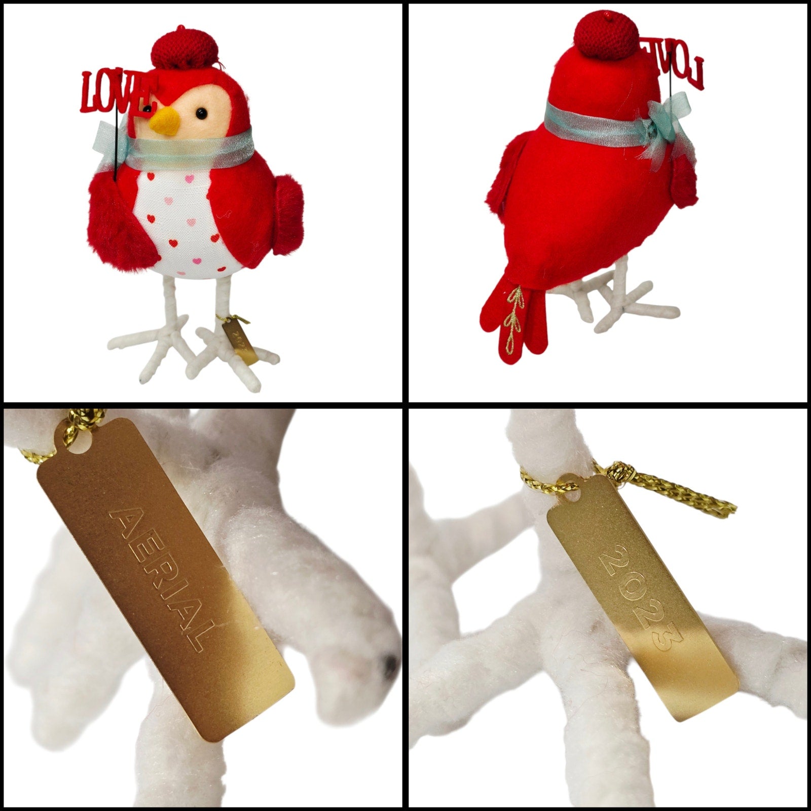 Aerial: The "Love Bird" in vibrant red fabric with a romantic "Love" pattern and bow.