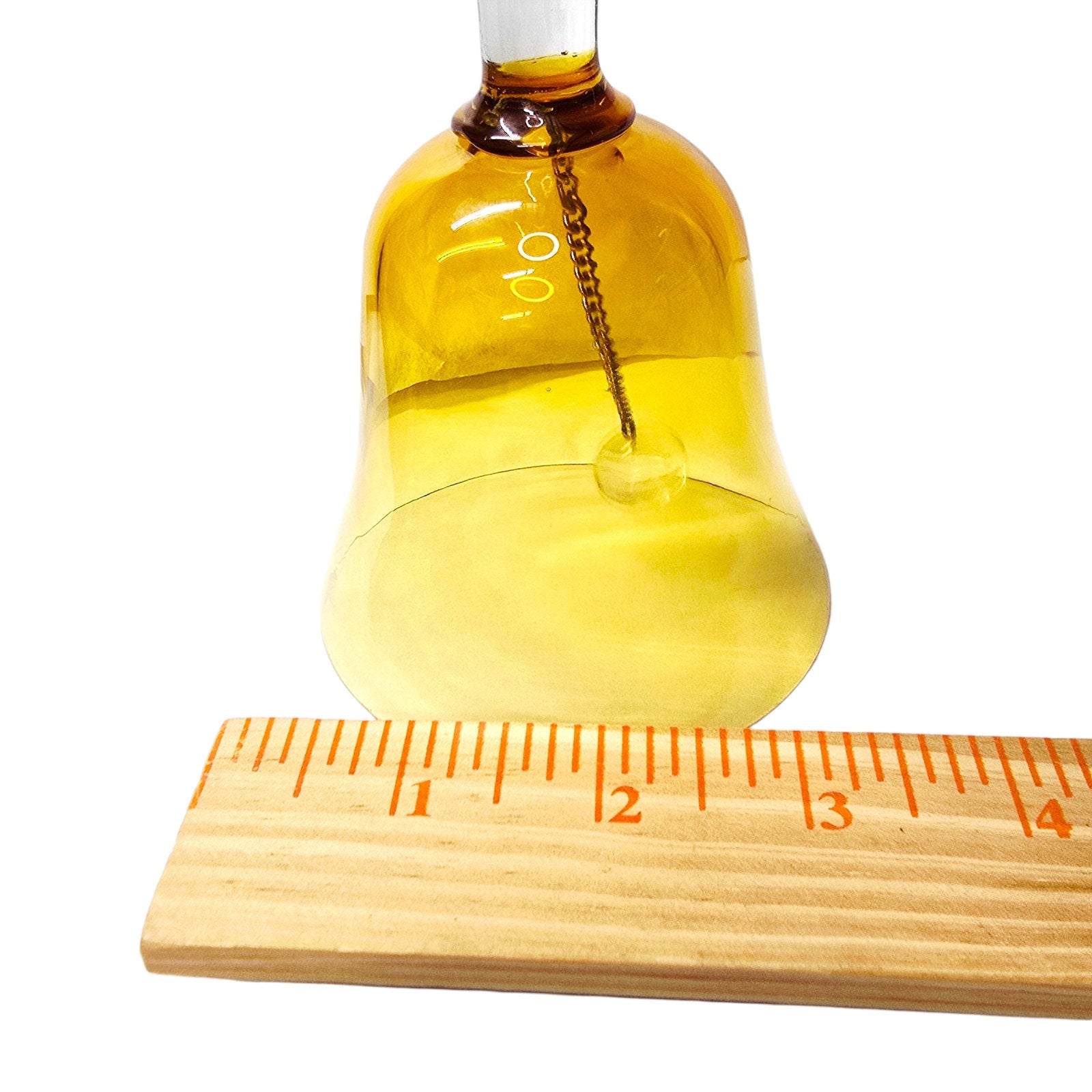 CONDITION: Good vintage condition with no chips or cracks to the bell body or handle. The glass clapper has a small chip on the undersideand does not affect hanging or stability. Light surface wear consistent with age and handblown glass.
