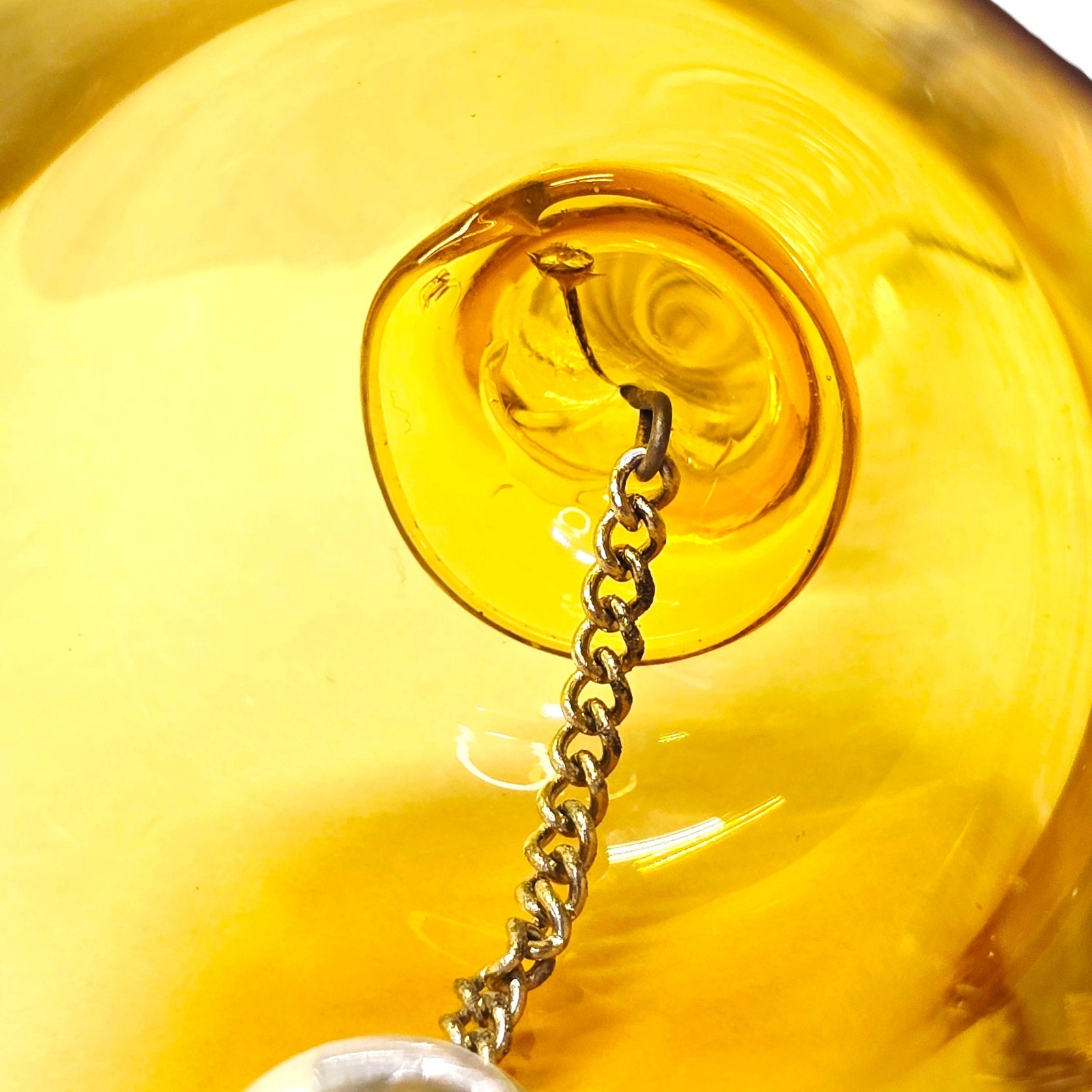 Art glass decorative bell featuring a striking encased spiral cane handle designed for art glass collectors rather than traditional bell collecting. Smooth clear handle with an internally encased spiral cane running the full length, showcasing skilled glasswork and visual depth. Amber-toned bell body with polished rim and suspended glass clapper. Handblown construction with balanced proportions and strong display presence. Measures approximately 6.25 inches high x 3.25 inches wide.