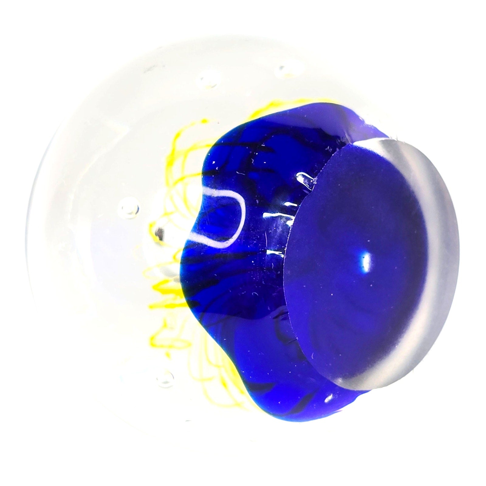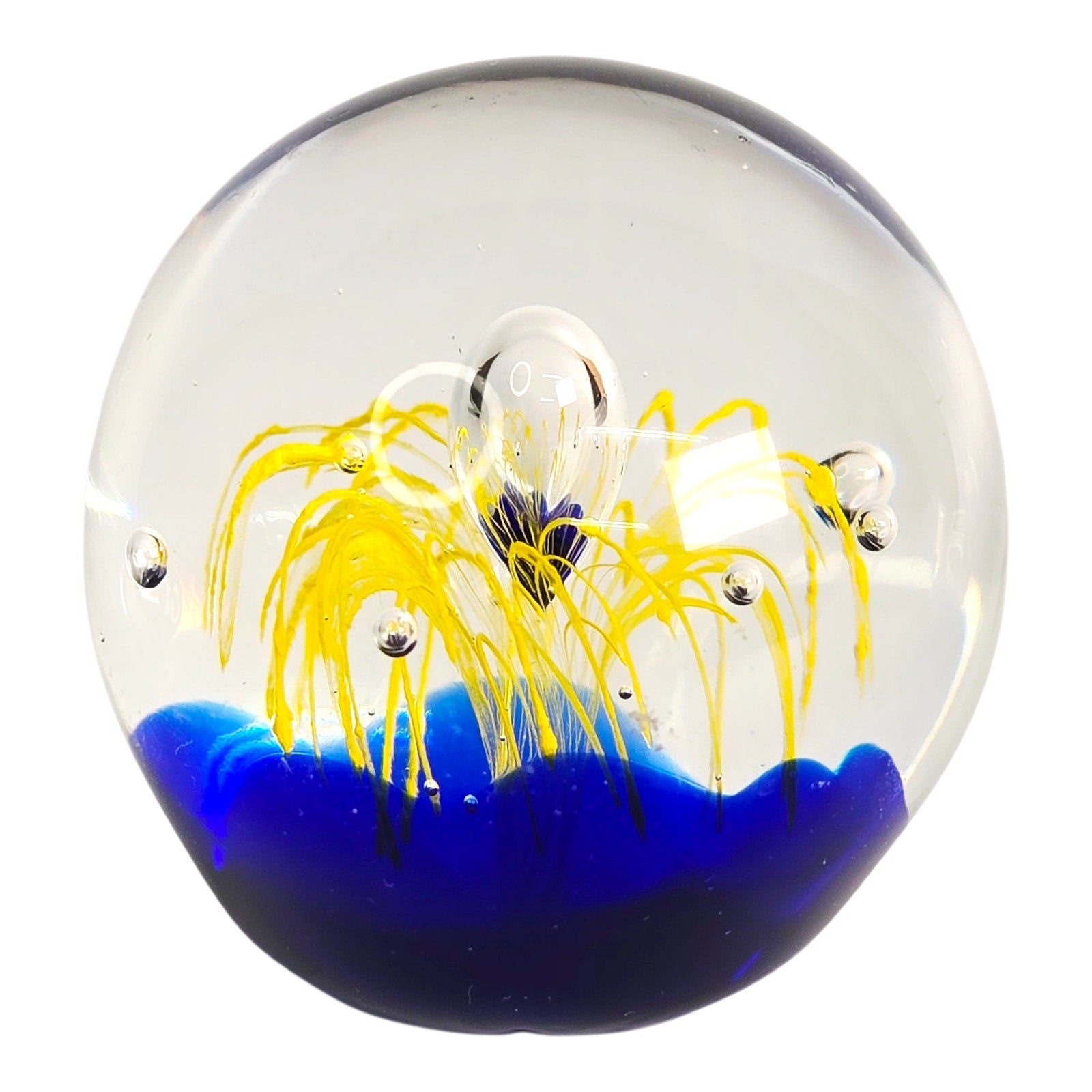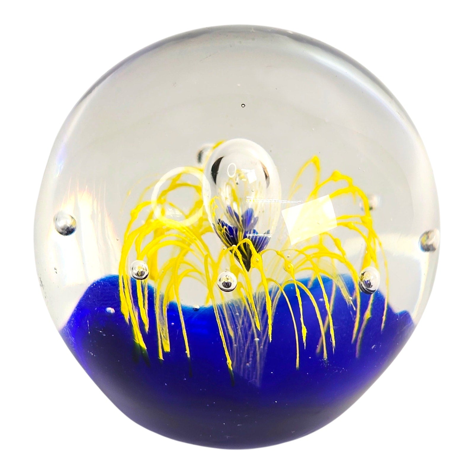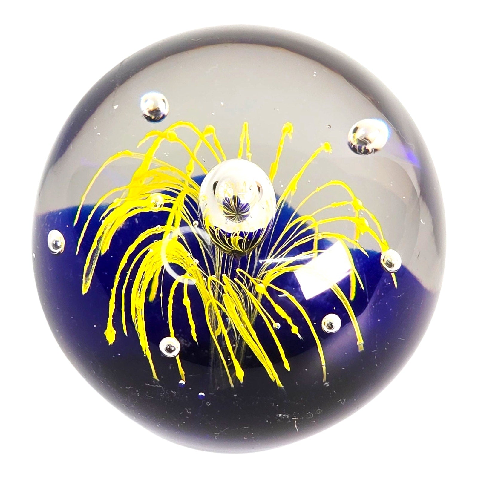 Add a touch of artistic flair to your home or office with this captivating art glass paperweight! The mesmerizing cobalt blue base provides a stunning backdrop for the vibrant yellow firework design. Small fleabite underside base. See pictures.