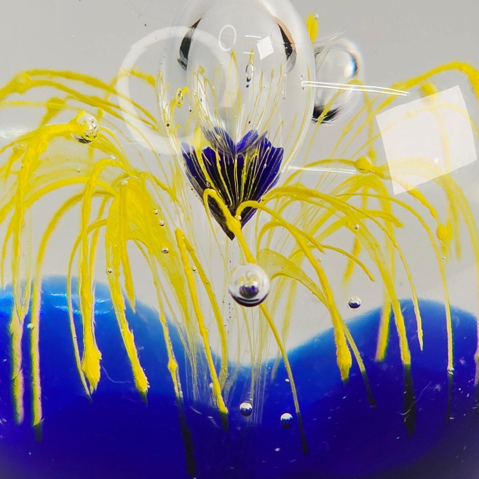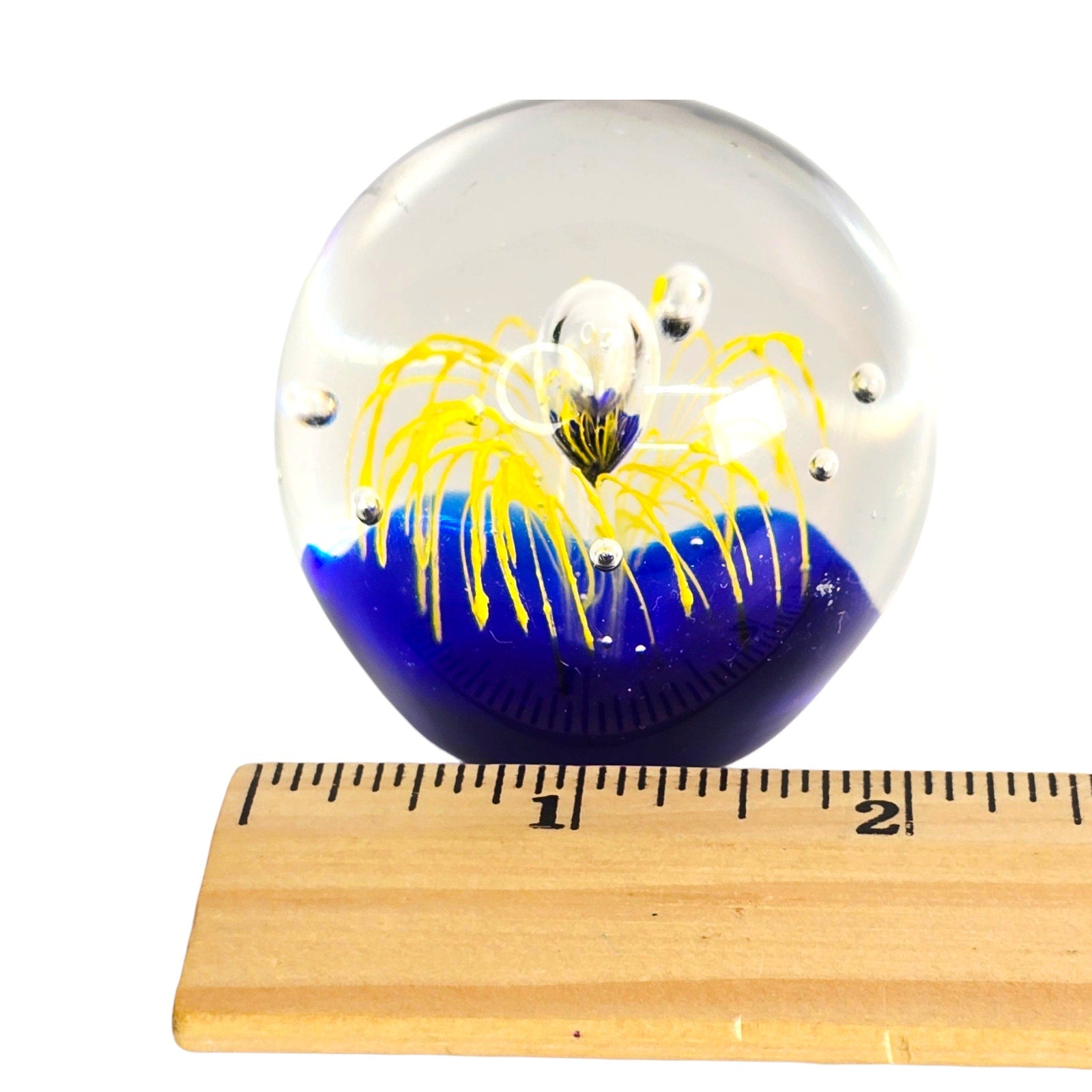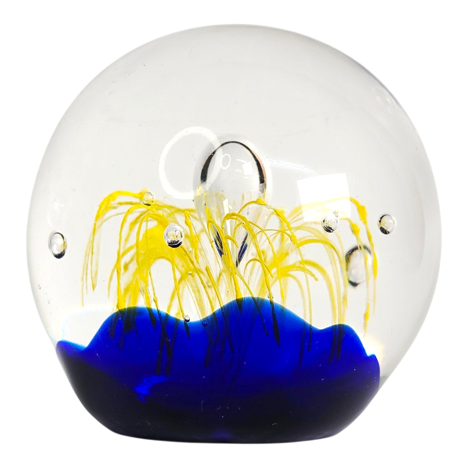 Add a touch of artistic flair to your home or office with this captivating art glass paperweight! The mesmerizing cobalt blue base provides a stunning backdrop for the vibrant yellow firework design. Small fleabite underside base. See pictures.