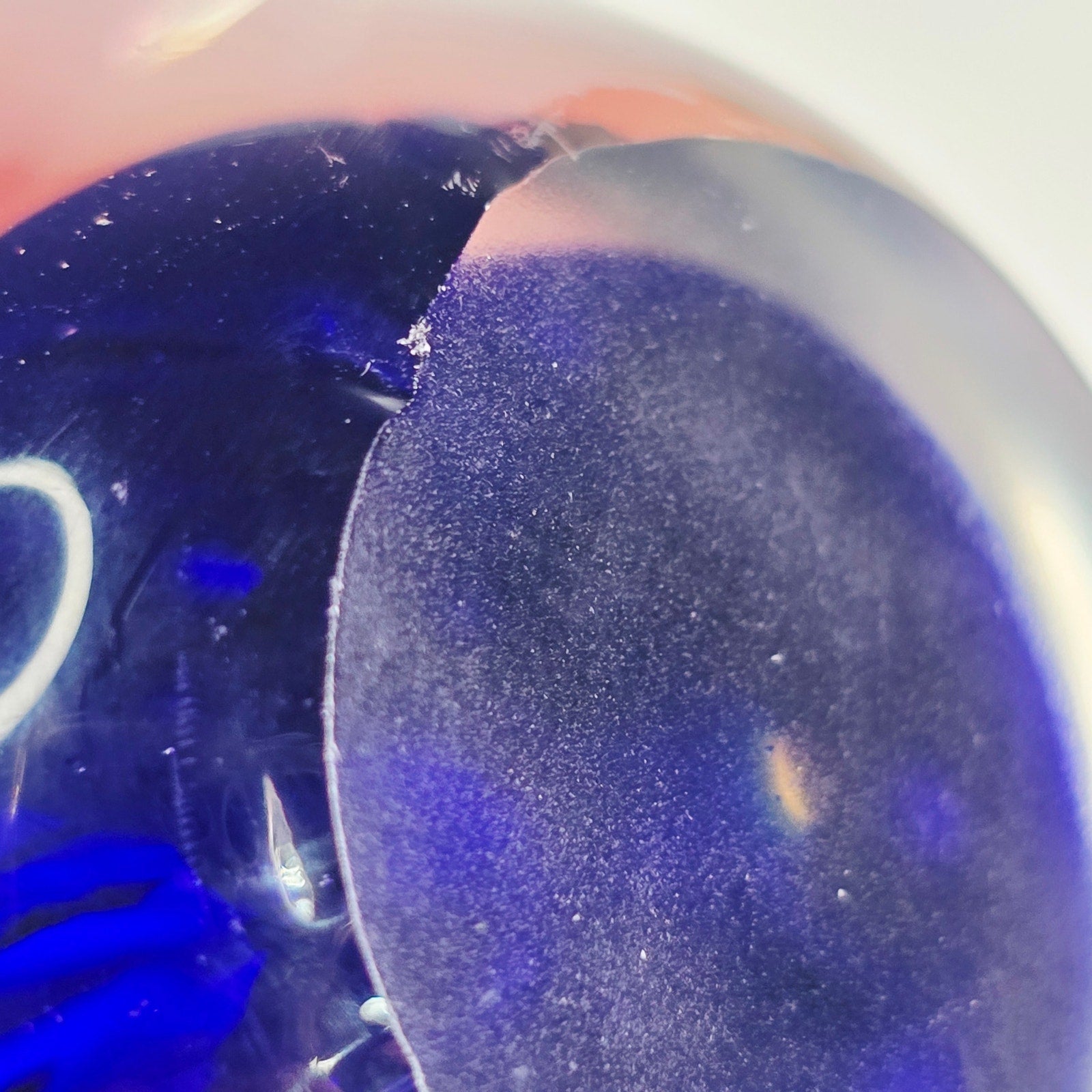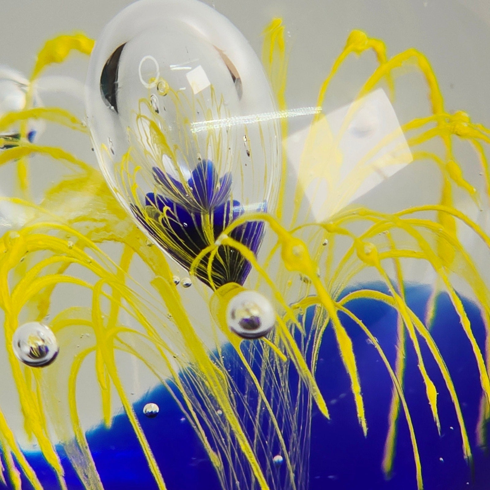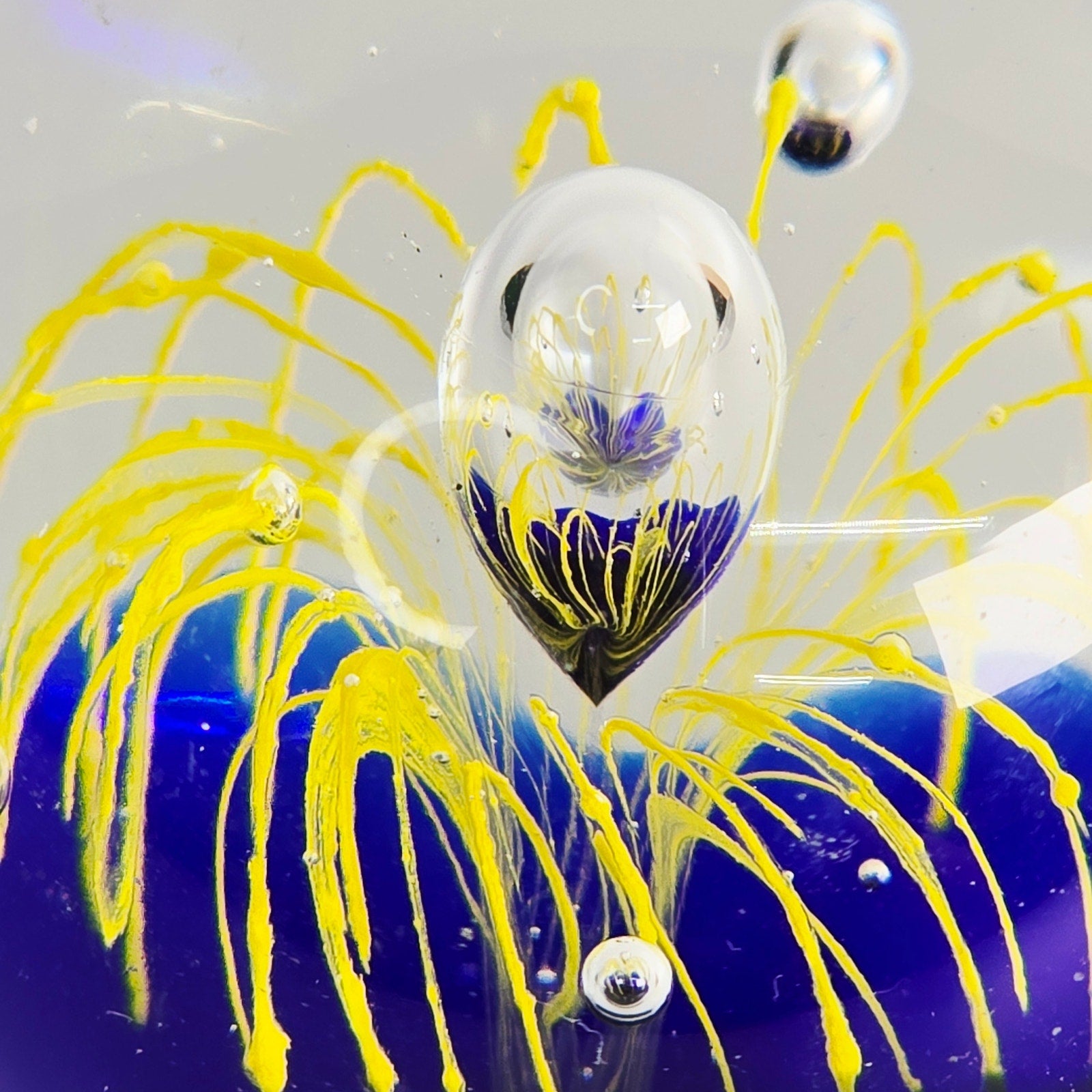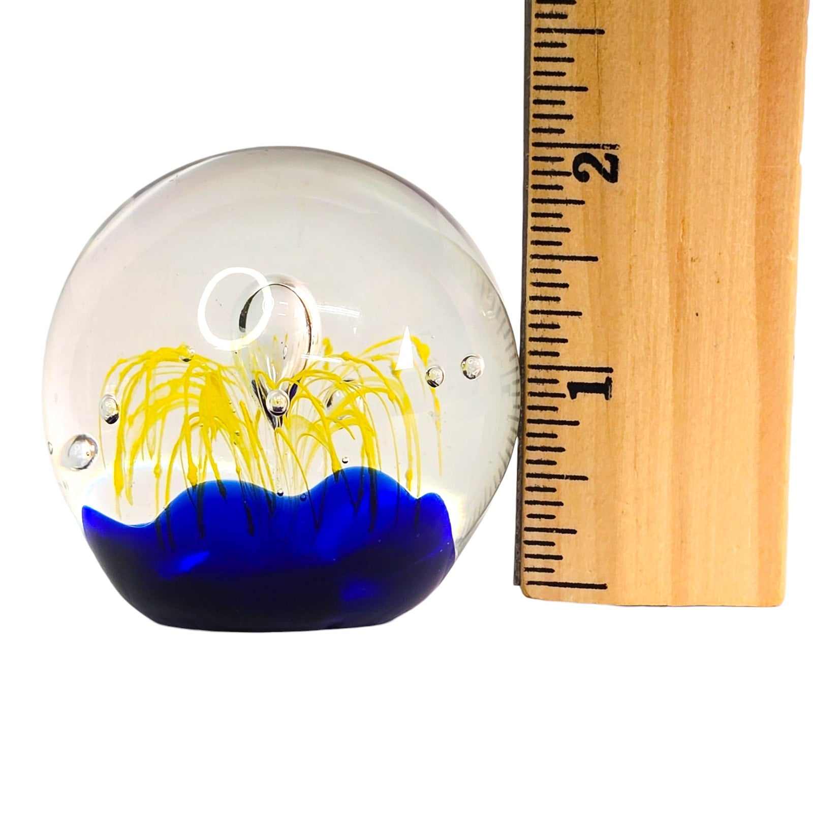 Add a touch of artistic flair to your home or office with this captivating art glass paperweight! The mesmerizing cobalt blue base provides a stunning backdrop for the vibrant yellow firework design. Small fleabite underside base. See pictures.