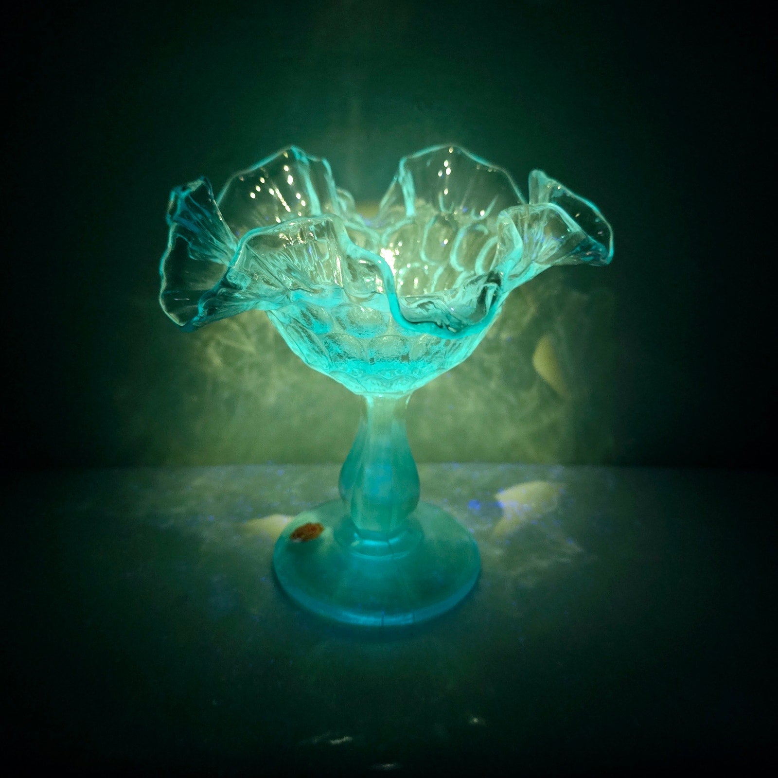 AS IS Fenton Blue Ruffled Pedestal Compote Coin Dot Candy Dish Glows Manganese