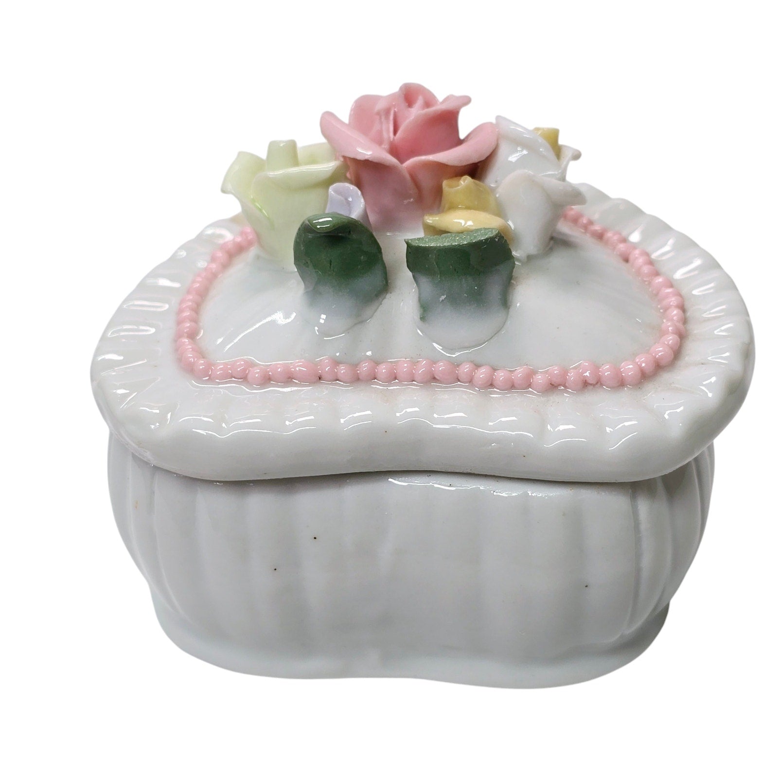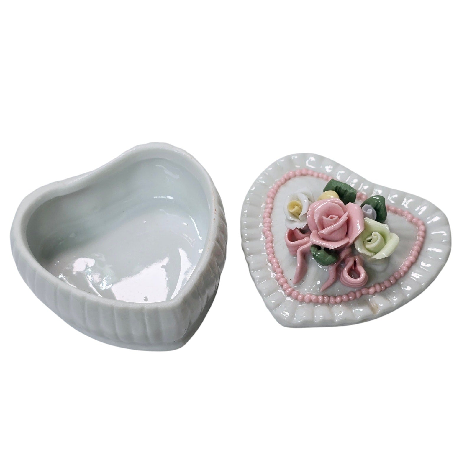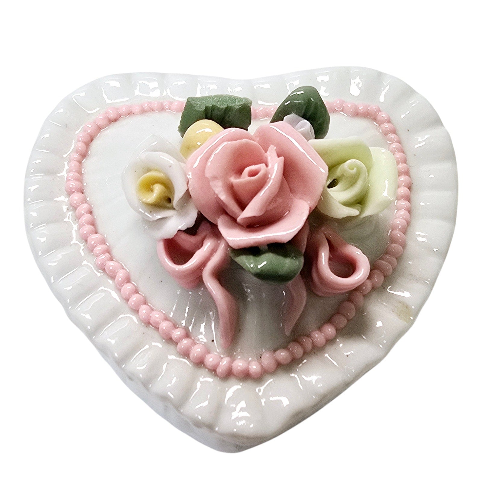 * AS IS Vintage Heart Shaped Porcelain Trinket Box Ring Holder with Roses Accents
