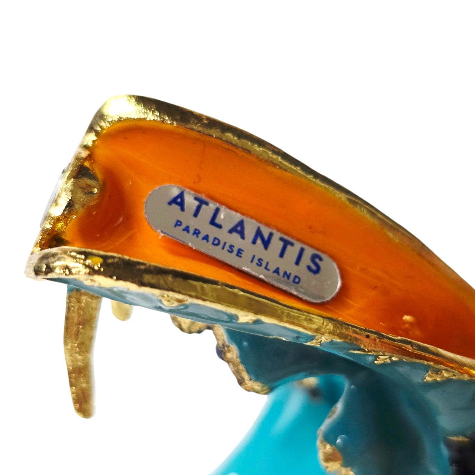 Atlantic Paradise Island (located in the Bahamas) is world-famous for its luxury ocean-themed decor. This piece utilizes Cloisonné-style techniques, where enamel is layered over metal to create a jewel-like finish. The inclusion of the rhinestone eye and the "shimmer" in the scales is designed to mimic the way a marlin’s skin actually glitters in the sunlight when it jumps out of the Caribbean waters.