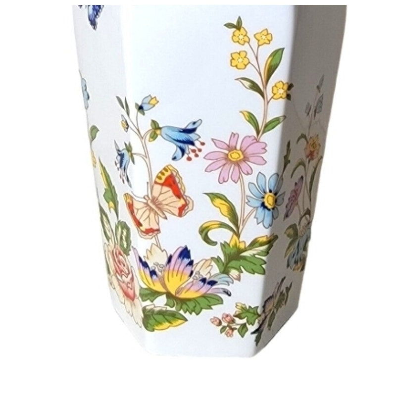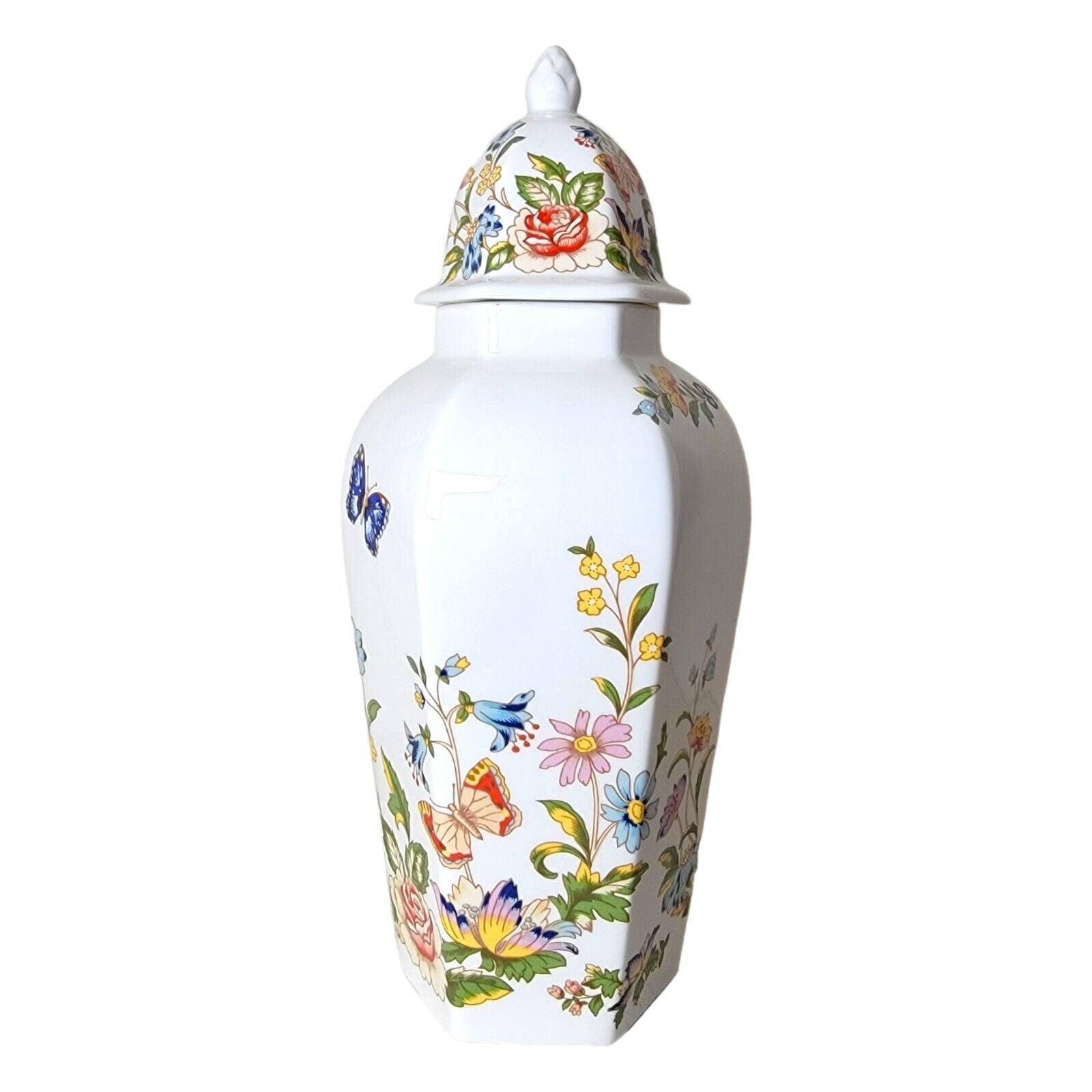 This Aynsley Cottage Garden Large Hexagon Lidded Vase is a beautiful addition to any collection. The vase features a gorgeous floral pattern with butterflies and flowers, perfect for all occasions. The hexagonal shape and glazed finish add an elegant touch to the piece.