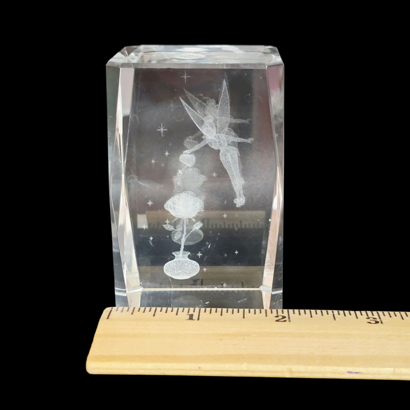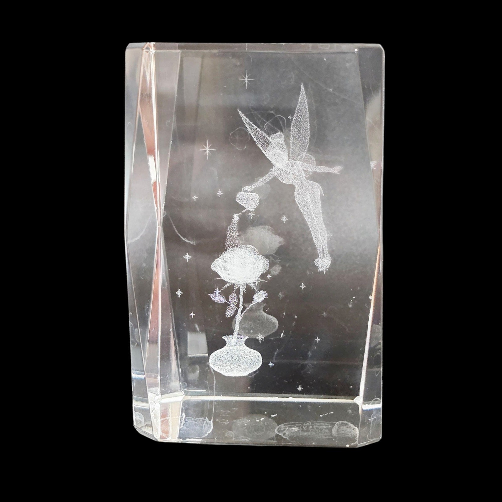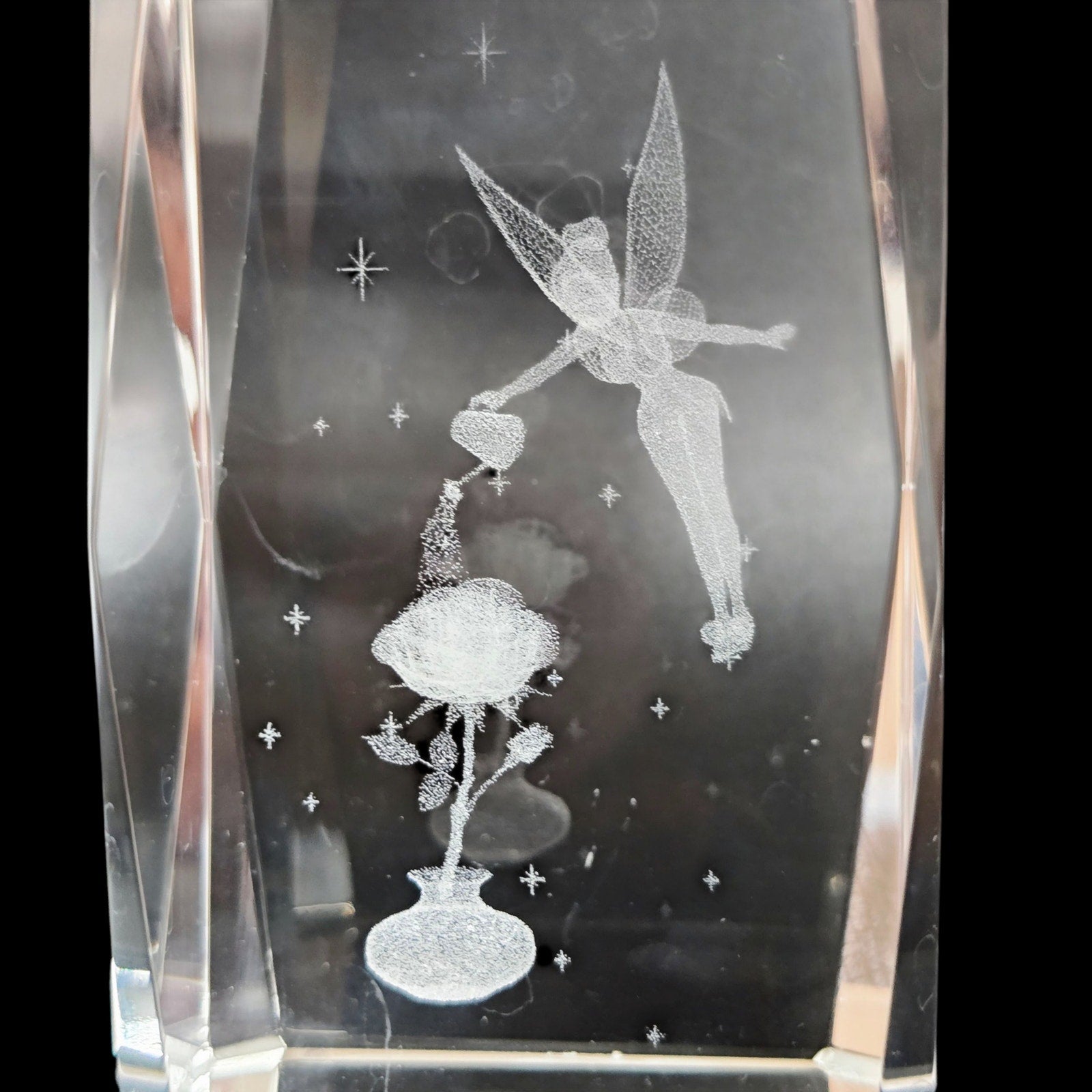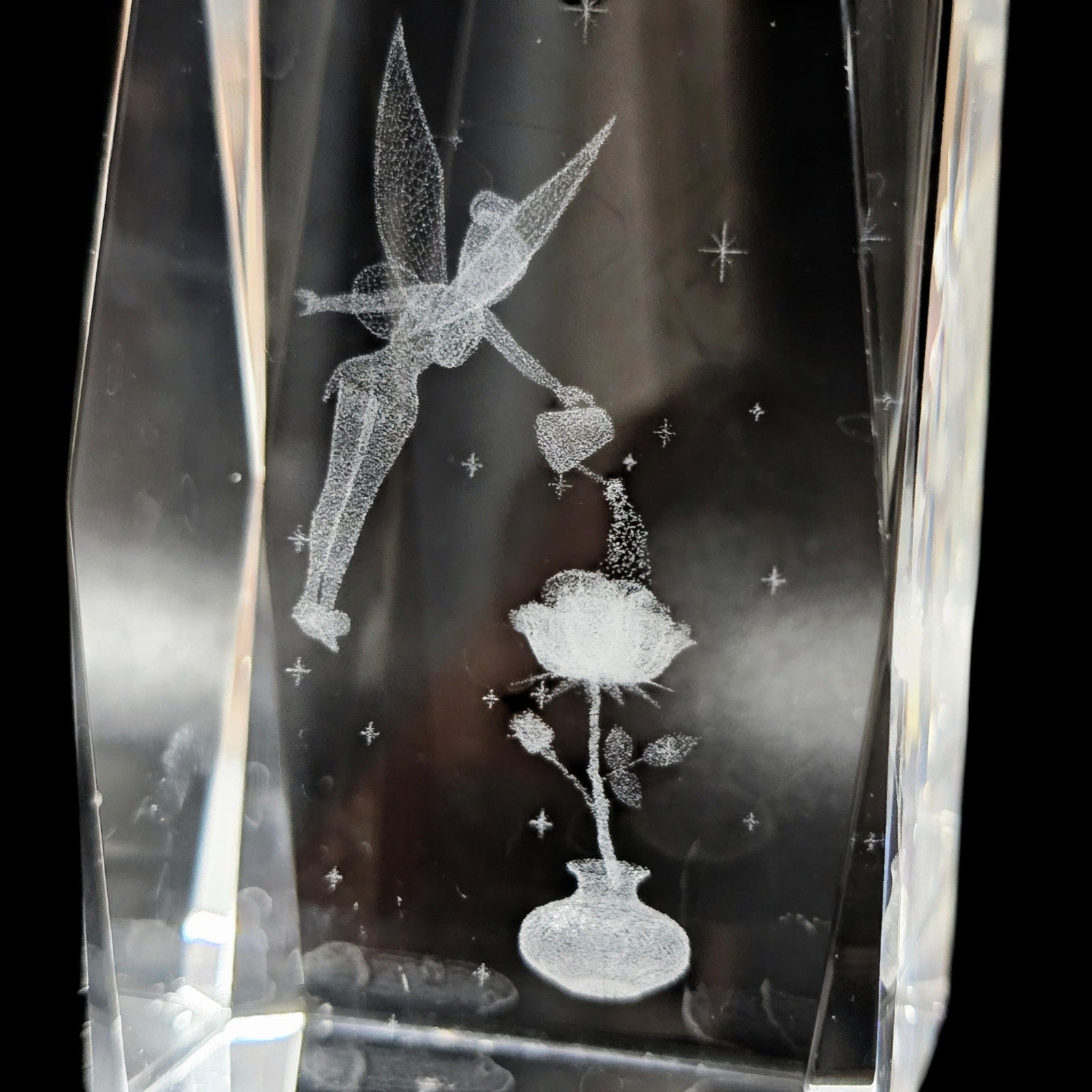 This beautiful 3D laser-etched cube features Tinkerbell lovingly watering a flower with her watering can. The intricate details and sparkling crystal glass make it a delightful collectible for Disney fans of all ages.
