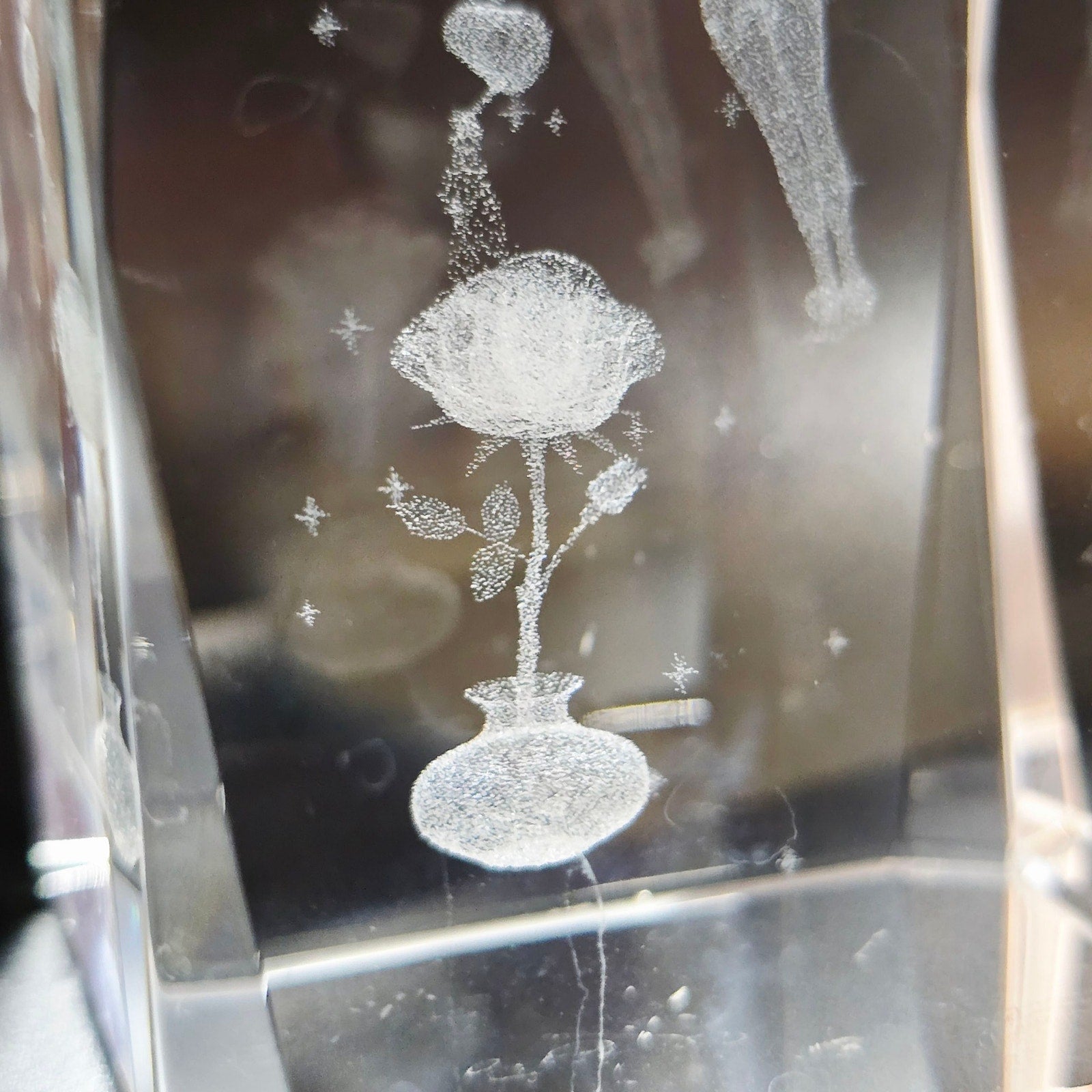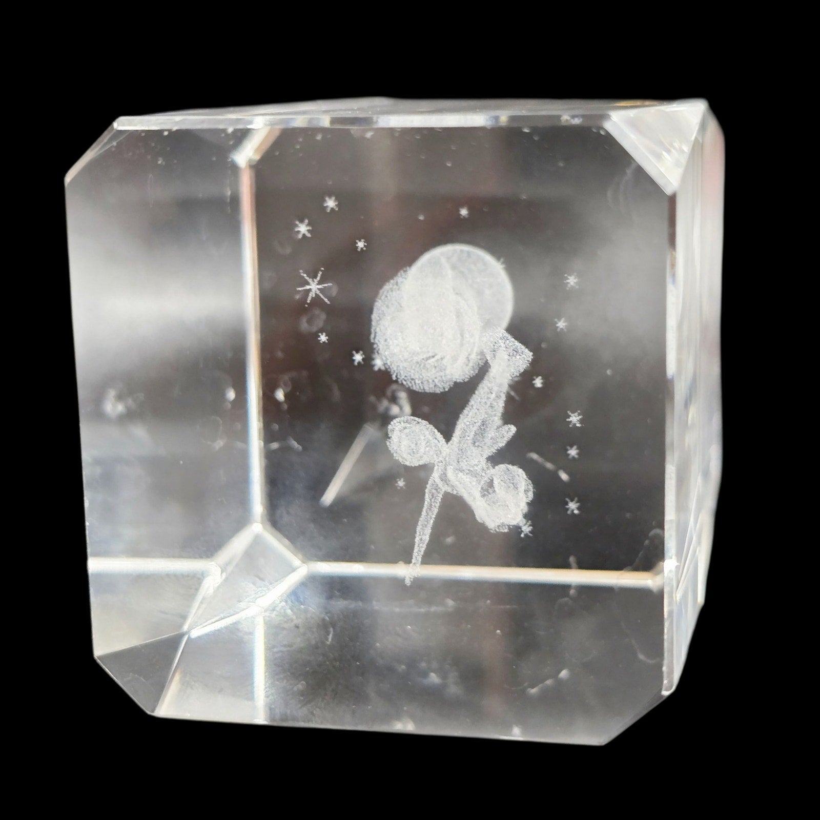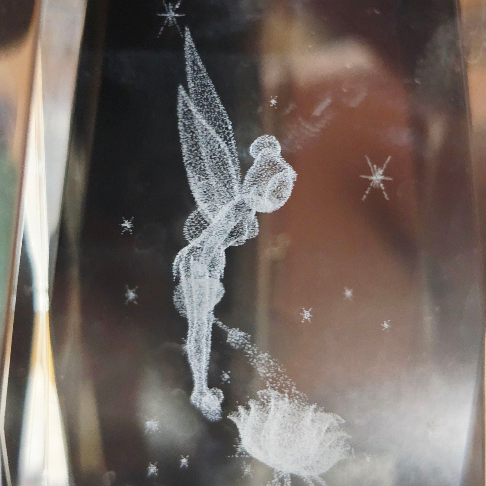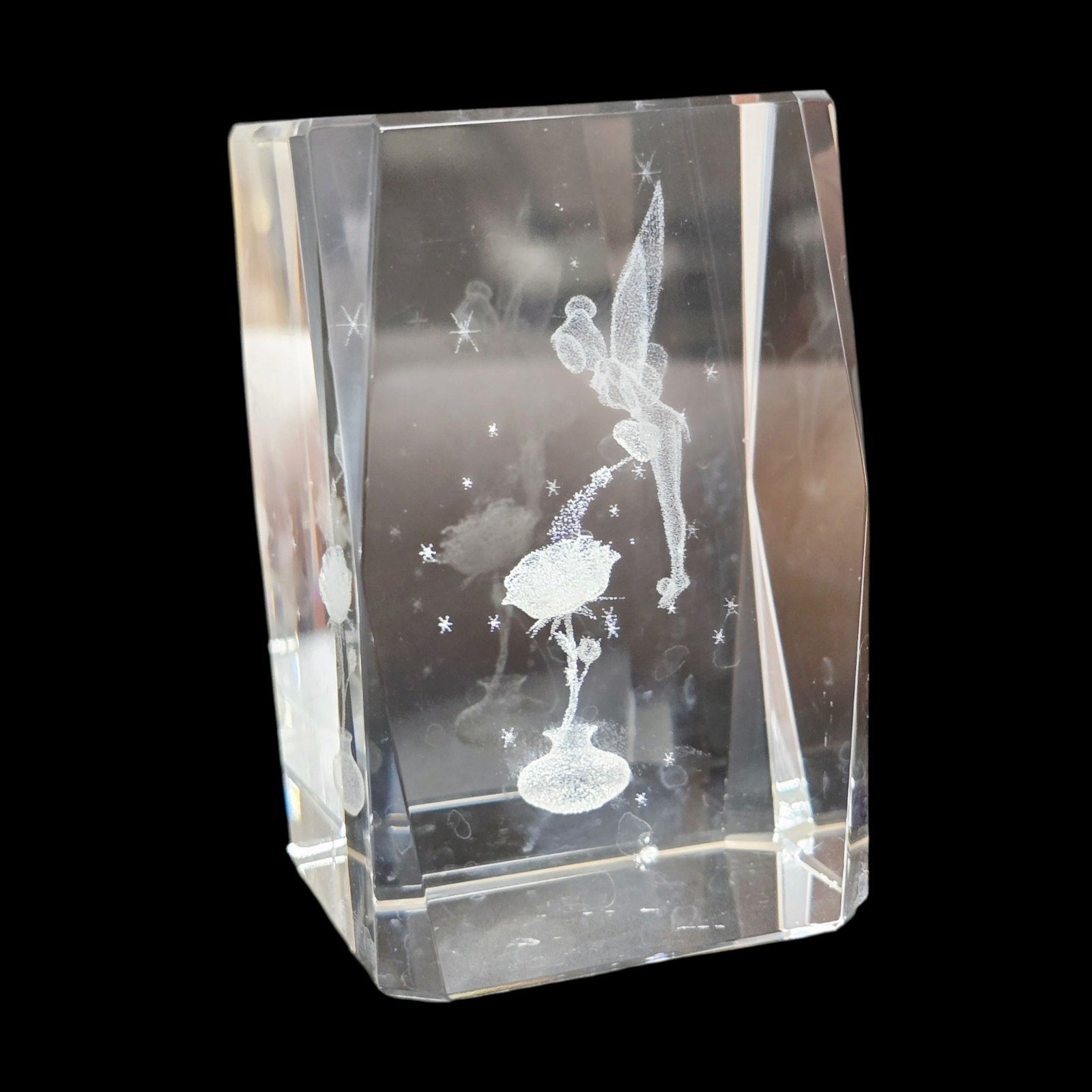 This beautiful 3D laser-etched cube features Tinkerbell lovingly watering a flower with her watering can. The intricate details and sparkling crystal glass make it a delightful collectible for Disney fans of all ages.
