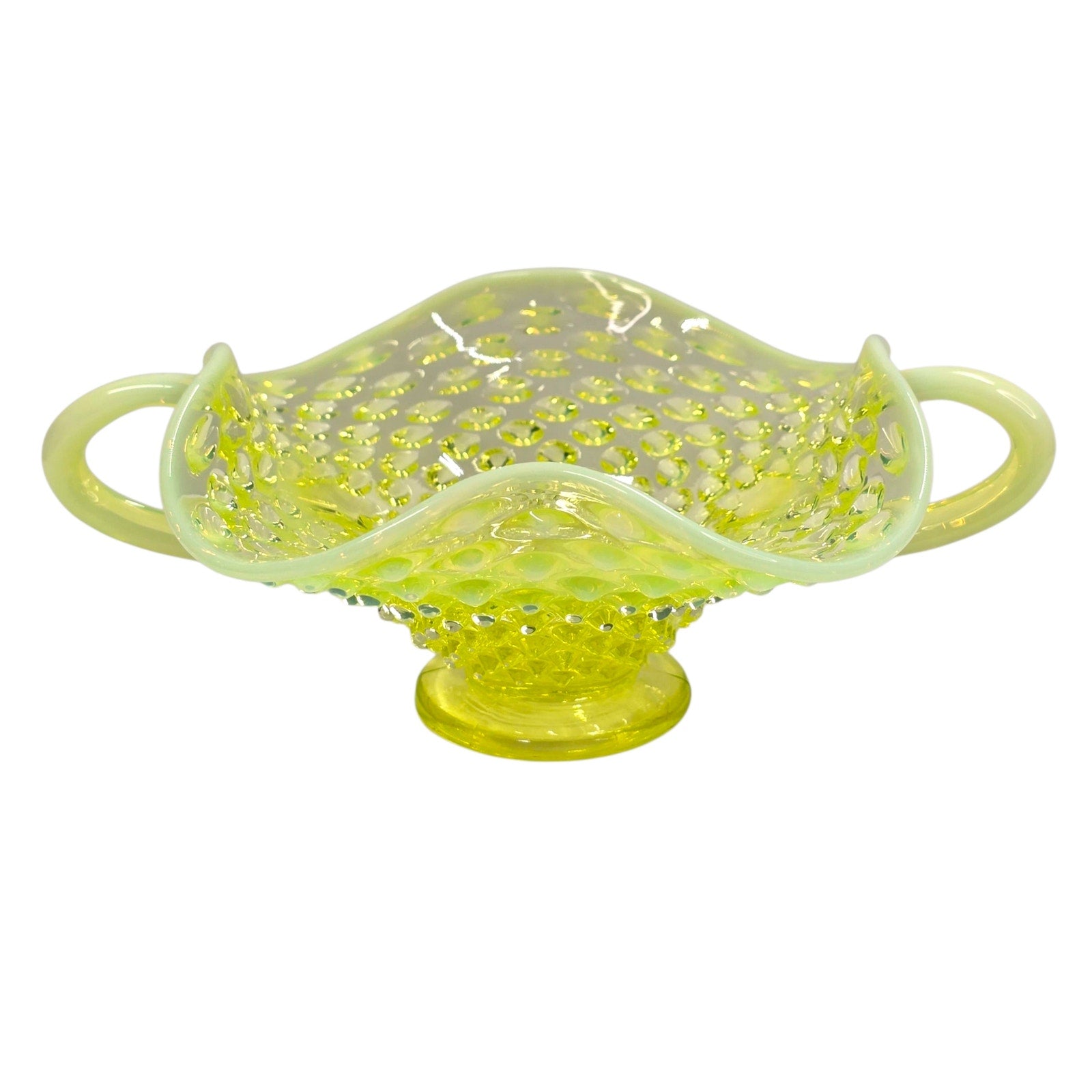 Vintage Fenton Vaseline Opalescent Hobnail Bonbon Dish featuring a uranium-infused topaz yellow glass body with milky opalescent rim and double applied handles.