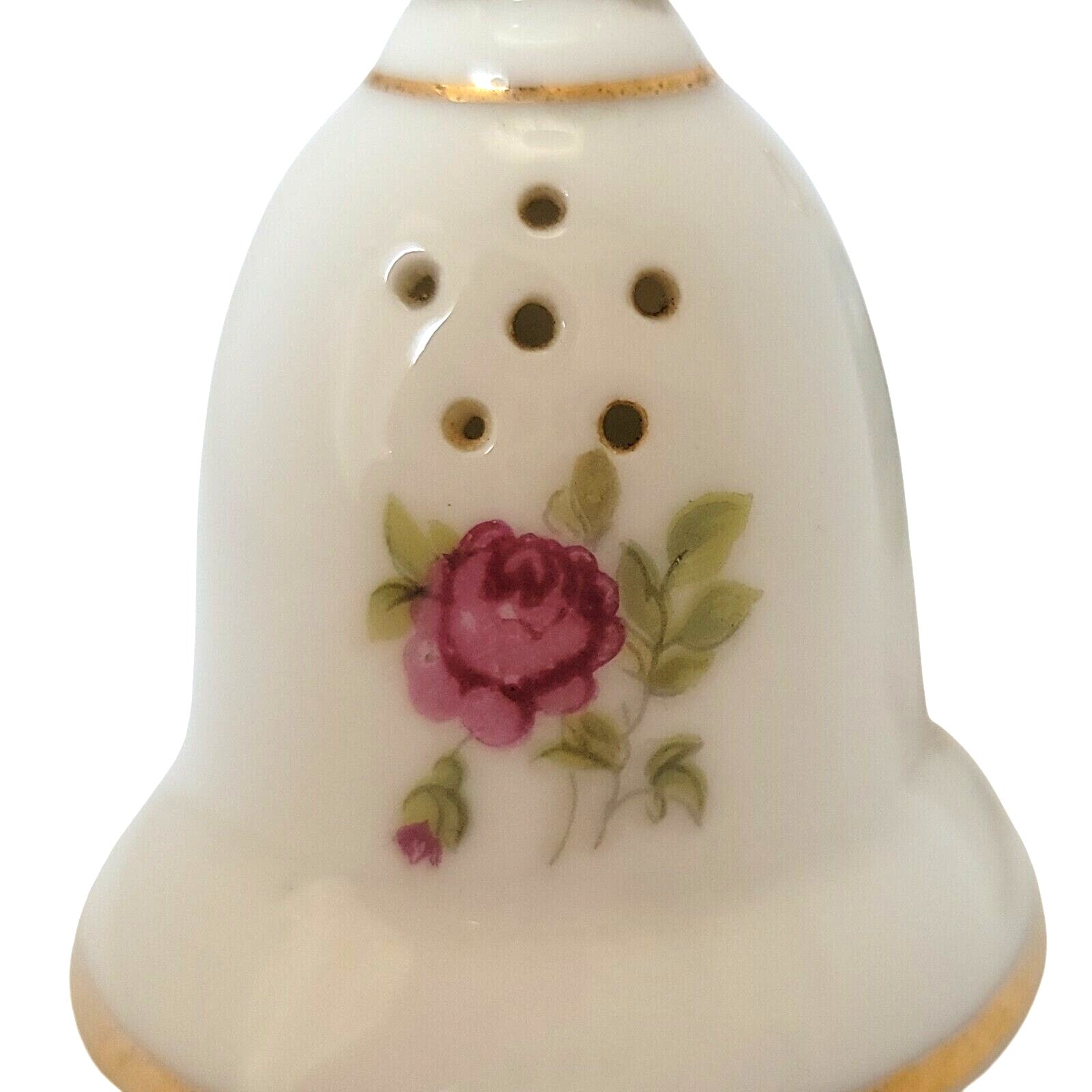 This item features a bell shaped ceramic Potpourri holder, with applied an rose on one side and applied picture of Forest Lawn on the other.