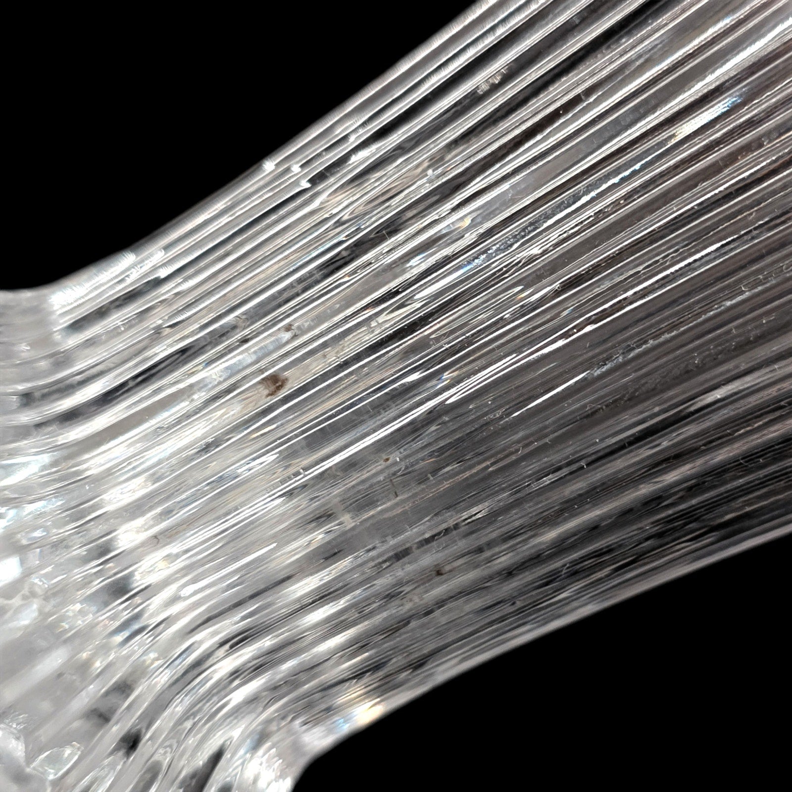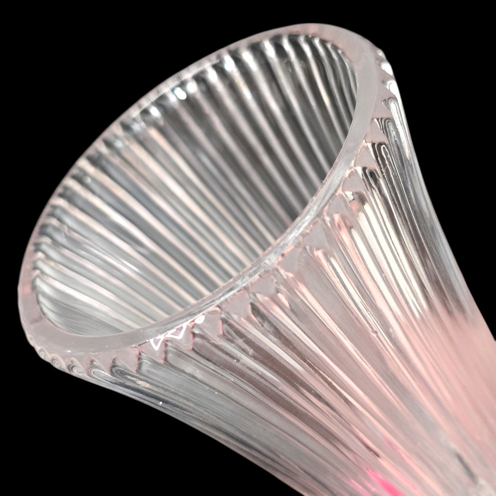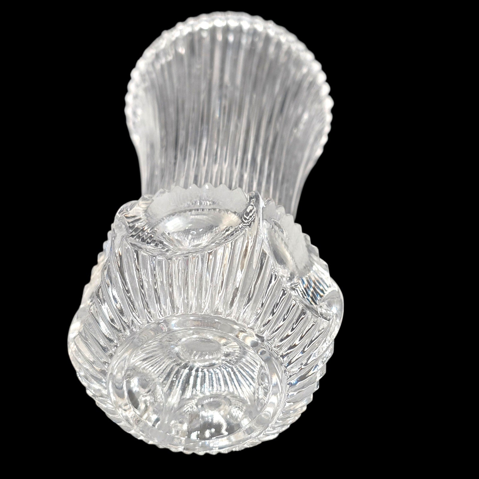 Vintage Fostoria Melissa lead crystal bud vase (#2908). Stands 4.75" tall with a beautiful ribbed body and a concave thumbprint base. This is high-quality crystal with a clear ring. UV Reactive: Displays a light lavender glow in the base under 365nm light due to Manganese content. Excellent condition