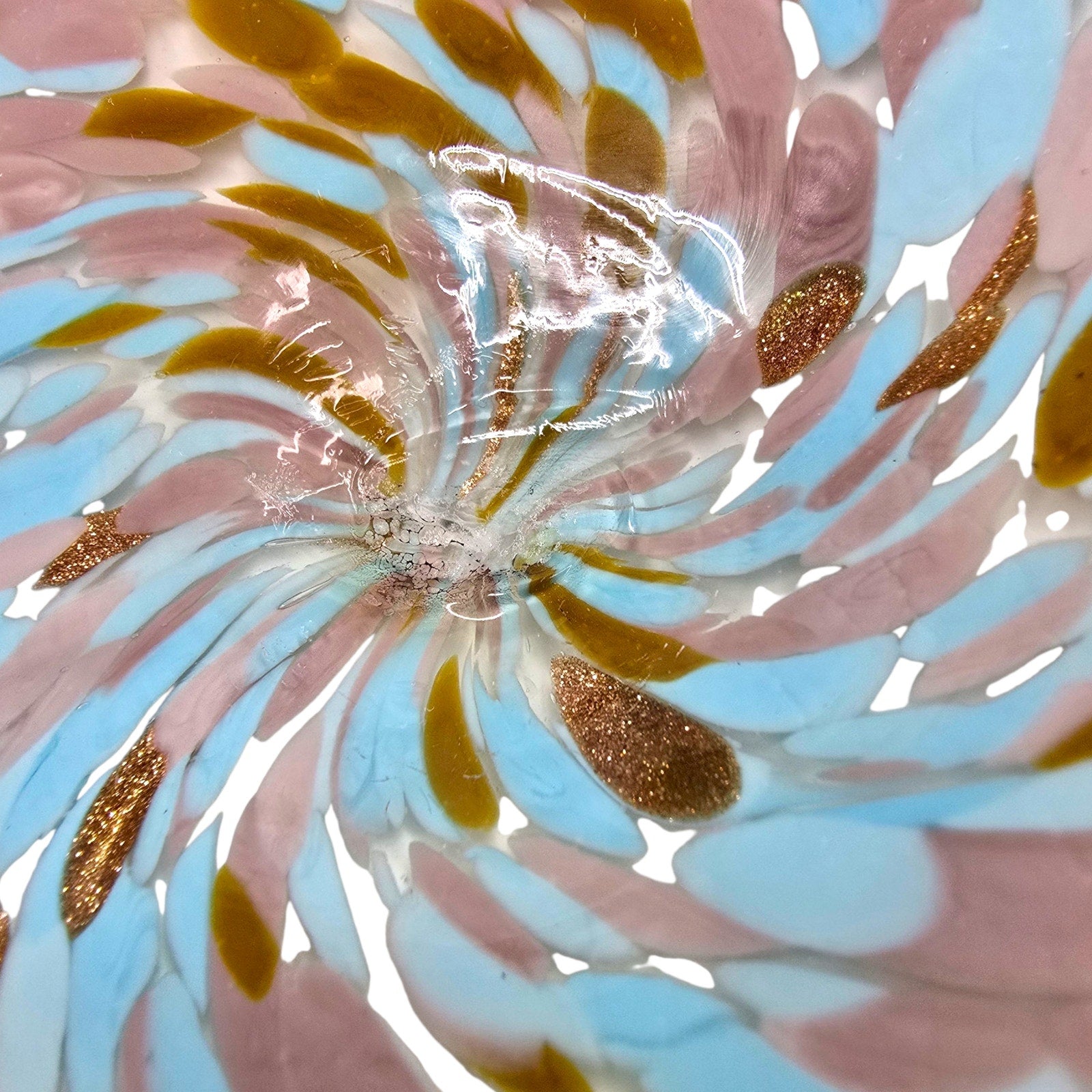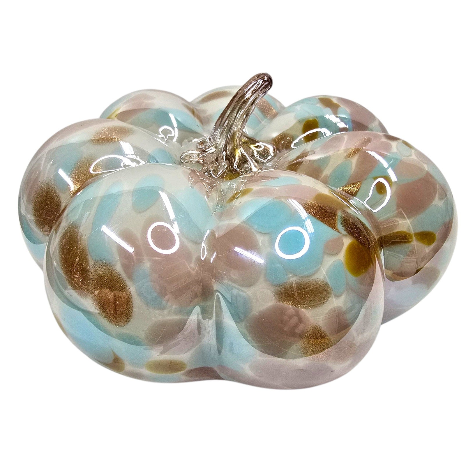 Hand-blown glass pumpkin with soft lavender, blue, accented by sparkling copper aventurine and gold flecks. Features a clear glass stem and smooth glossy finish. A beautiful artisan-made piece for fall, harvest, or year-round glass art display.