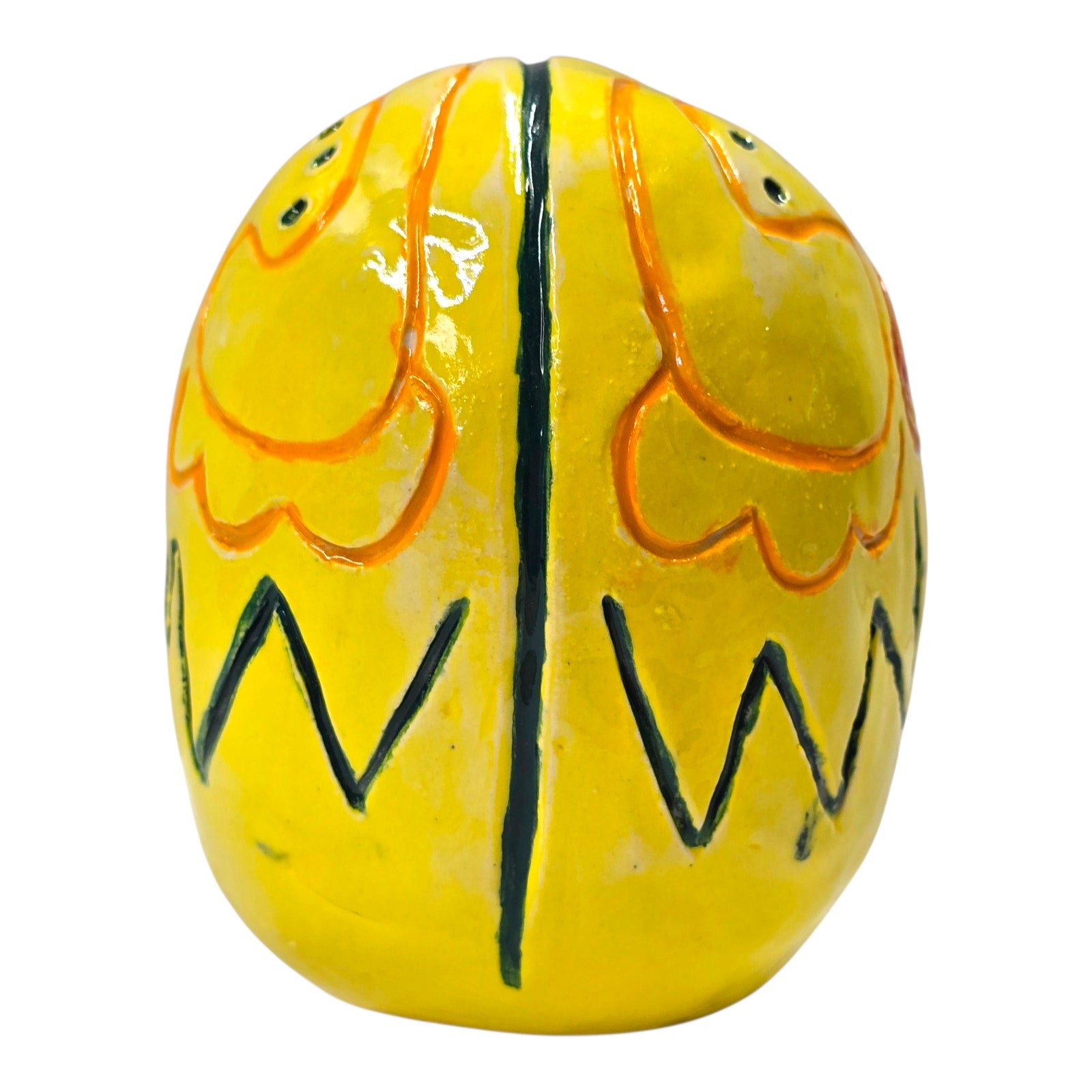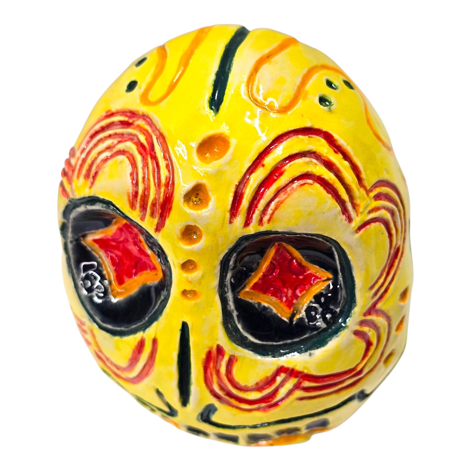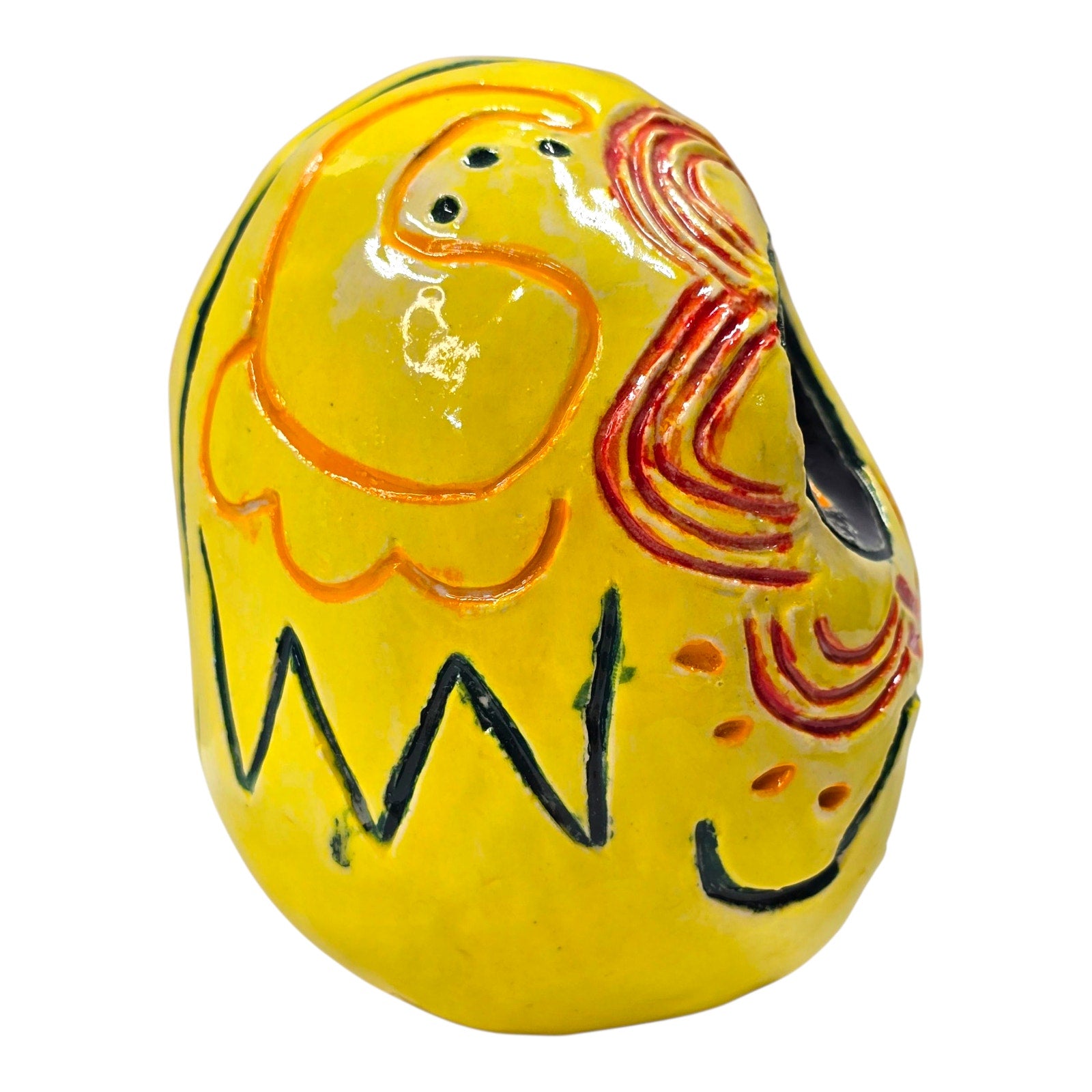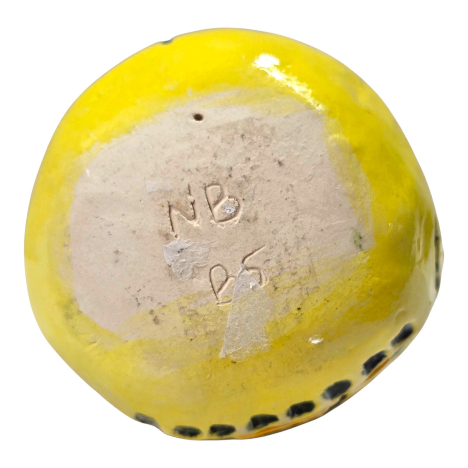 Bright yellow hand-painted ceramic skull with traditional floral/scroll details. Signed underside “NB P5.”