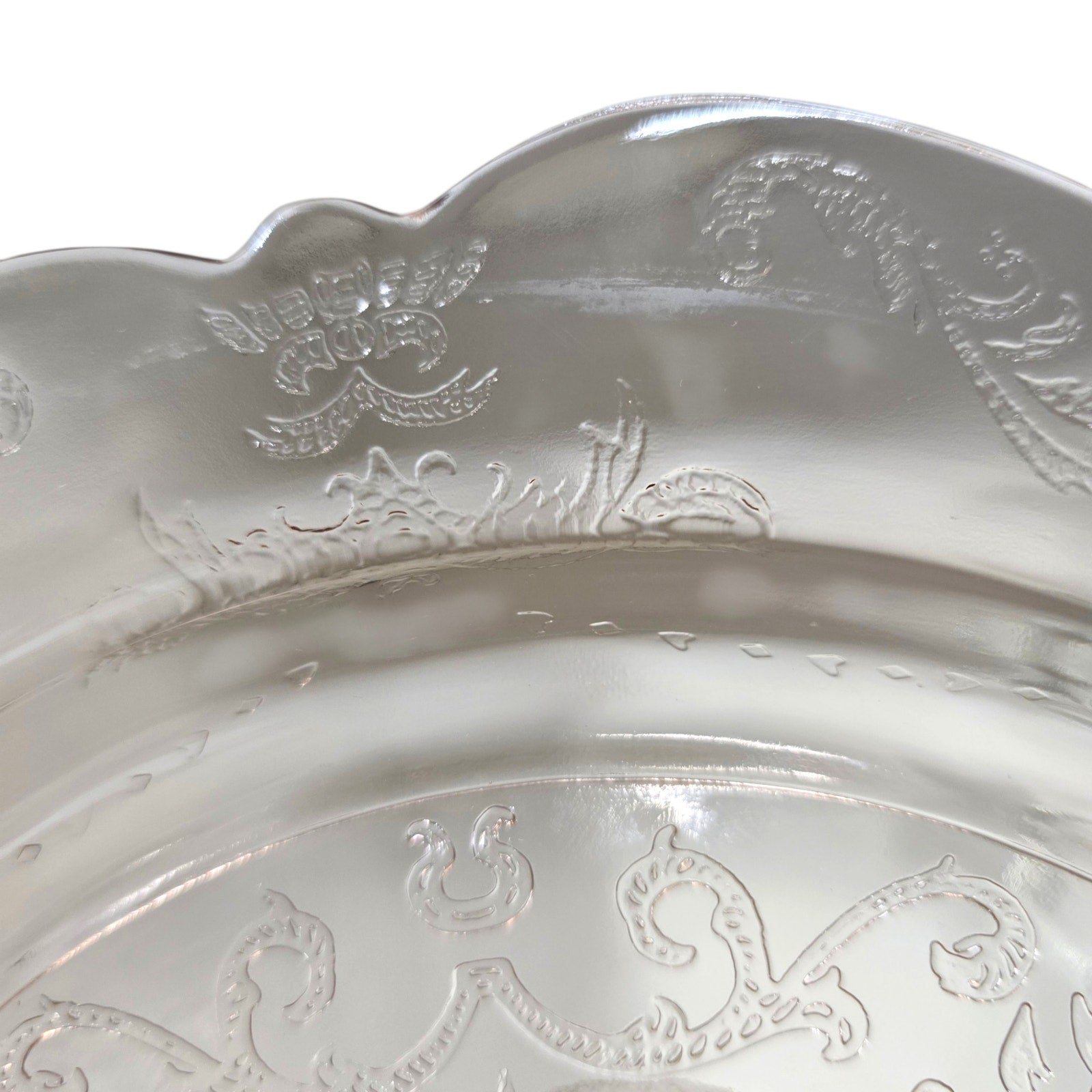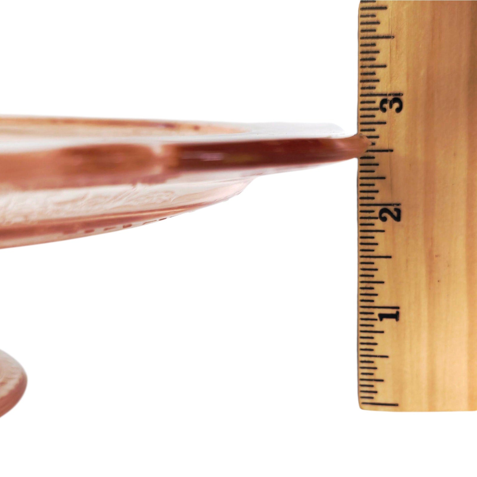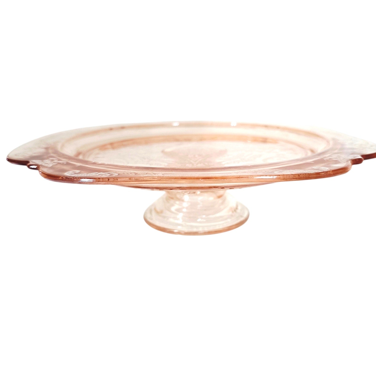 This is a beautiful vintage-style pedestal cake stand from the Indiana Glass "Recollection" line, featuring the classic Madrid pattern. This piece showcases an elegant soft pink hue with an intricate embossed floral and geometric design synonymous with Depression-era glass. It measures approximately 10.25" in diameter and stands 2.75" tall, making it a perfect centerpiece for serving or display. Would also be beautiful as a vanity piece.