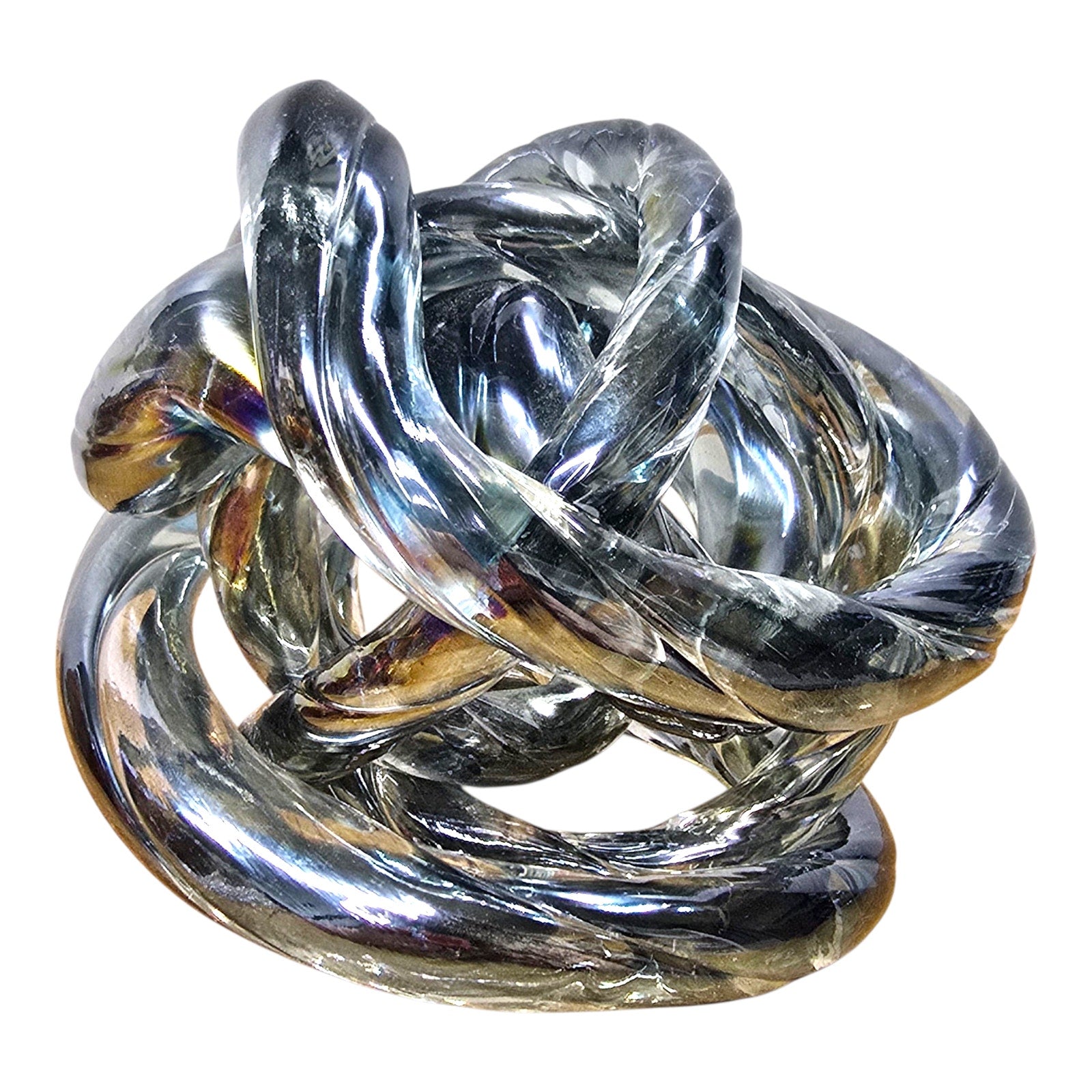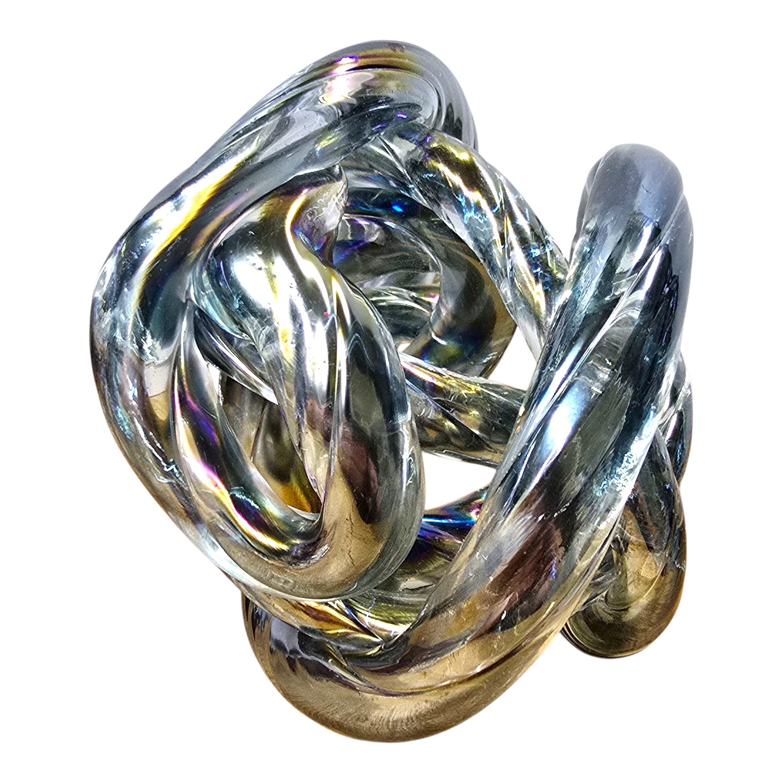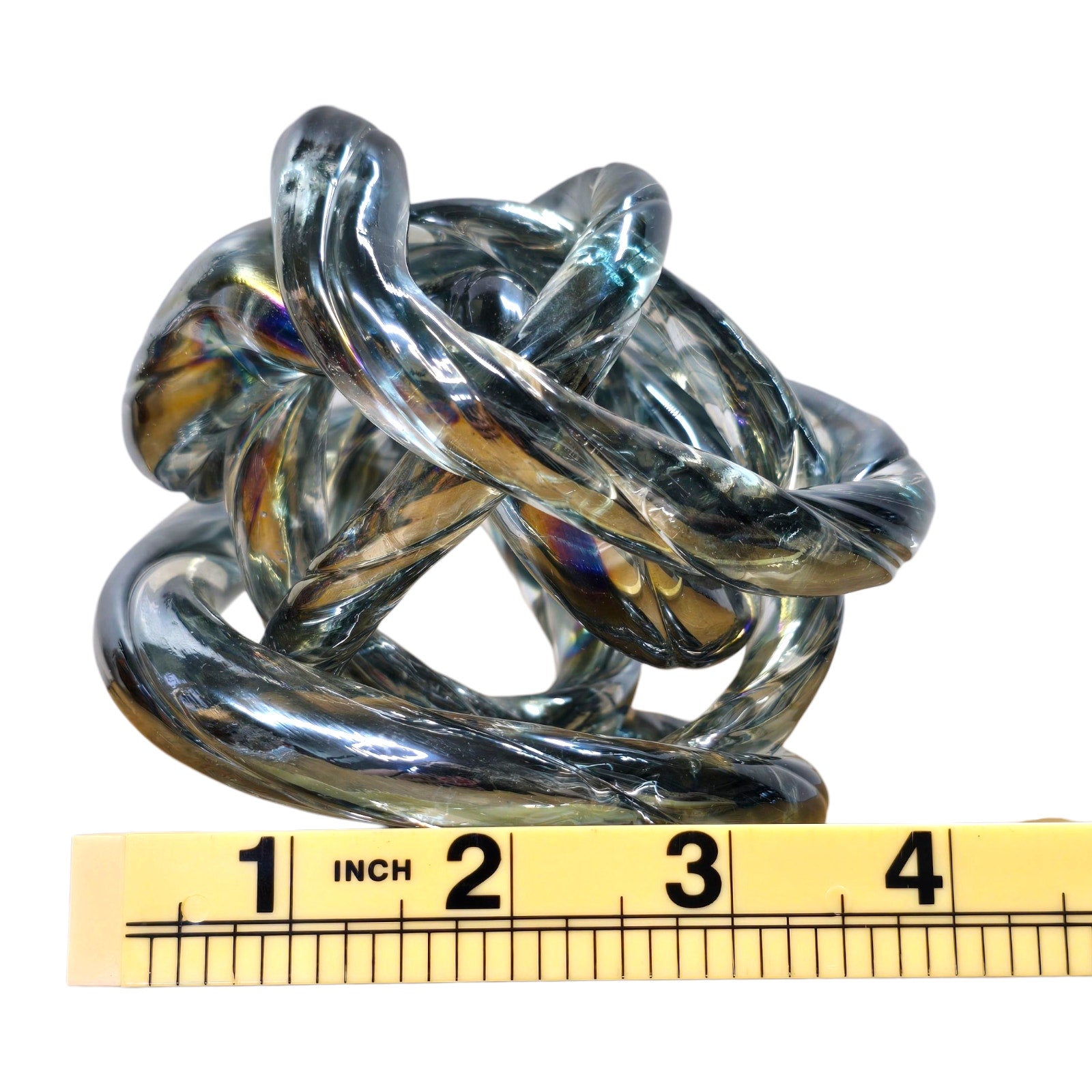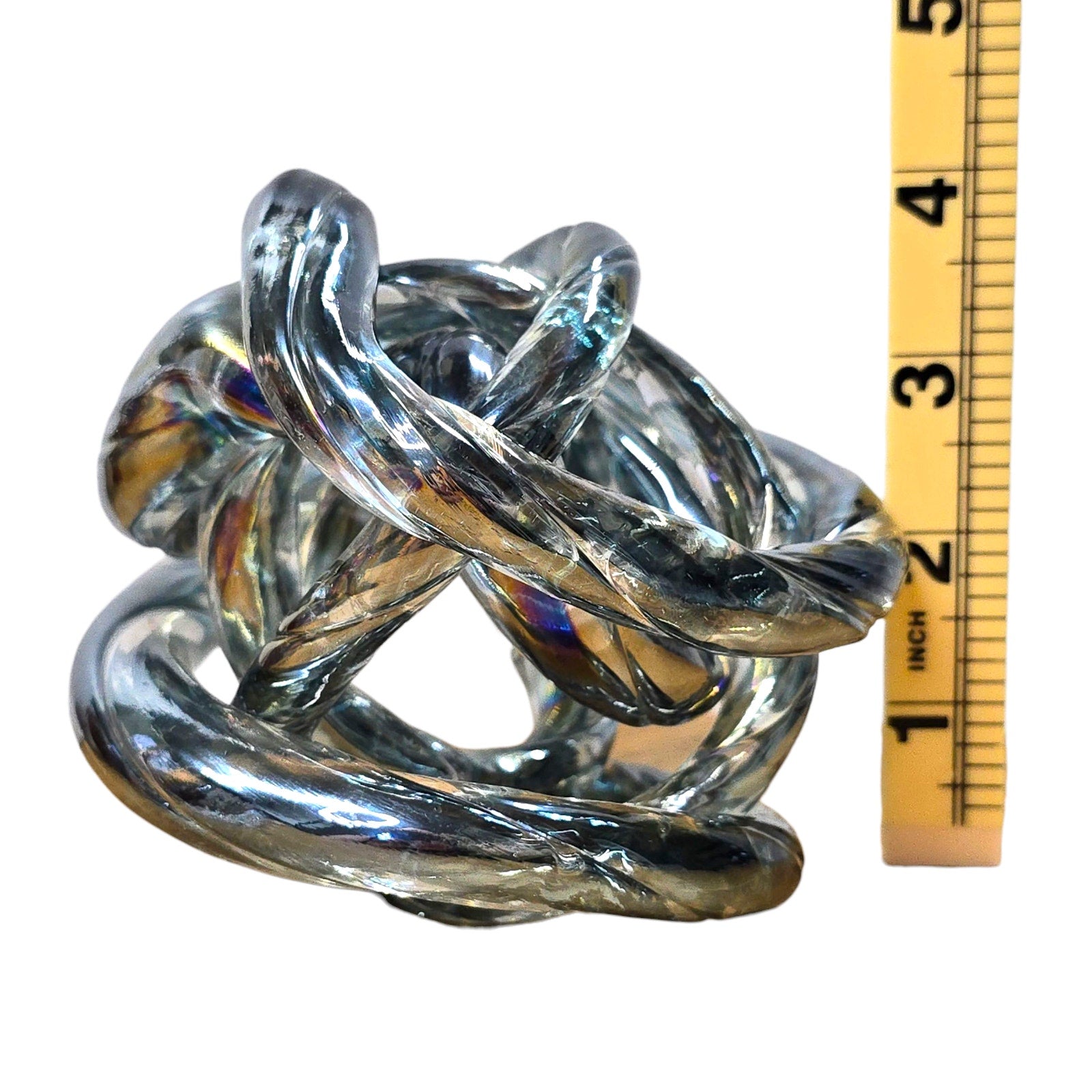A striking vintage iridescent glass infinity knot sculpture featuring twisted, looping strands of hand-formed glass. The design reflects light beautifully, with shimmering tones of silver, smoky gray, and subtle gold highlights. Perfect as a standalone statement piece or as part of a modern, coastal, or eclectic décor arrangement.