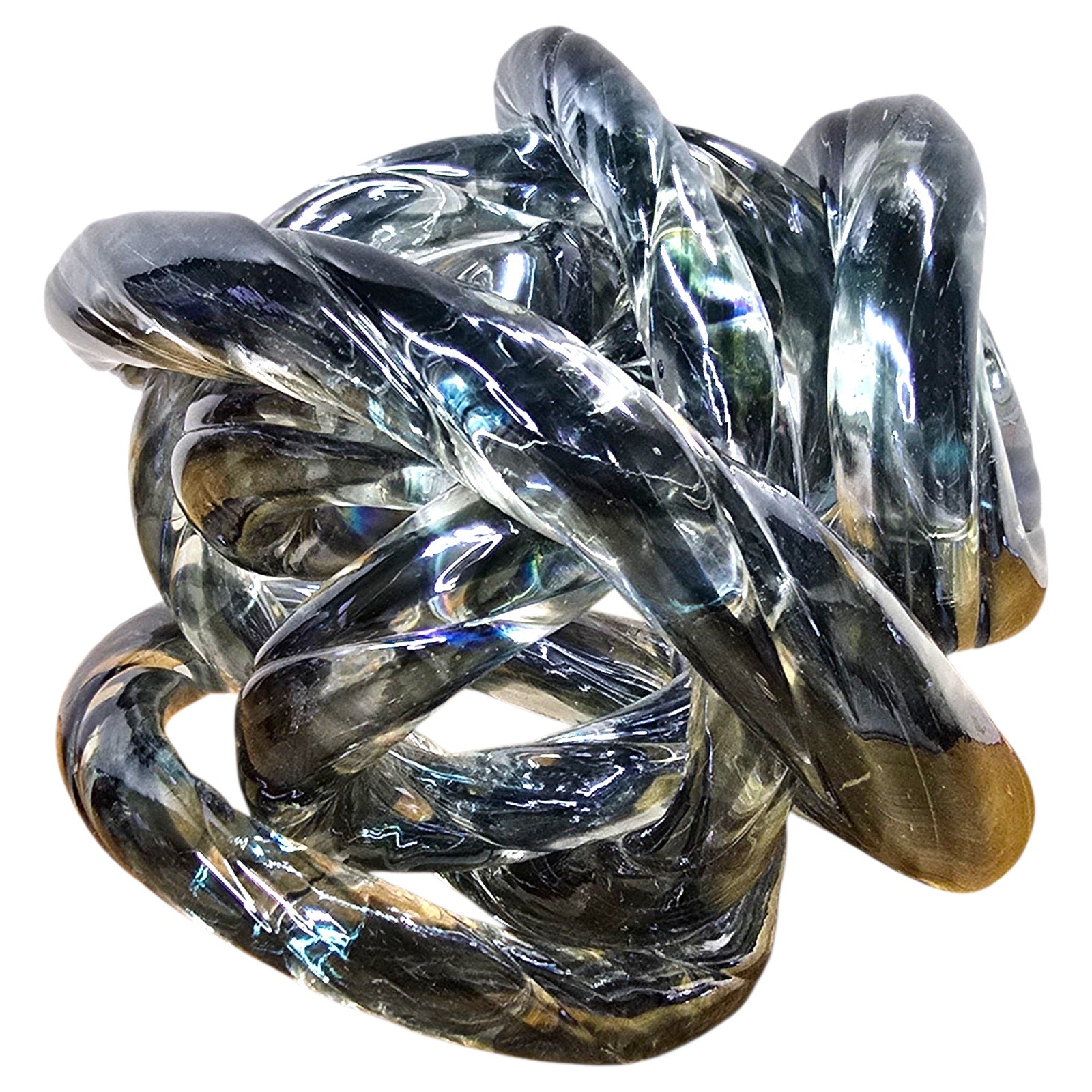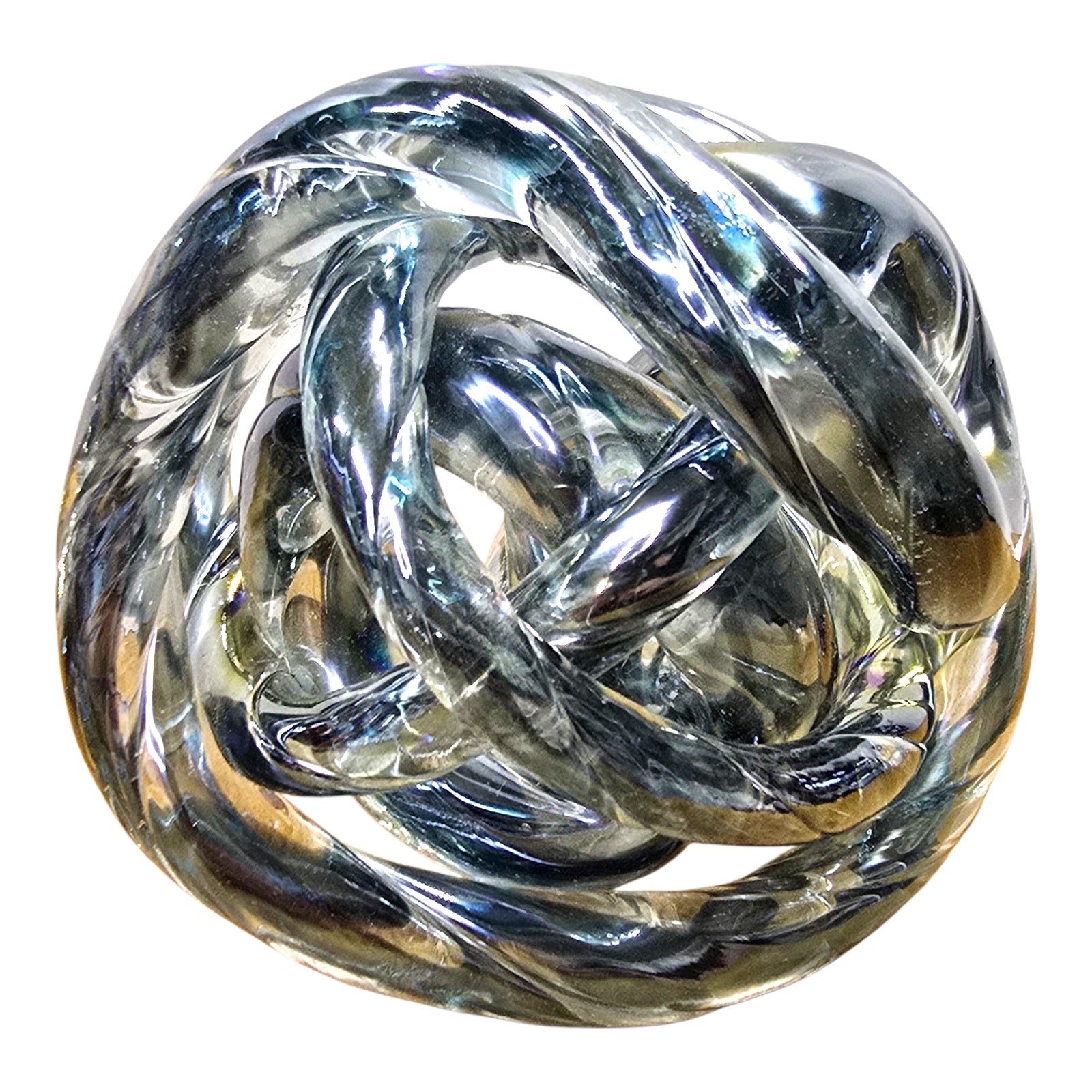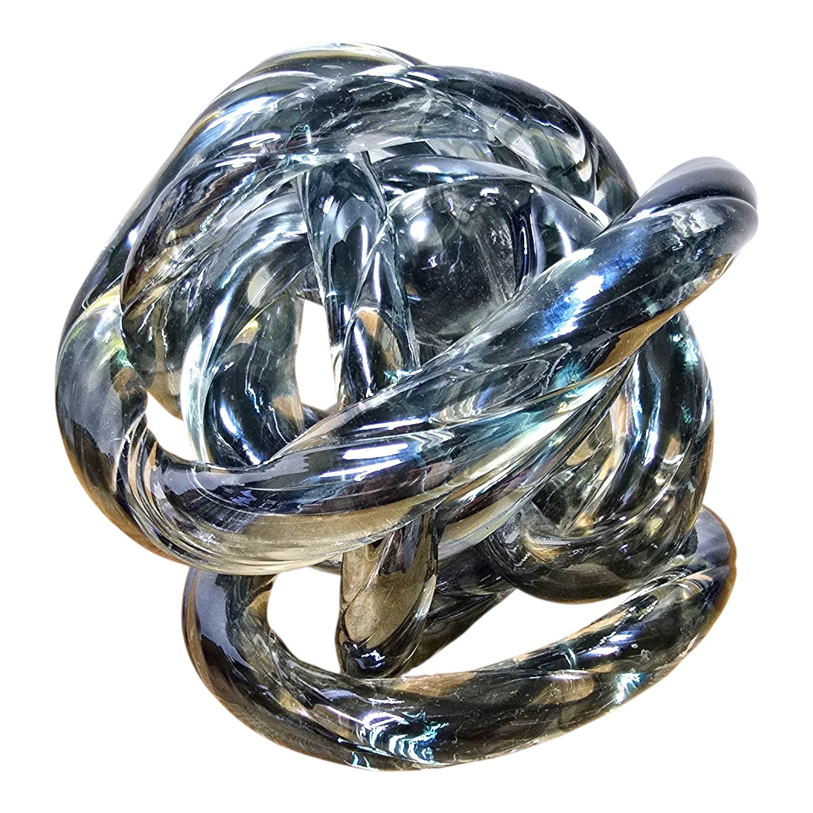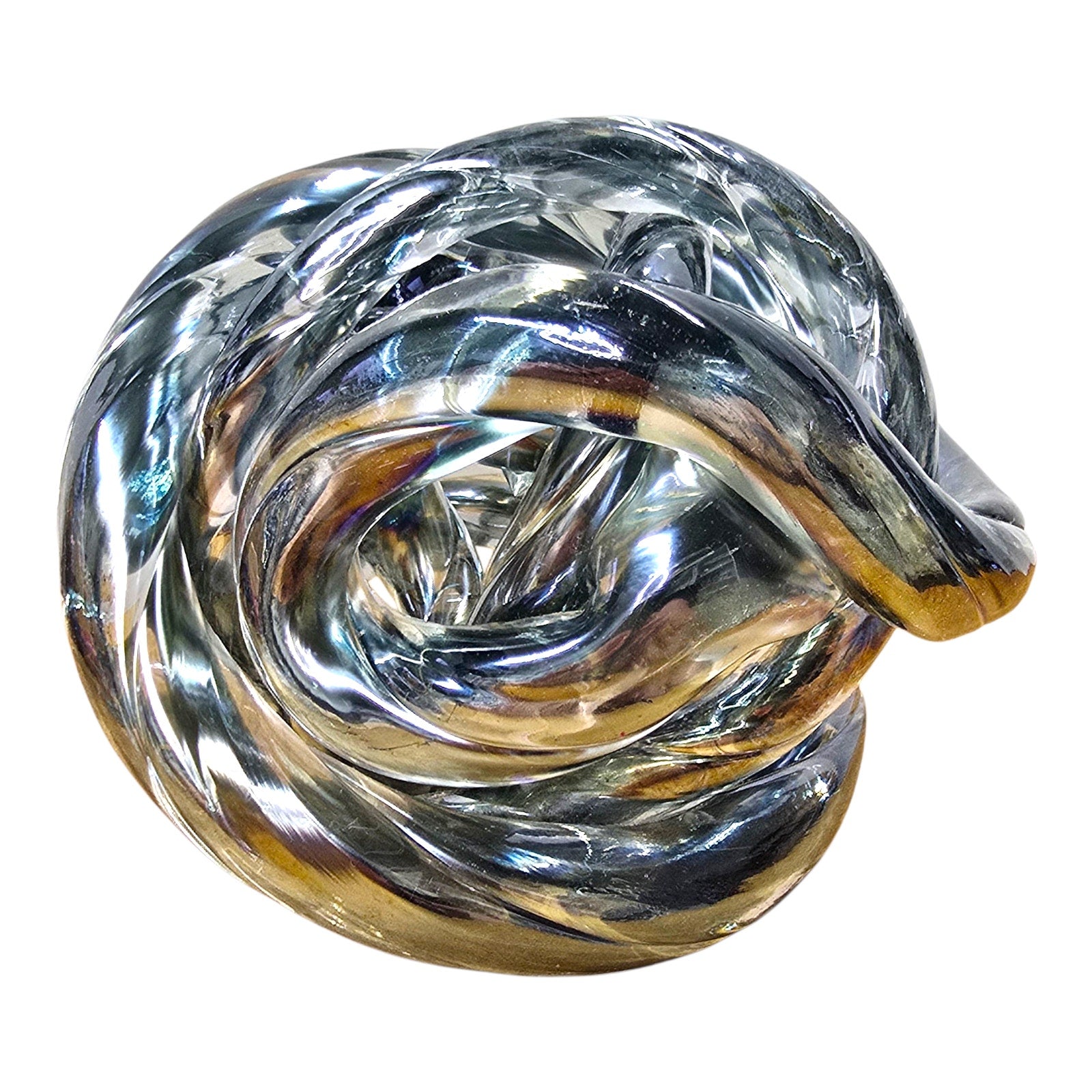 A striking vintage iridescent glass infinity knot sculpture featuring twisted, looping strands of hand-formed glass. The design reflects light beautifully, with shimmering tones of silver, smoky gray, and subtle gold highlights. Perfect as a standalone statement piece or as part of a modern, coastal, or eclectic décor arrangement.