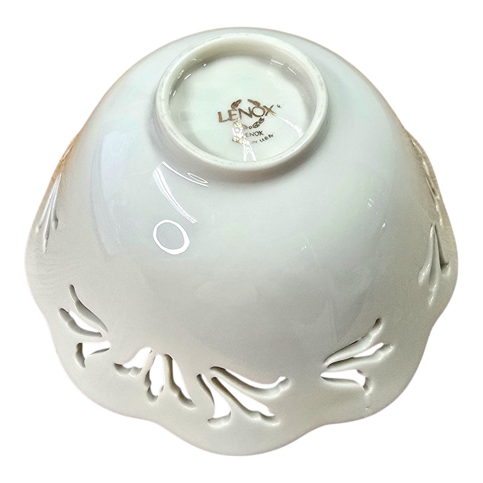 Lenox ivory china pierced lace bowl with scalloped rim and gold trim. Decorative cutout design with embossed floral motif. Measures approx. 6" diameter x 3" high. Perfect as a display or accent bowl.