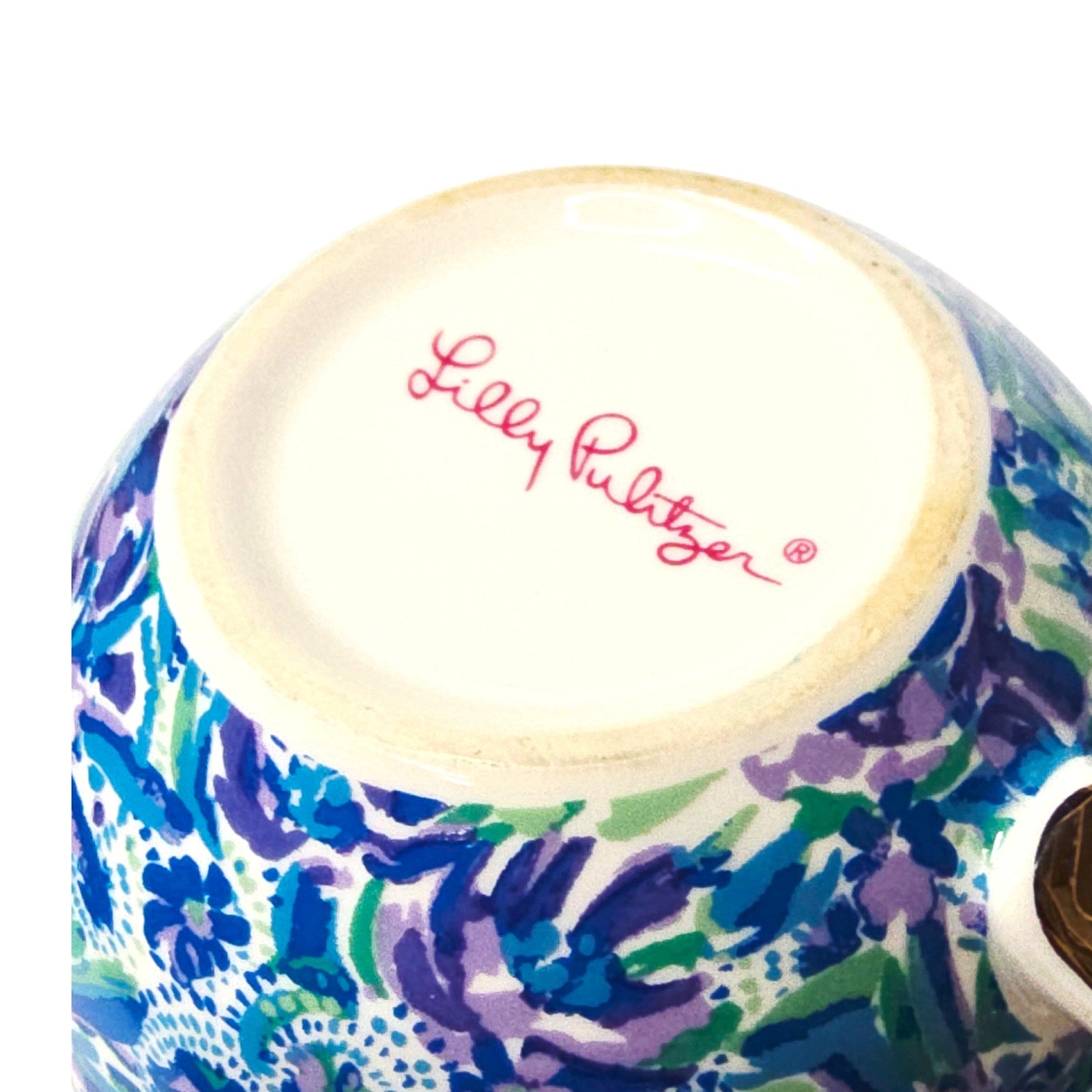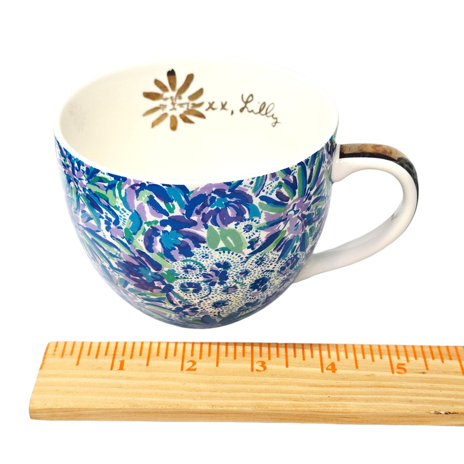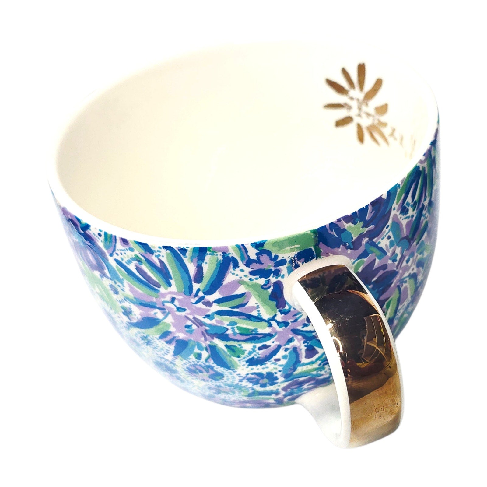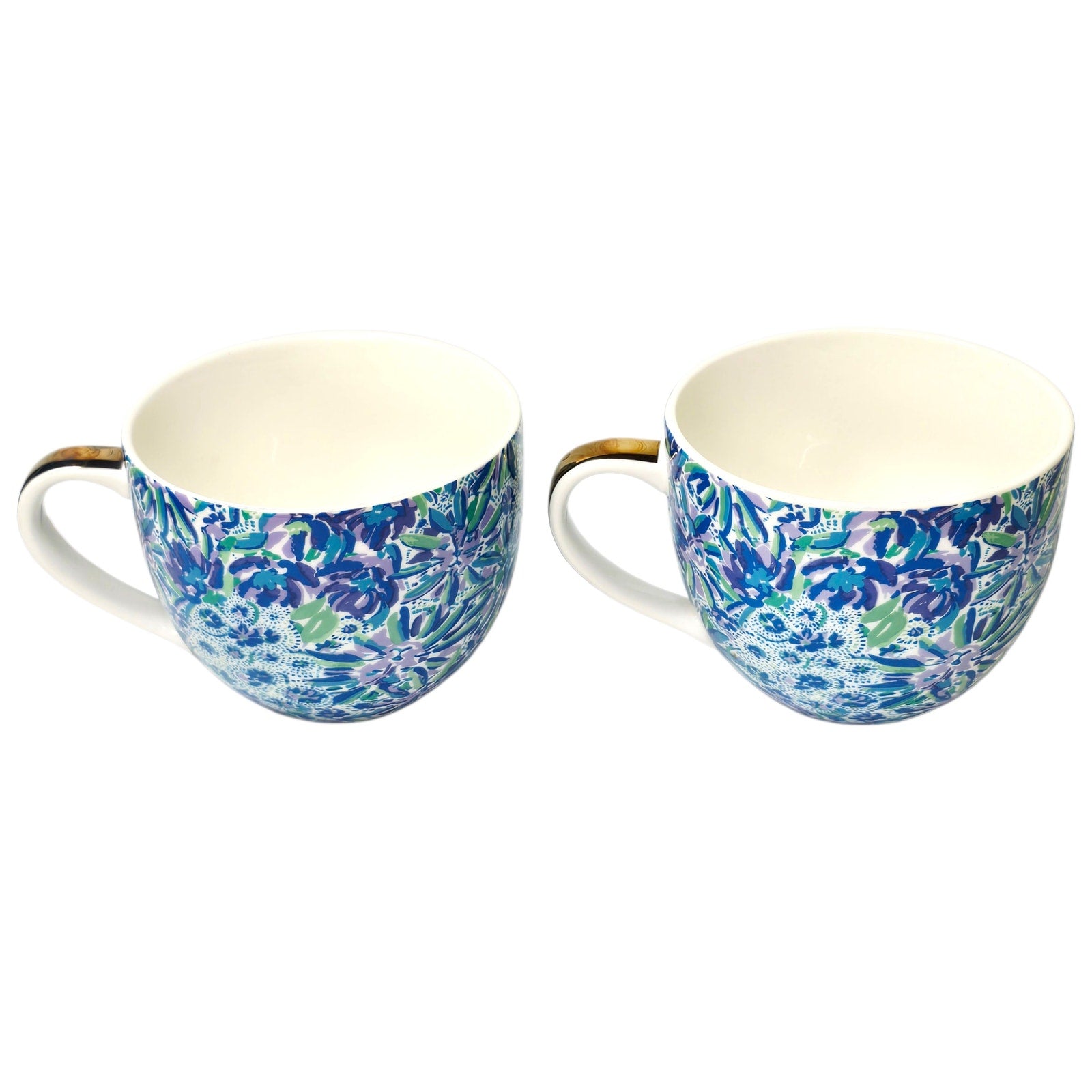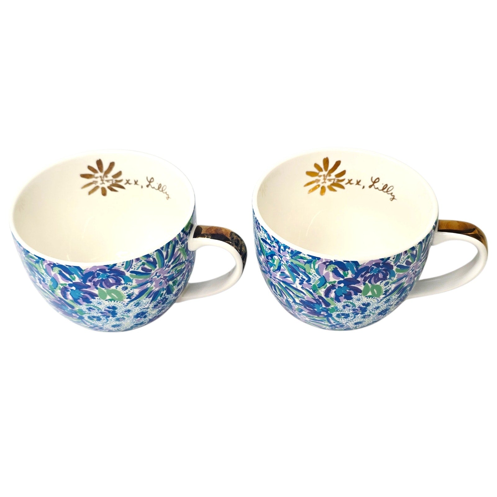 Lilly Pulitzer Coffee Mugs Set Blue Floral Gold Handle XX Lilly Hidden Animal