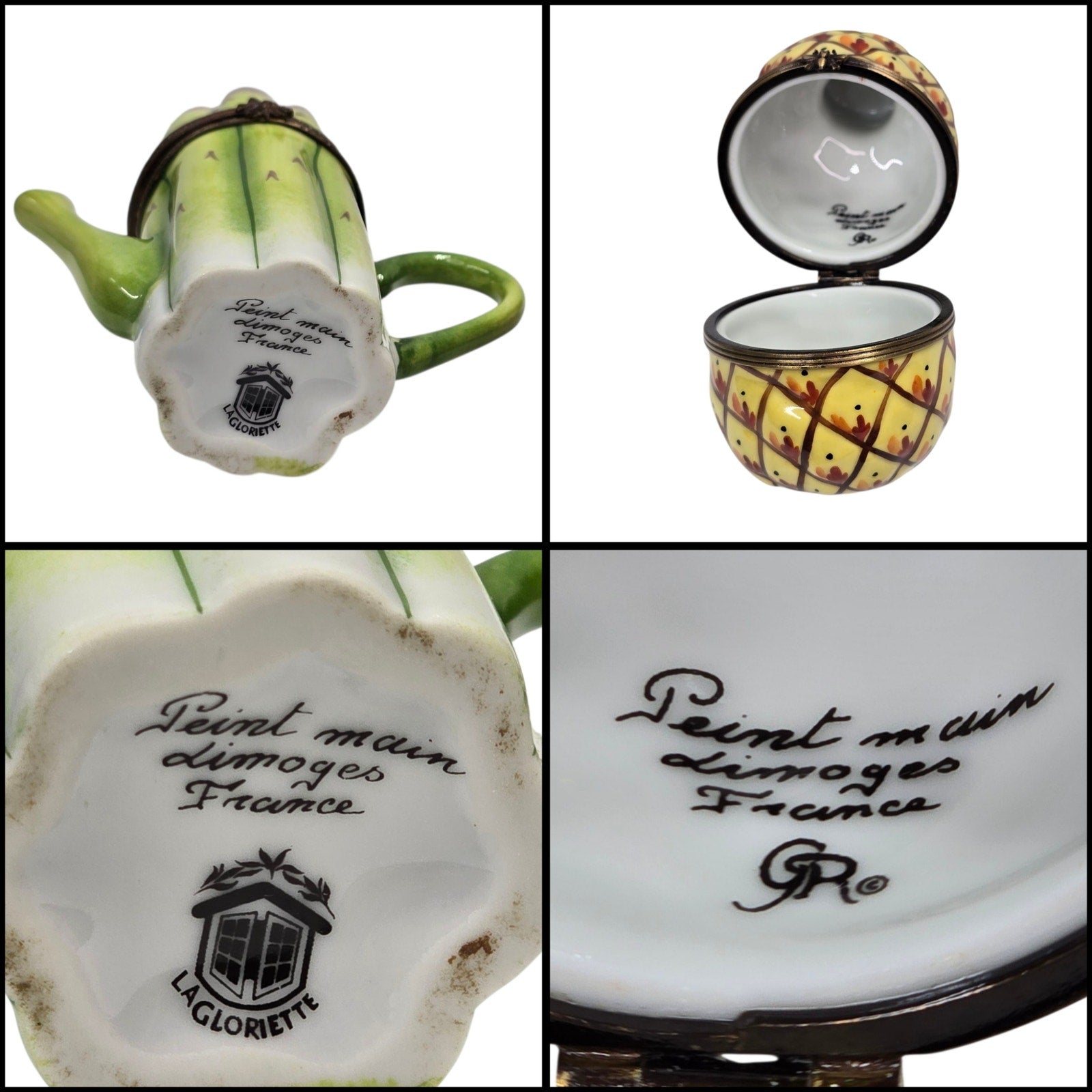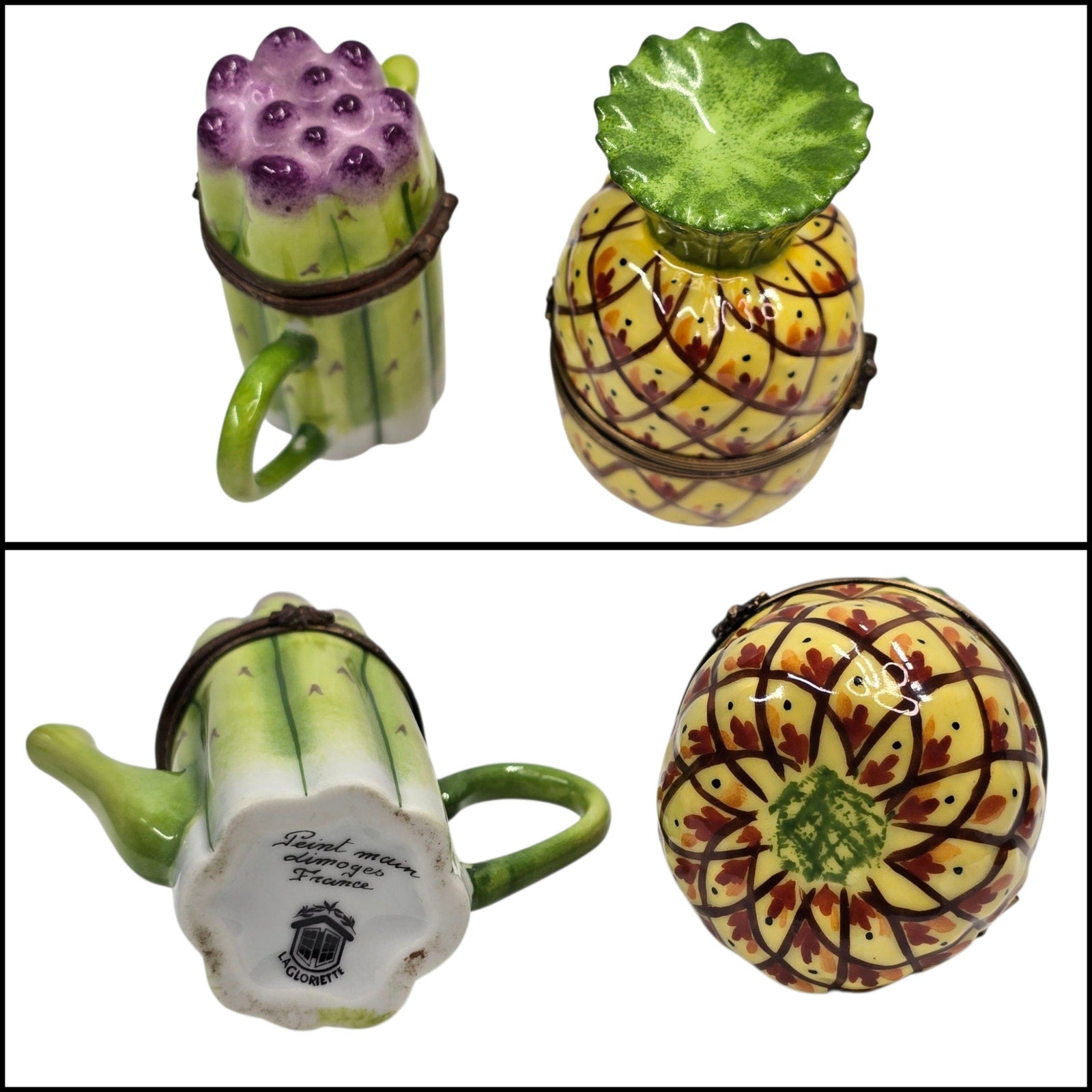 Exceptional set of two authentic hand-painted Limoges porcelain trinket boxes from France. Includes one Pineapple box marked “Peint main Limoges France GR®,” attributed to Gérard Ribierre for Atelier de Limoges, and one Asparagus teapot-form box marked “Peint main Limoges France – La Gloriette.”