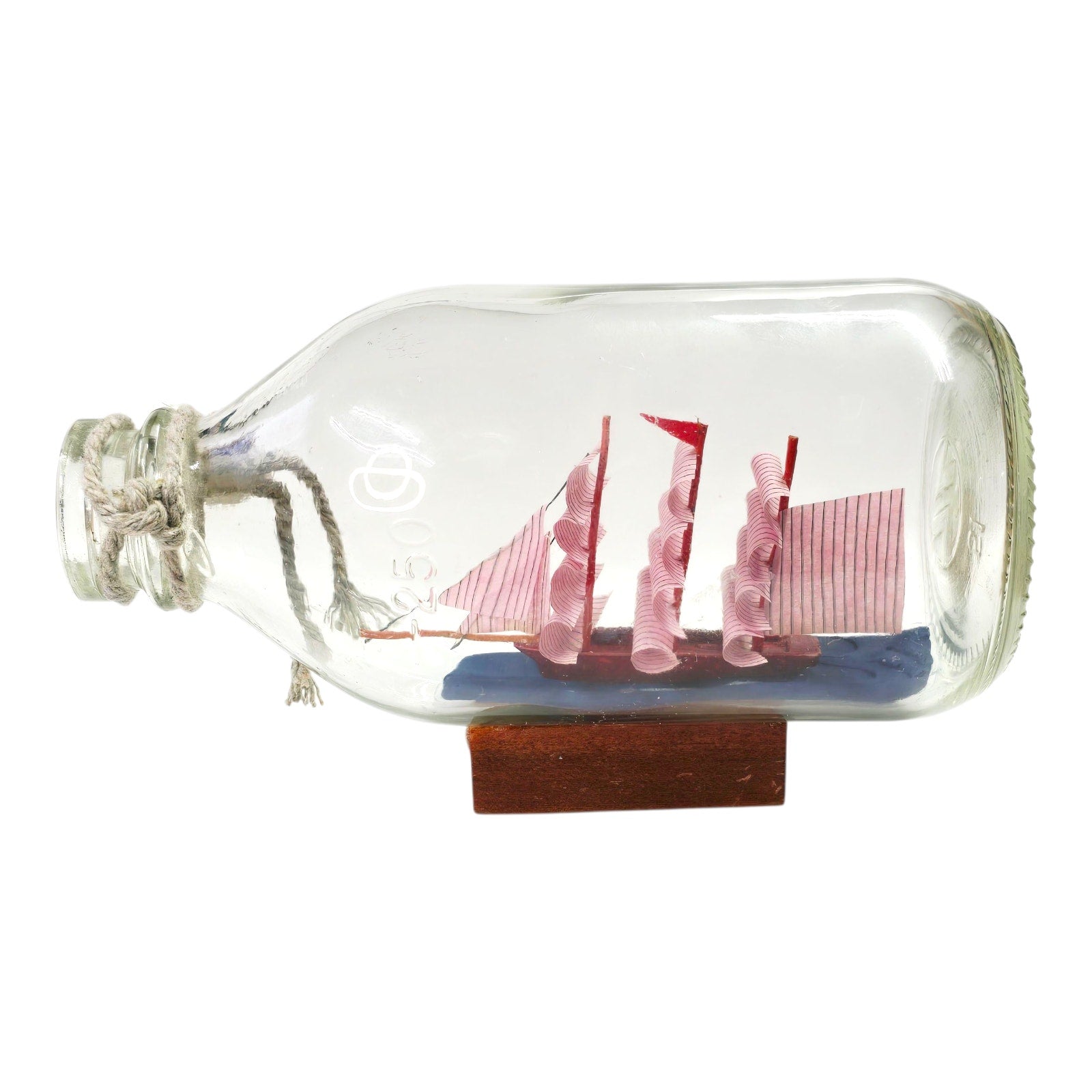 Lot of 2 handcrafted nautical miniatures in glass containers. One is a 3-mast sailboat with red sails in a 5.25" bottle on wood stand. The other is a house and dock scene with yellow sailboat in a 3.5" lidded jar. Decorative maritime collectibles for display or gift.