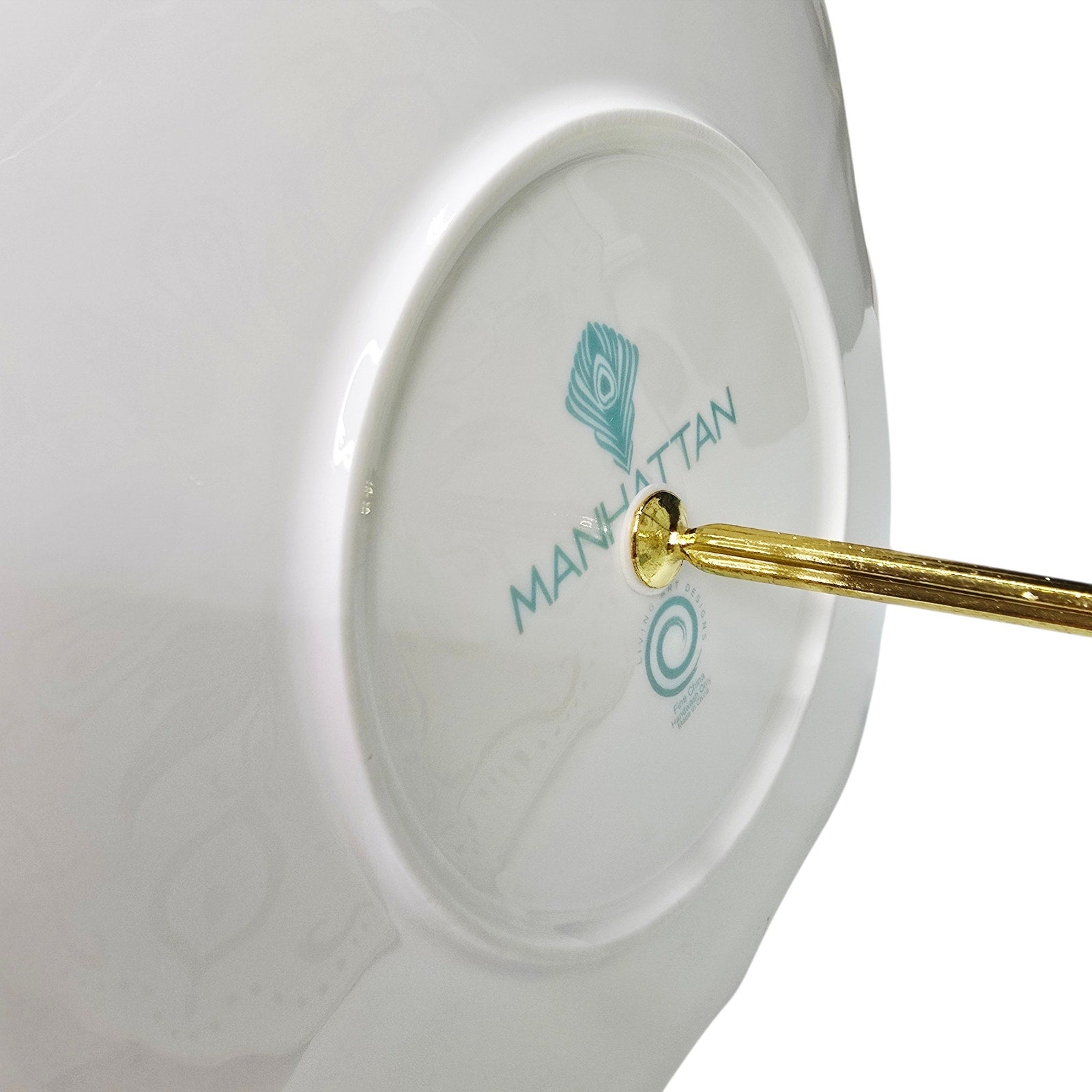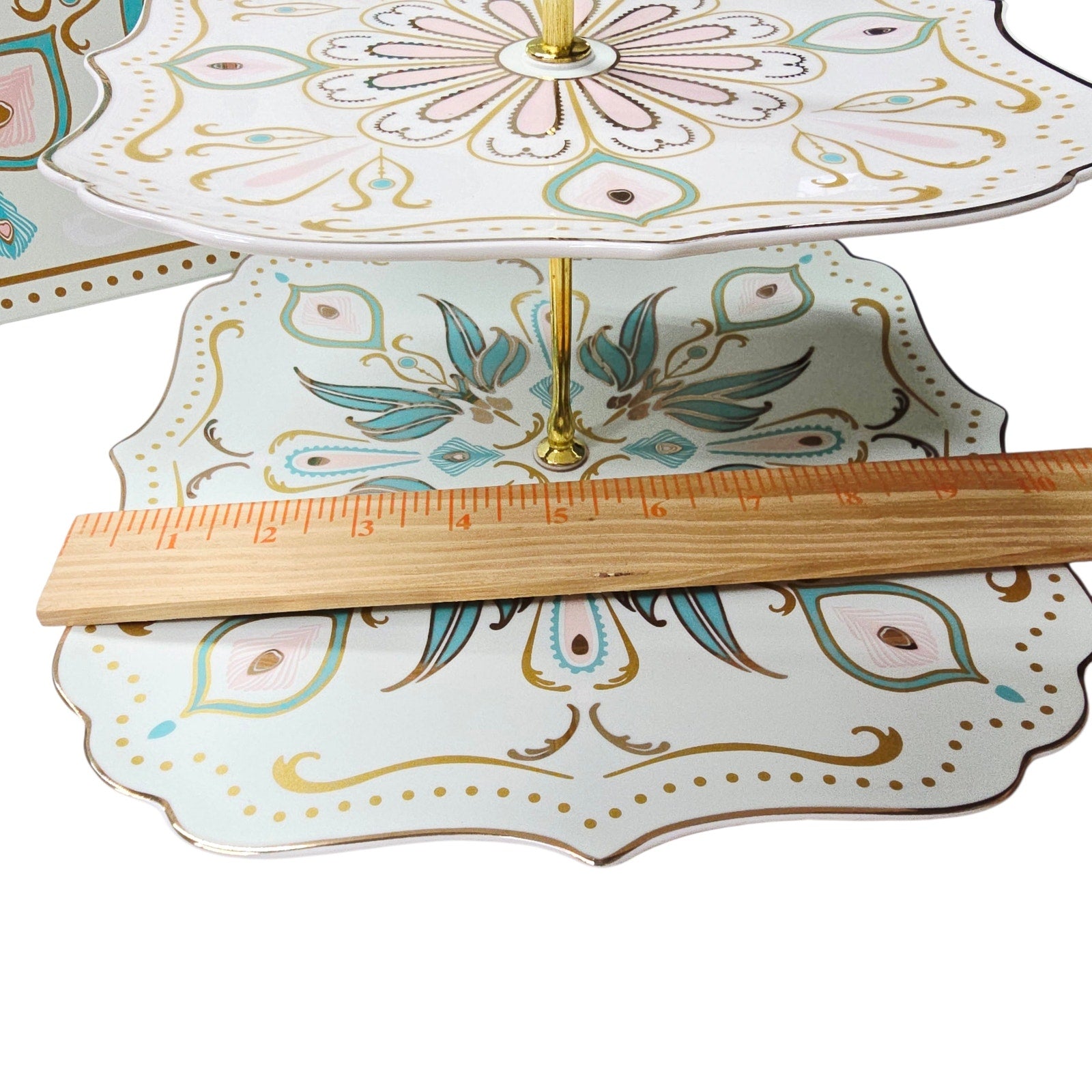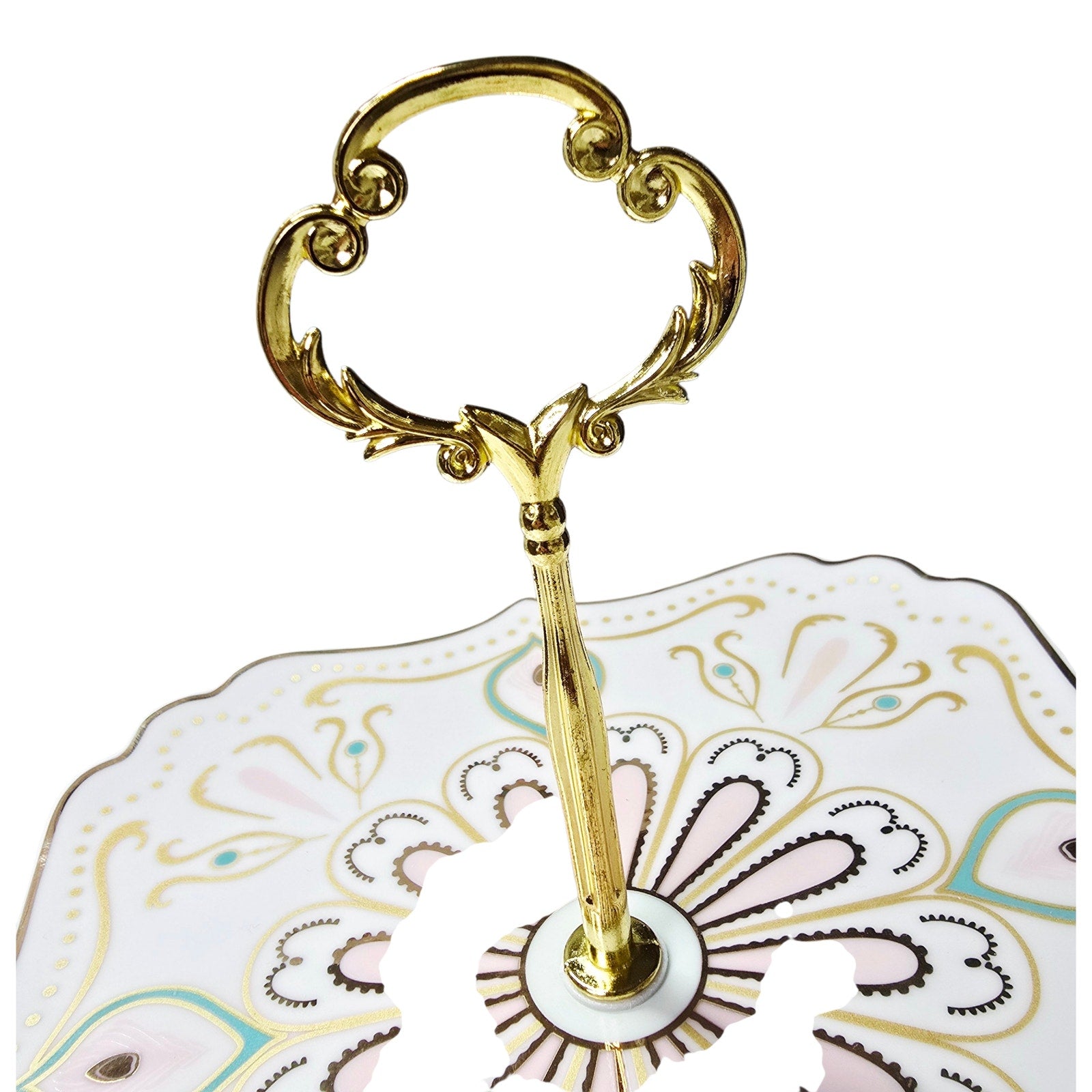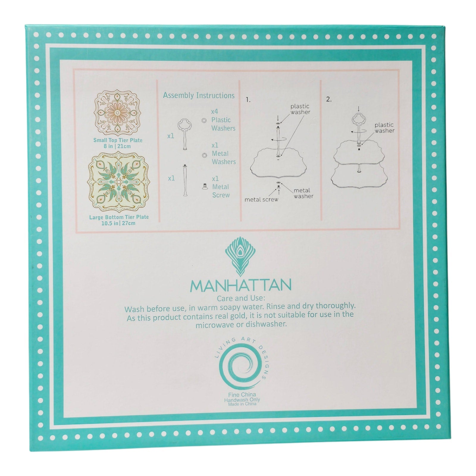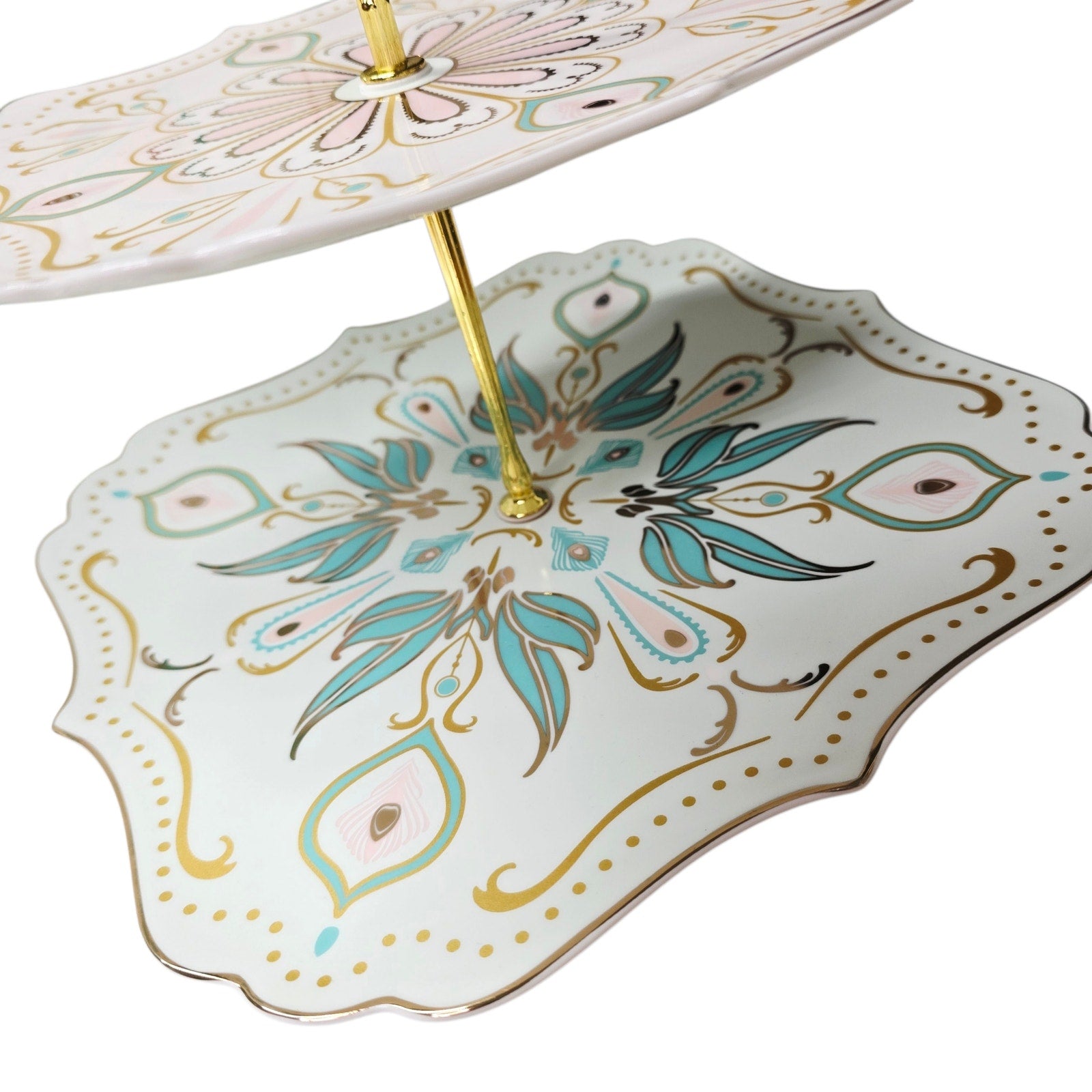 Two-tier porcelain dessert stand by Manhattan Living Designs. Fine china plates with gold trim and decorative motif, metal center rod with handle. Includes original box and assembly hardware. Hand wash only. Has Original Box. Easy Storage.
