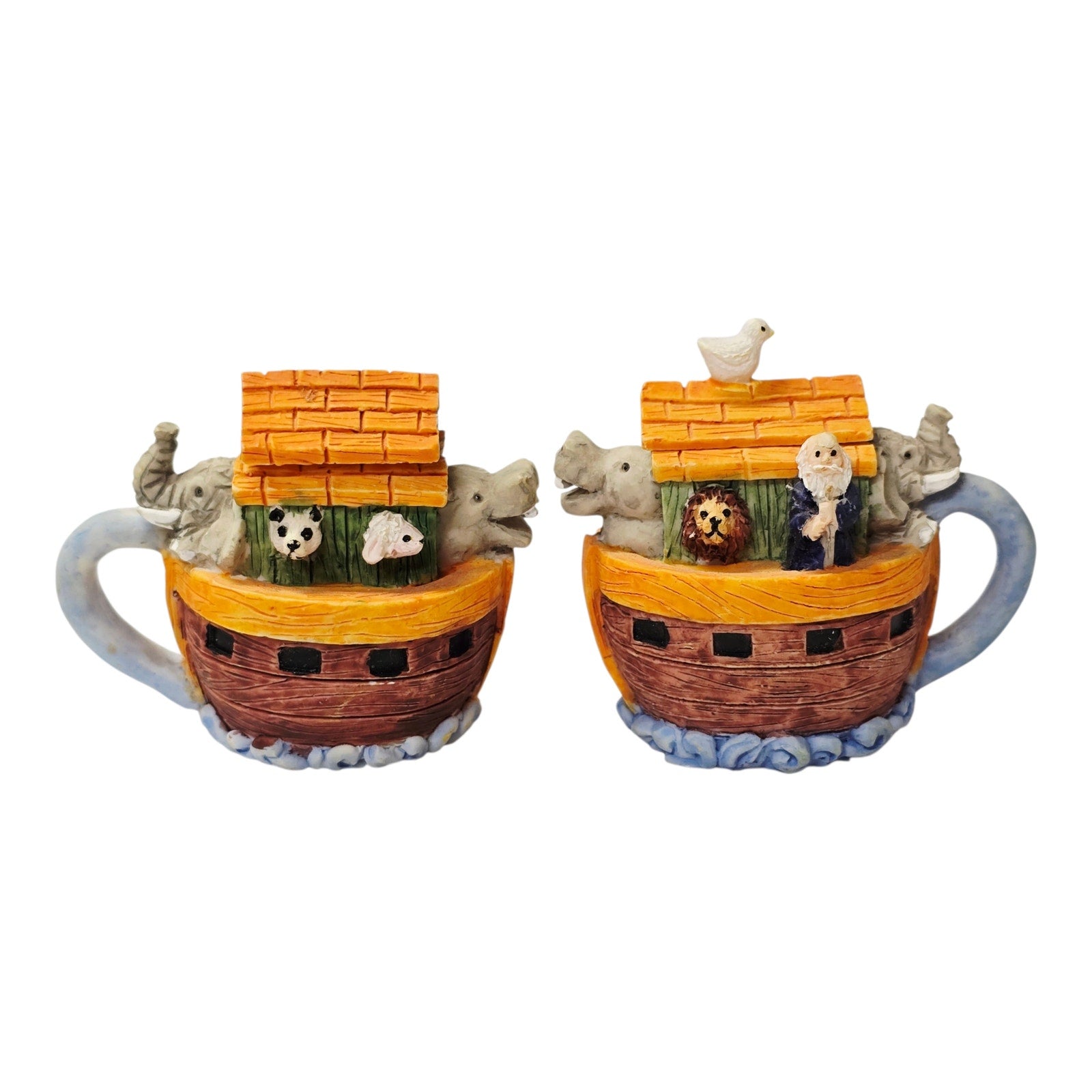 This is a 6-piece ceramic miniature play set featuring a Noah's Ark theme. Each piece is designed to resemble an ark and features hand-painted animal details, including Noah, a lion, hippo, elephant, sheep, and bear, etc.