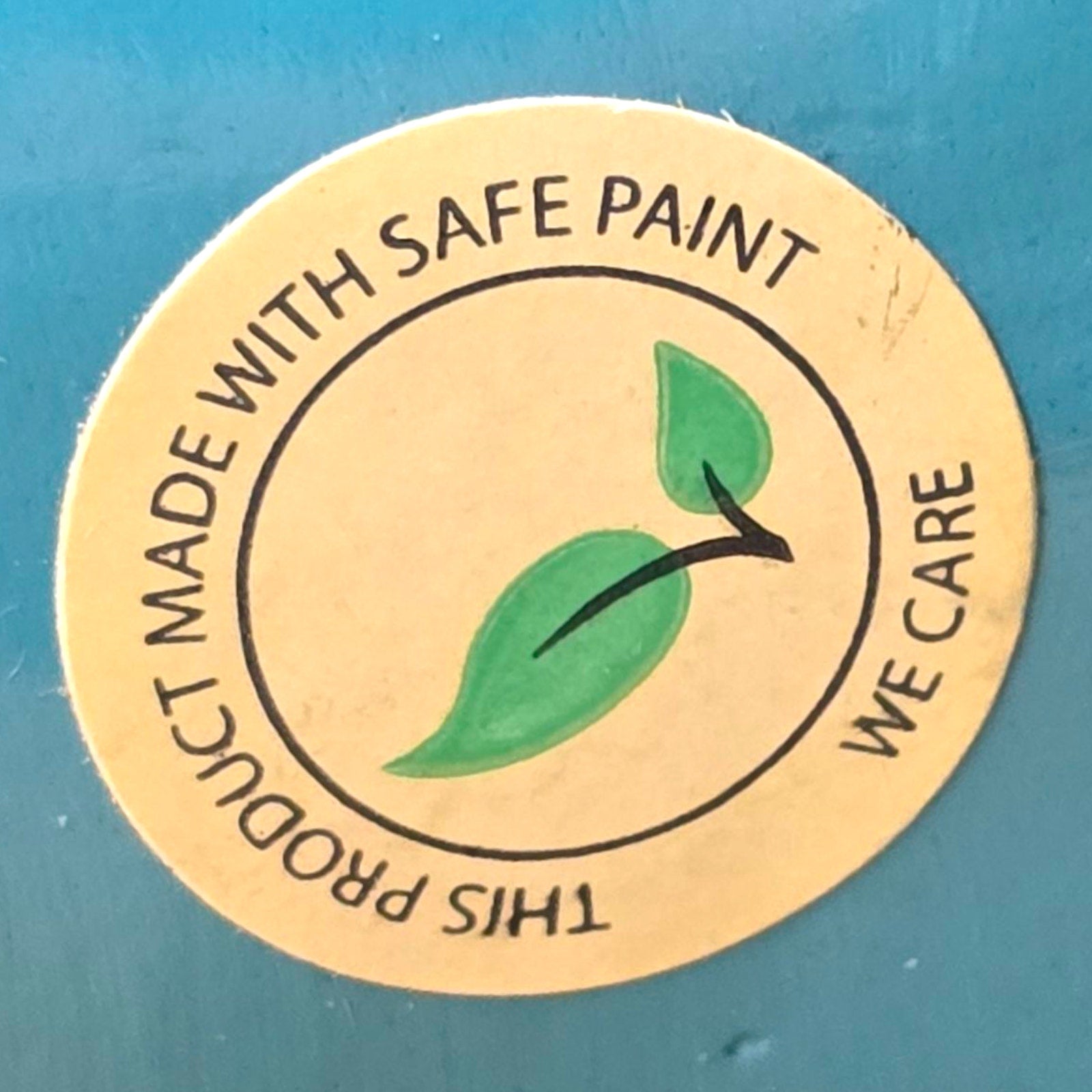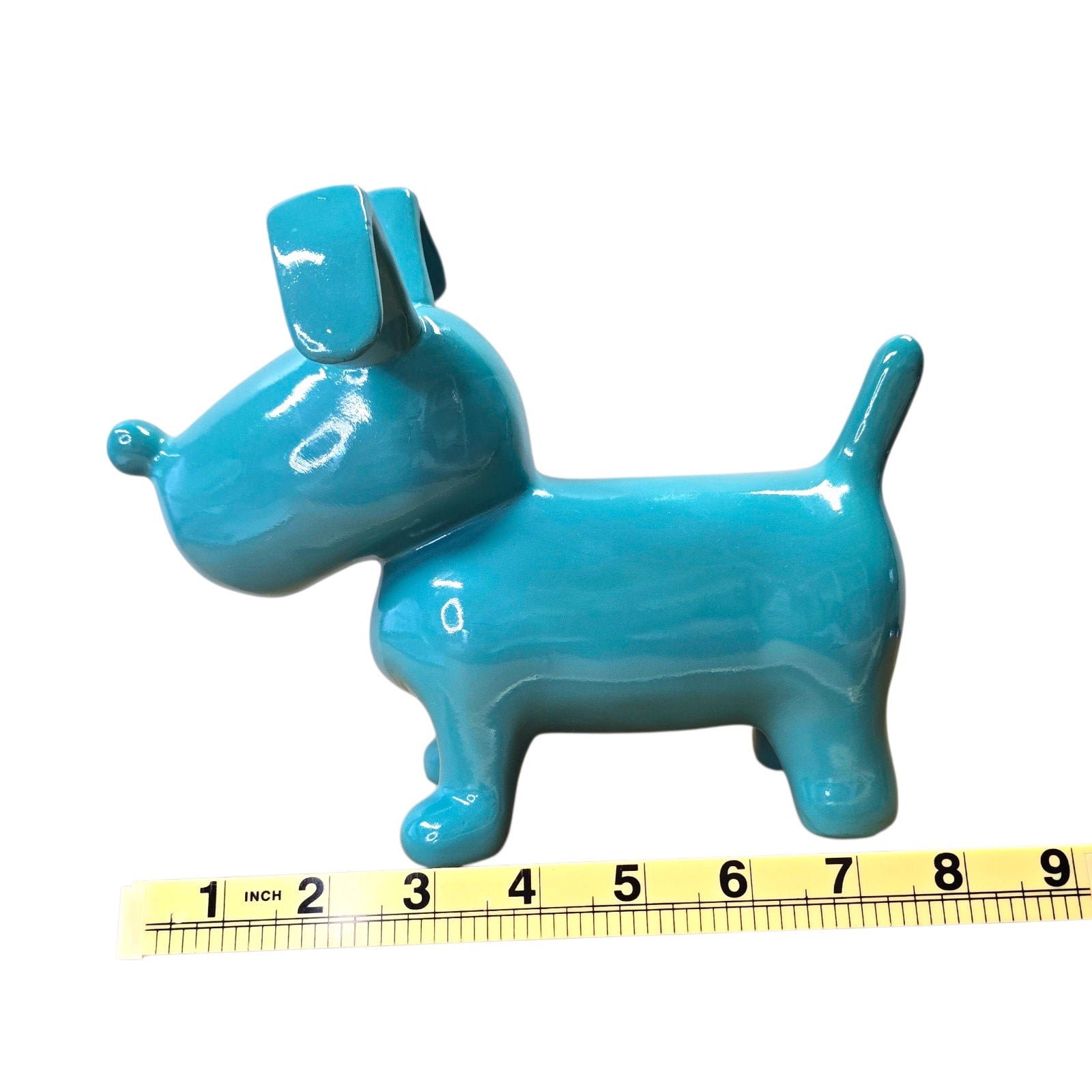 Contemporary ceramic dog figurine in glossy turquoise blue with a playful pop art design. Labeled as made with safe paint. Measures approx. 9" L x 7.25" H x 5.5" W (ear to ear). Great for shelf, office, or home décor accent.