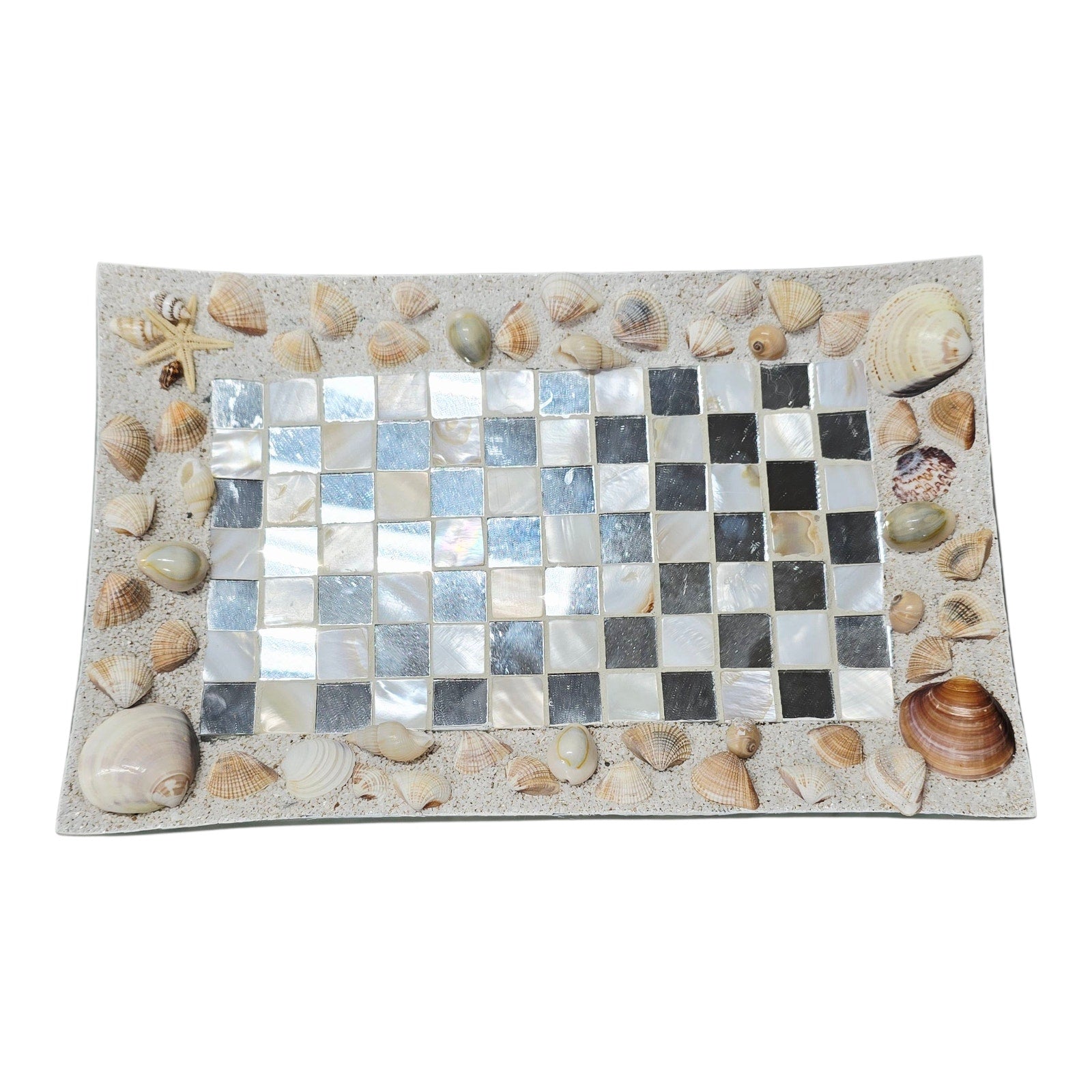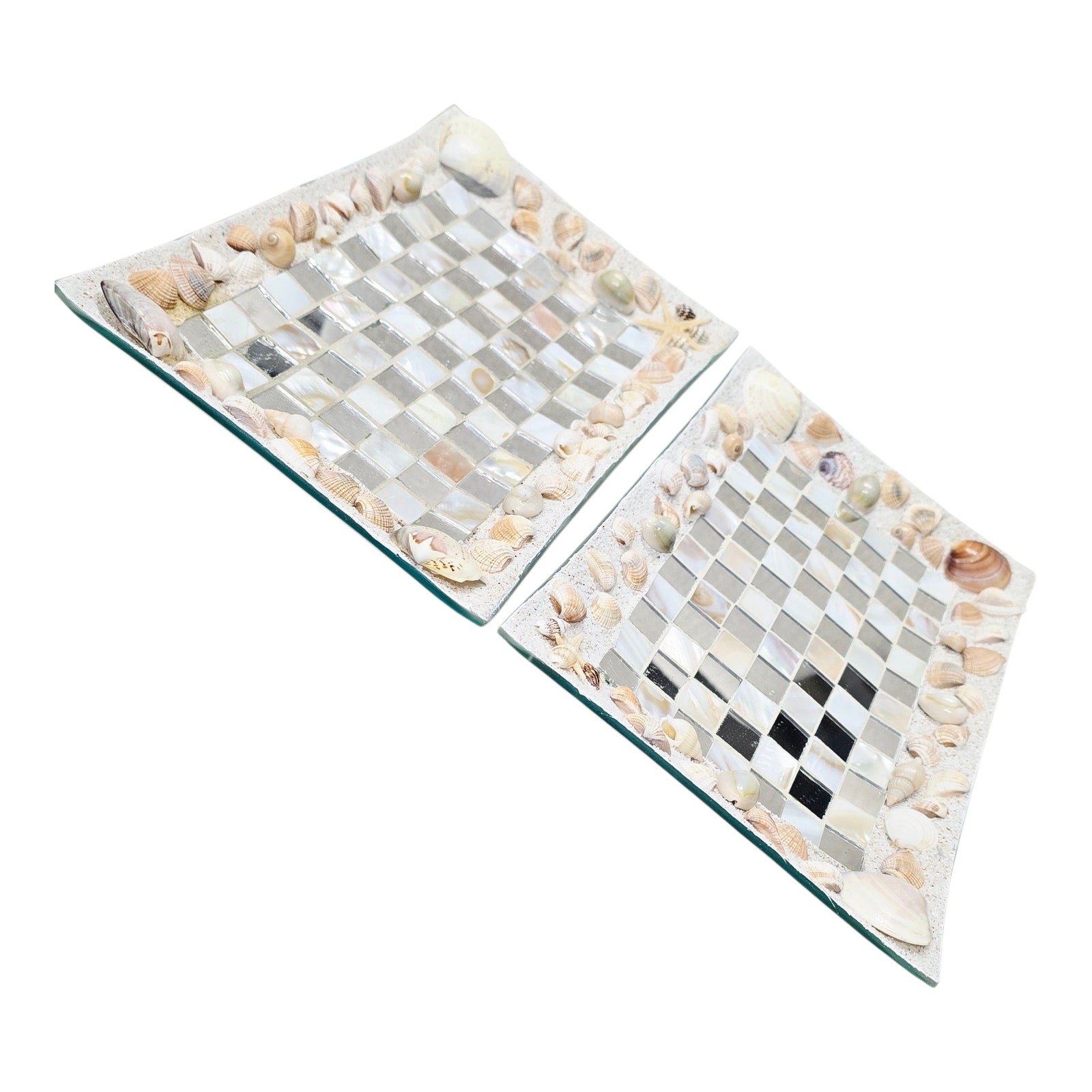 Set of 2 Decorative Glass Trays featuring shells and mother-of-pearl with mirrors mosaic Pattern, bordered by seashells and sand texturing