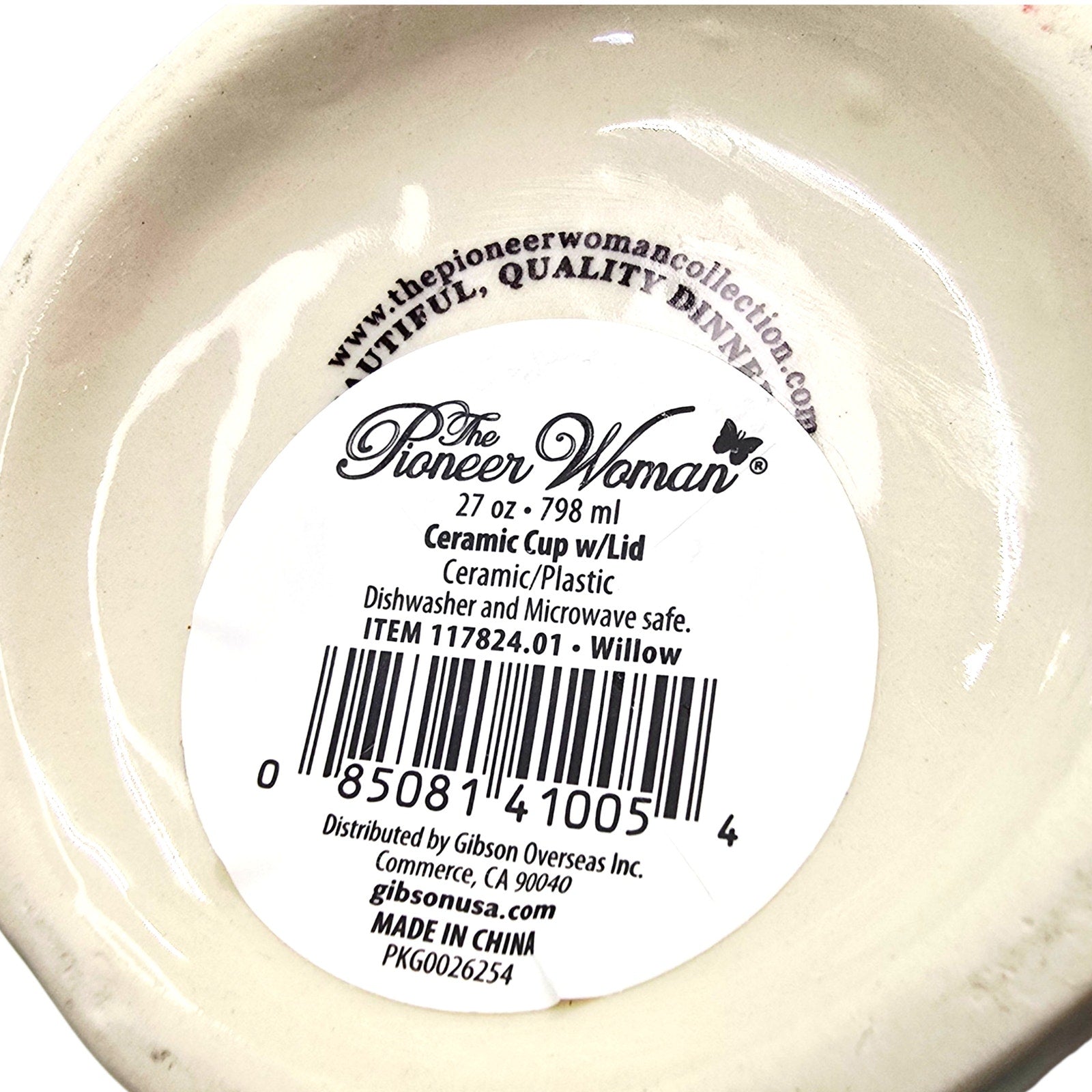 Large 27 oz ceramic cup with lid from the The Pioneer Woman 27 oz Ceramic Cup with Lid “Willow” floral collection. Features mint-handle and floral exterior, “Pioneer Woman” branding on base, dishwasher & microwave safe. Measures approximately 4″ H × 5.5″ rim diameter × 7″ W (with handle). No visible chips or cracks; see photos for details.
