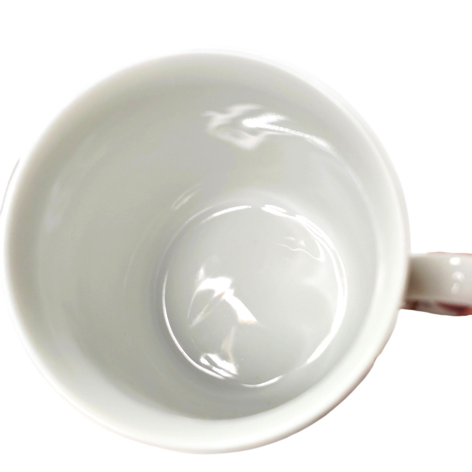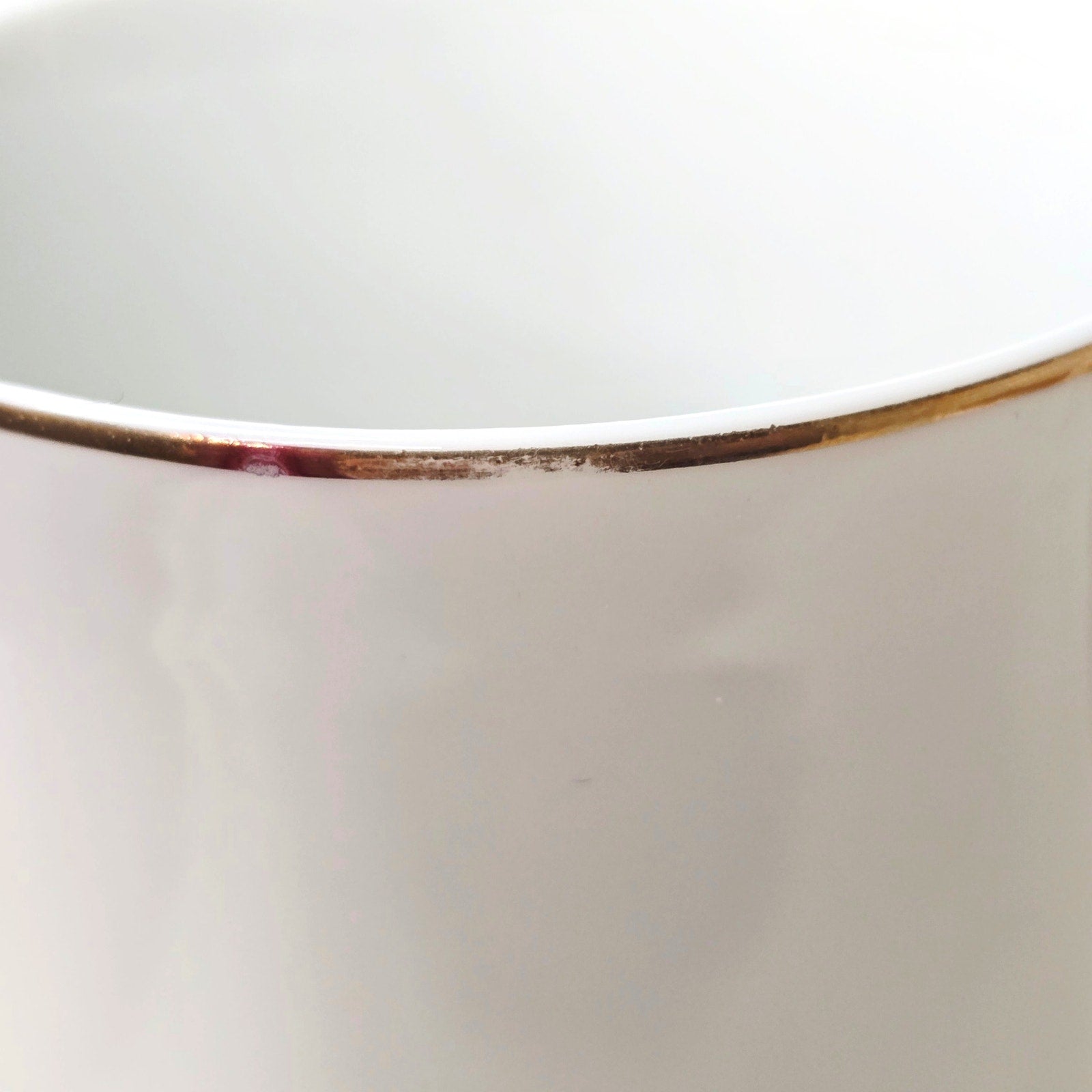 Mug: Pre-owned vintage condition. There is visible gold wear/fading along the top rim and some shelf-wear discoloration on the unglazed underside of the base. No chips or cracks detected.
