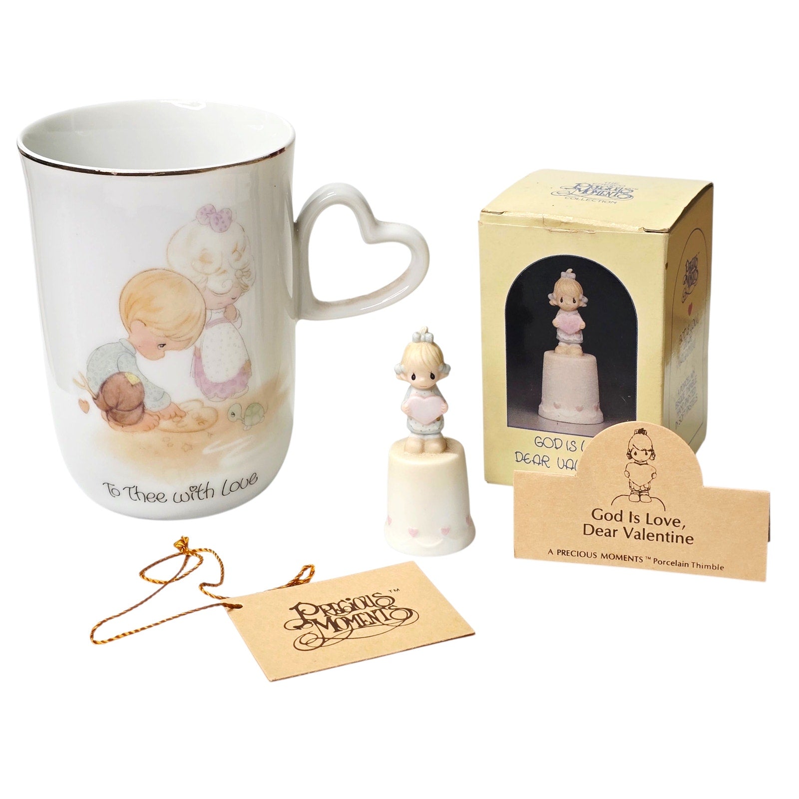 Precious Moments Lot: "God is Love, Dear Valentine" Thimble and 1980 "To Thee with Love" Mug
