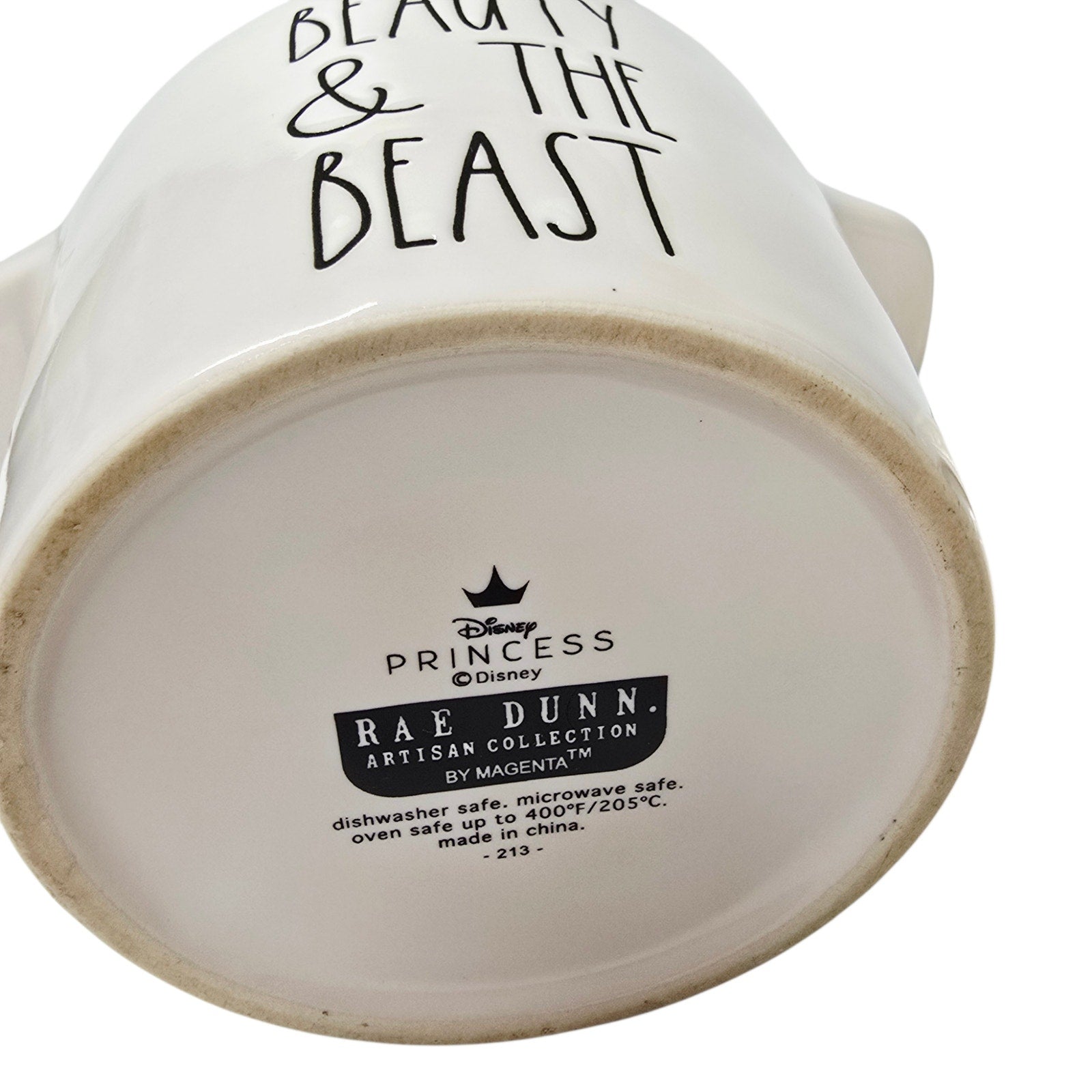 Details: Vibrant yellow "Beauty & The Beast" text; high-gloss white ceramic finish.