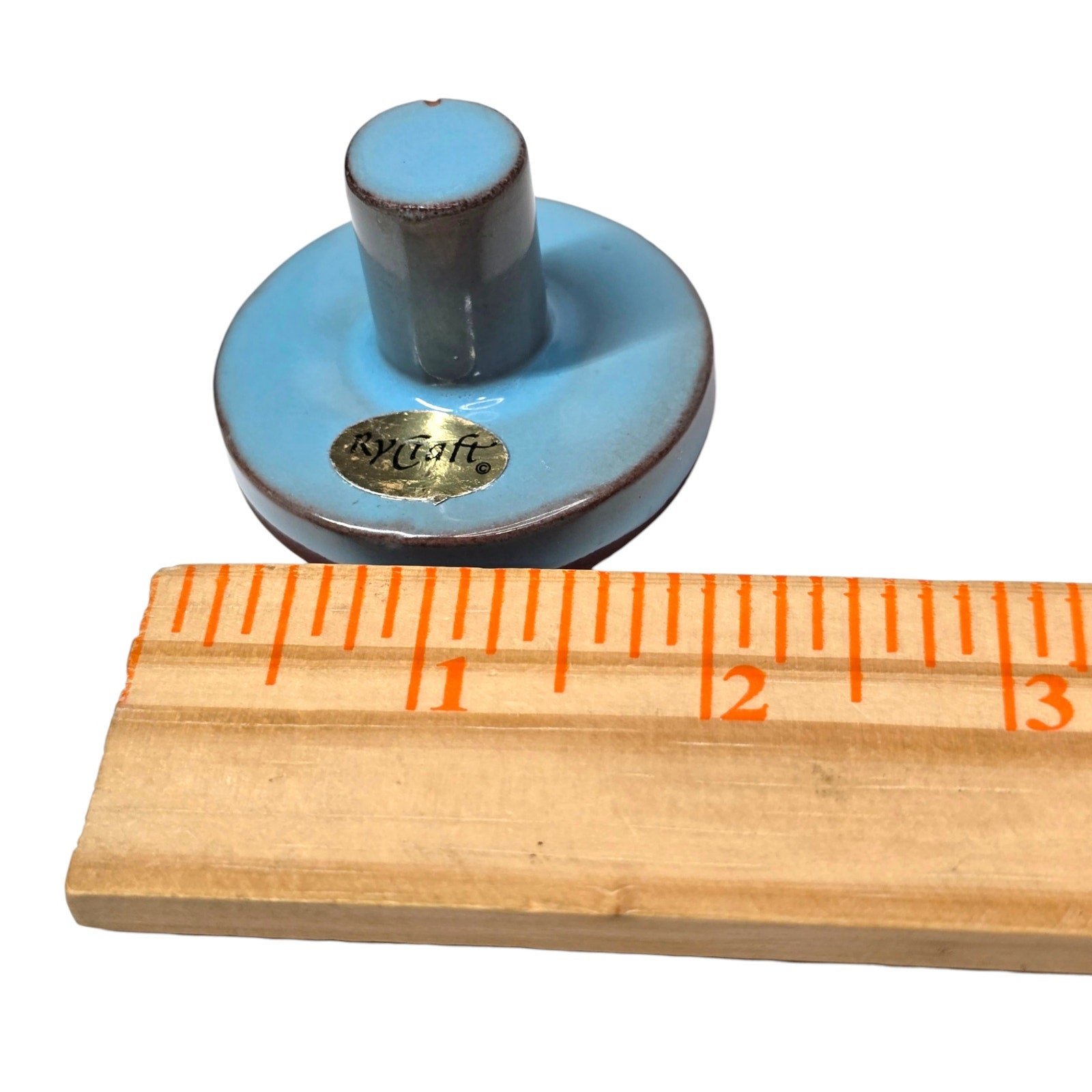 This is a charming vintage terra cotta cookie stamp by Rycraft. It features a beautifully detailed floral design with a vibrant blue glazed top and a classic round knob handle. Known for their high-quality craftsmanship, Rycraft stamps are perfect for shortbread, butter cookies, or even paper crafting and clay work.