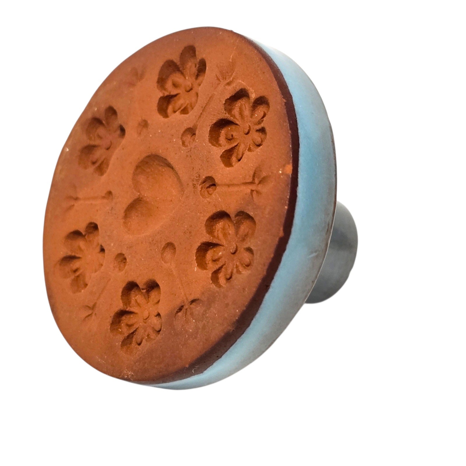 Rycraft Cookie Stamp Terra Cotta Blue Glazed Ceramic Butter Press Flower MCM