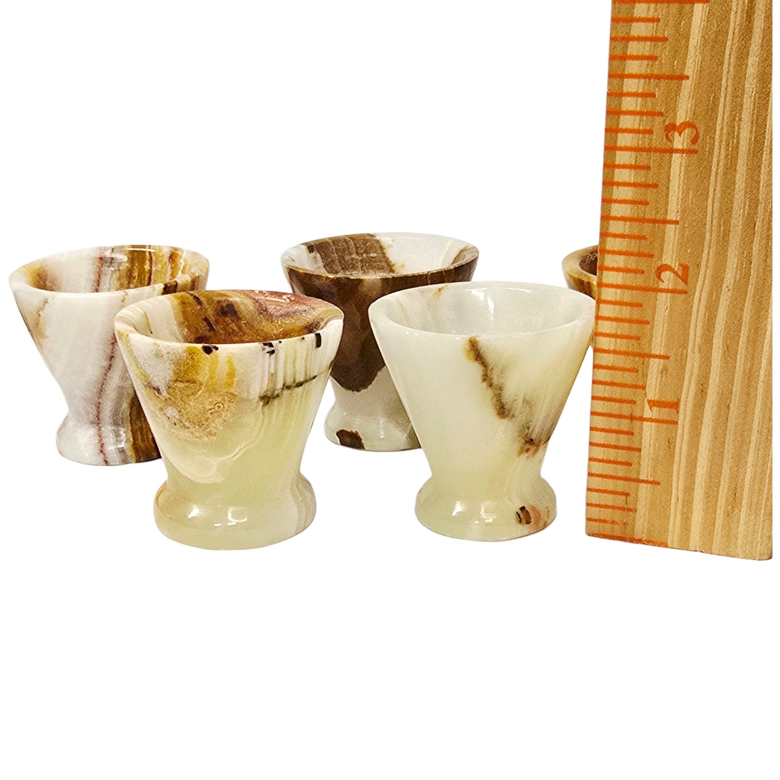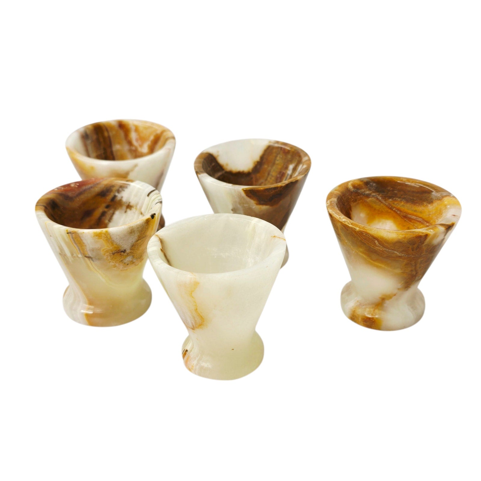 Elevate your bar cart with this beautiful set of 5 vintage natural Onyx shot glasses. Each piece is hand-carved, showcasing unique earth-toned banding and translucent stone patterns characteristic of genuine marble. These have a heavy, high-quality feel and a smooth polished finish—perfect for tequila, espresso, or as unique decorative accents.