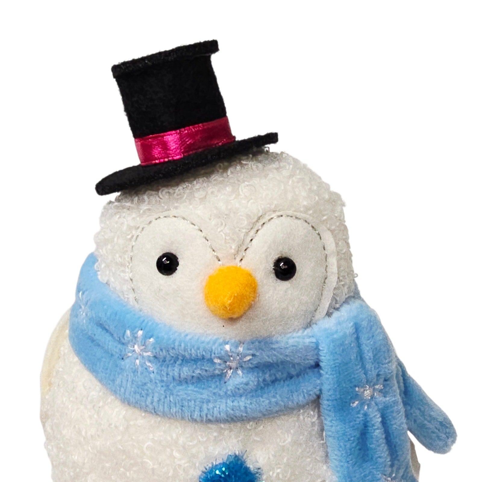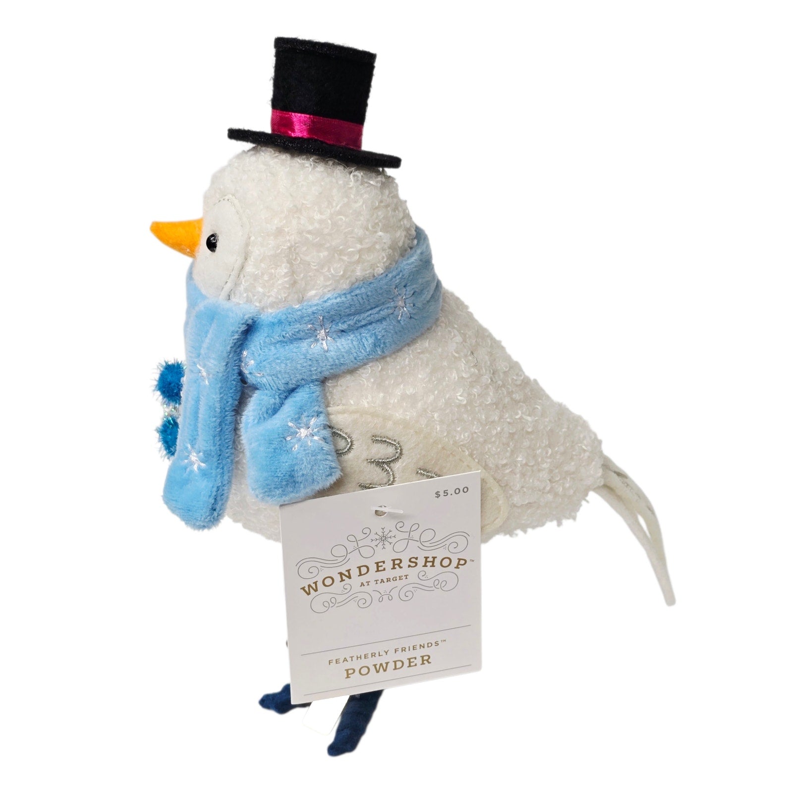 Meet Powder, the delightful 2024 Winter bird from Target's Featherly Friends / Wondershop collection. This whimsical snowman bird features a soft white body, a dapper black top hat, and a cozy blue knit scarf.