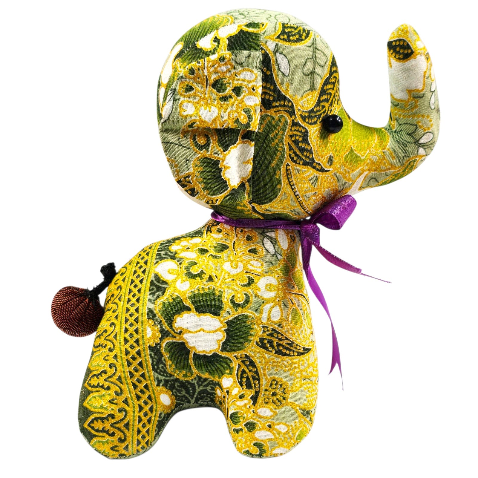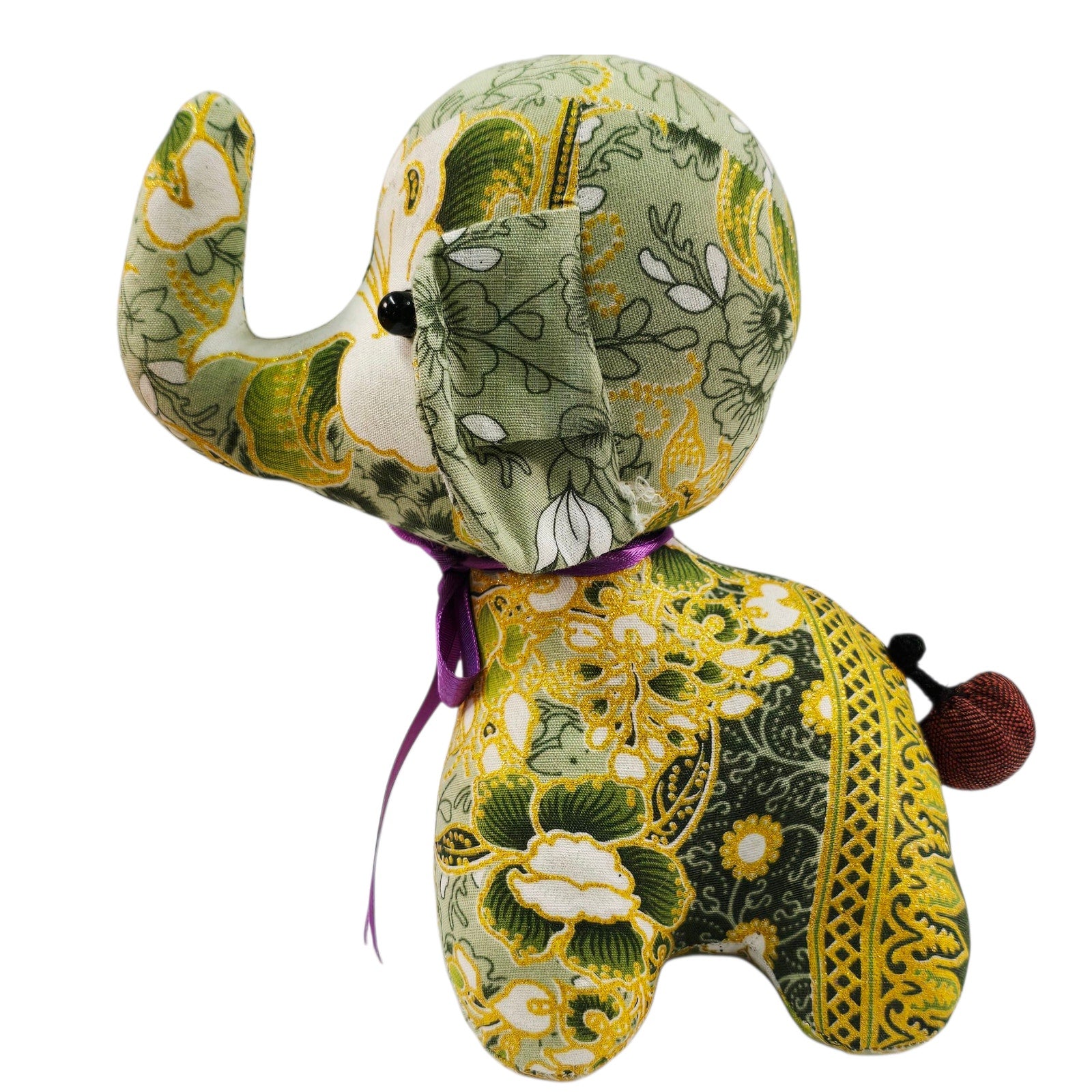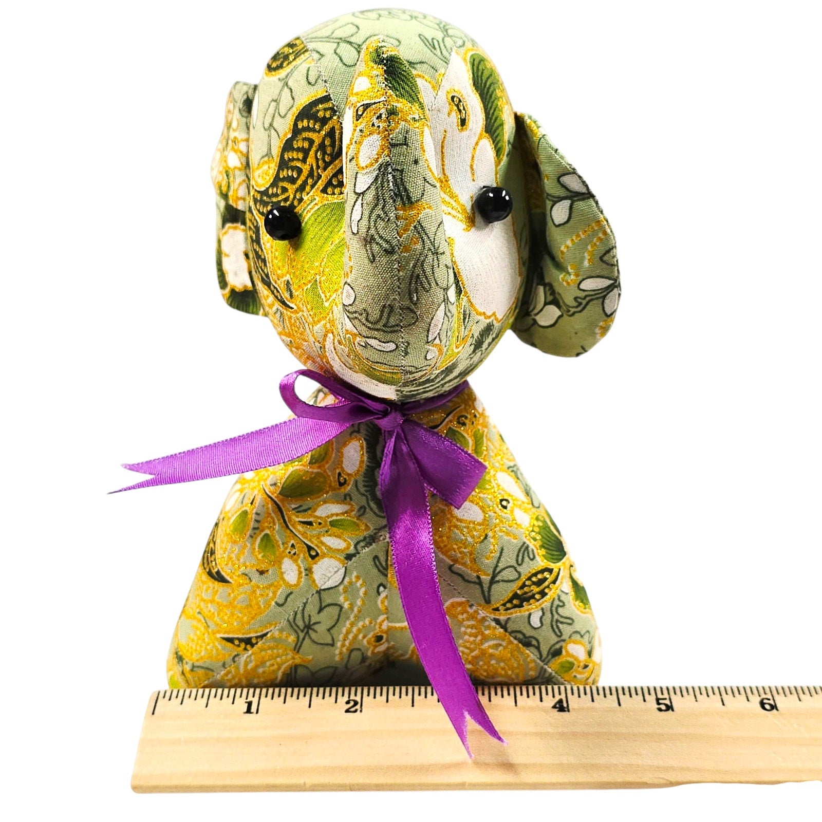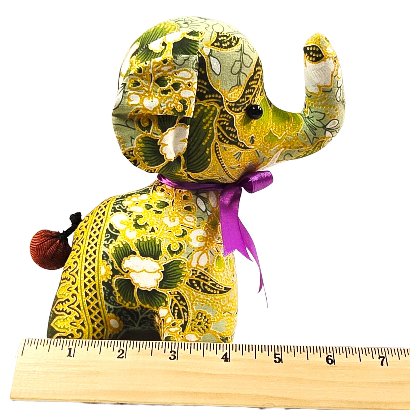 Thai Elephant Doll Handmade Stuffed Toy Green & Yellow Fabric Purple Ribbon AS IS