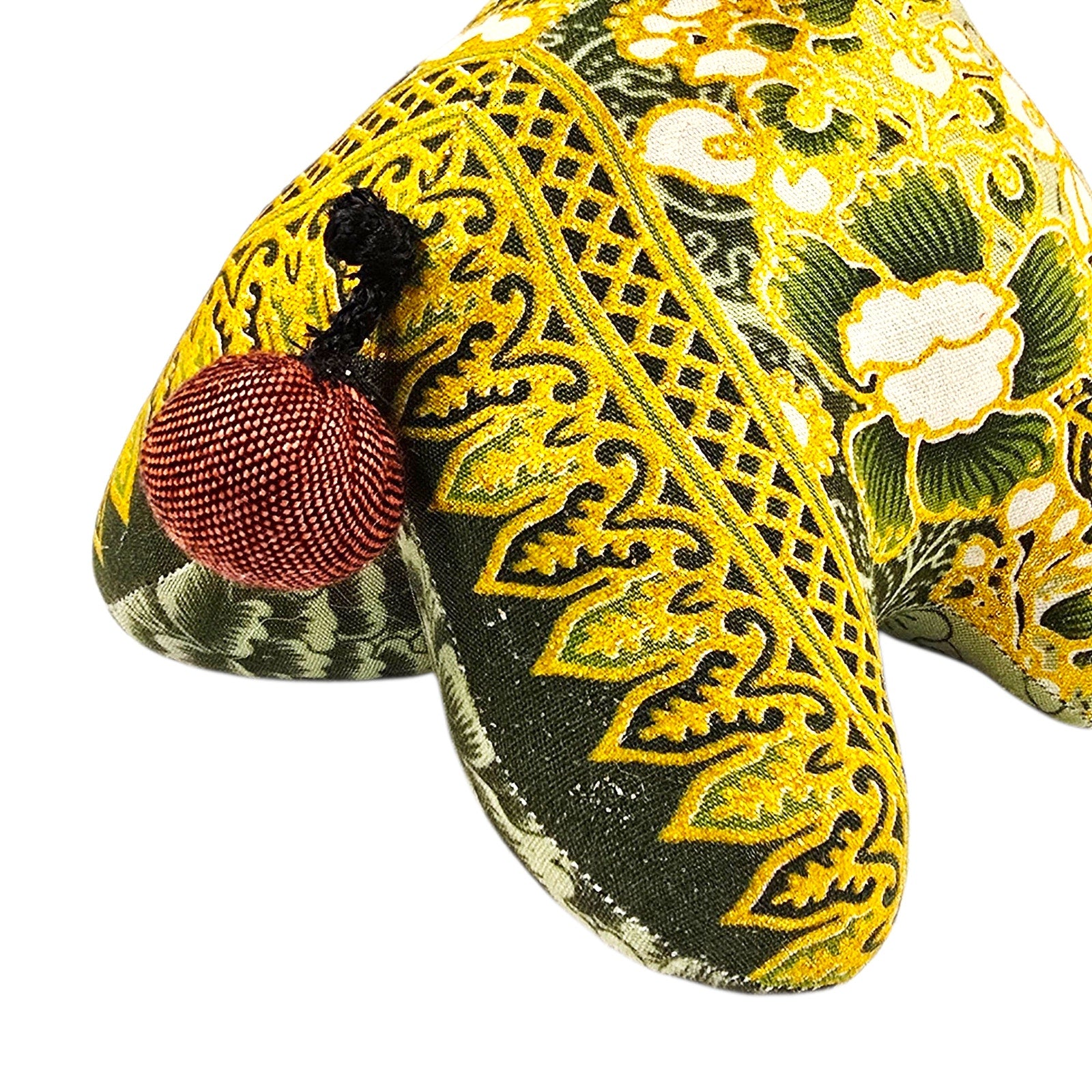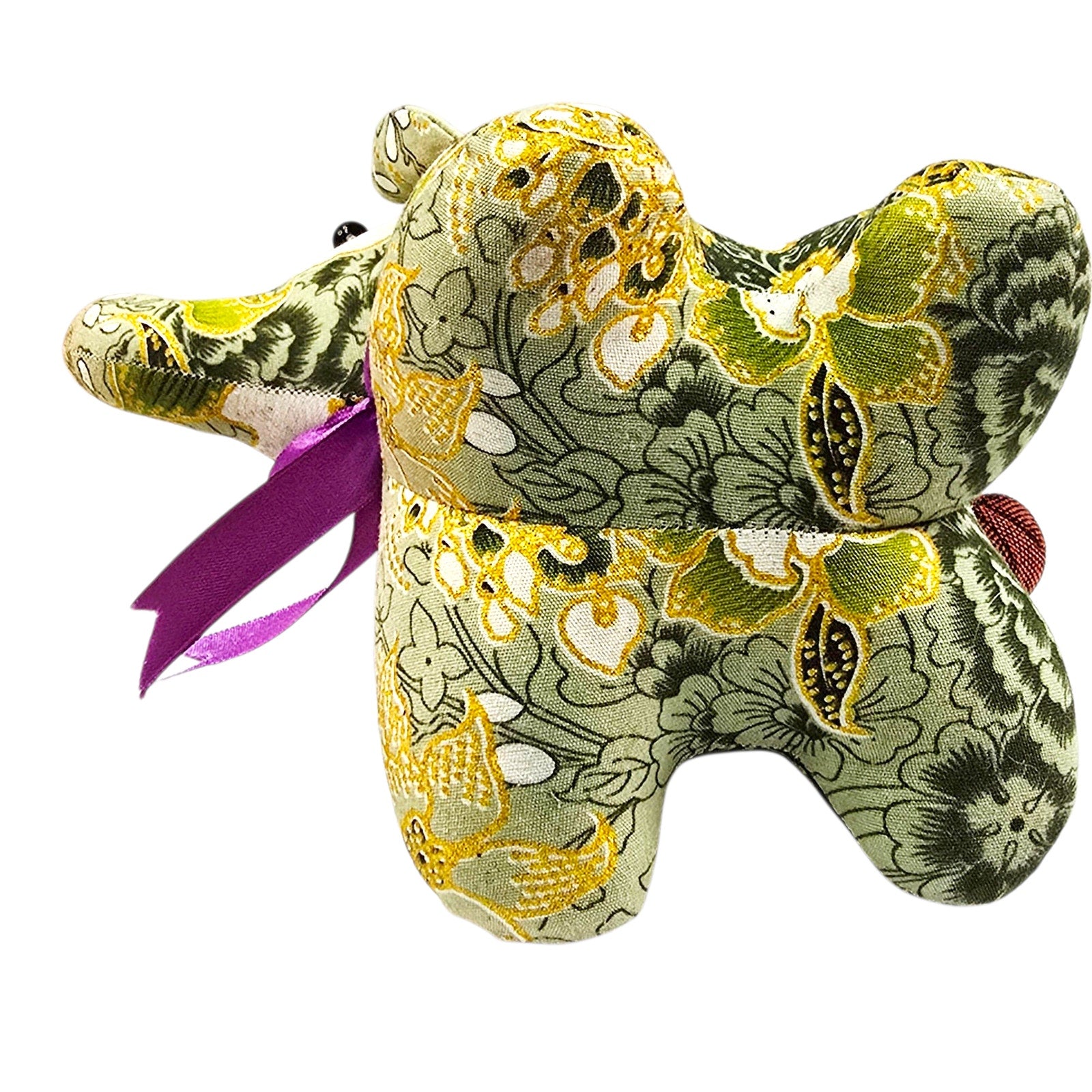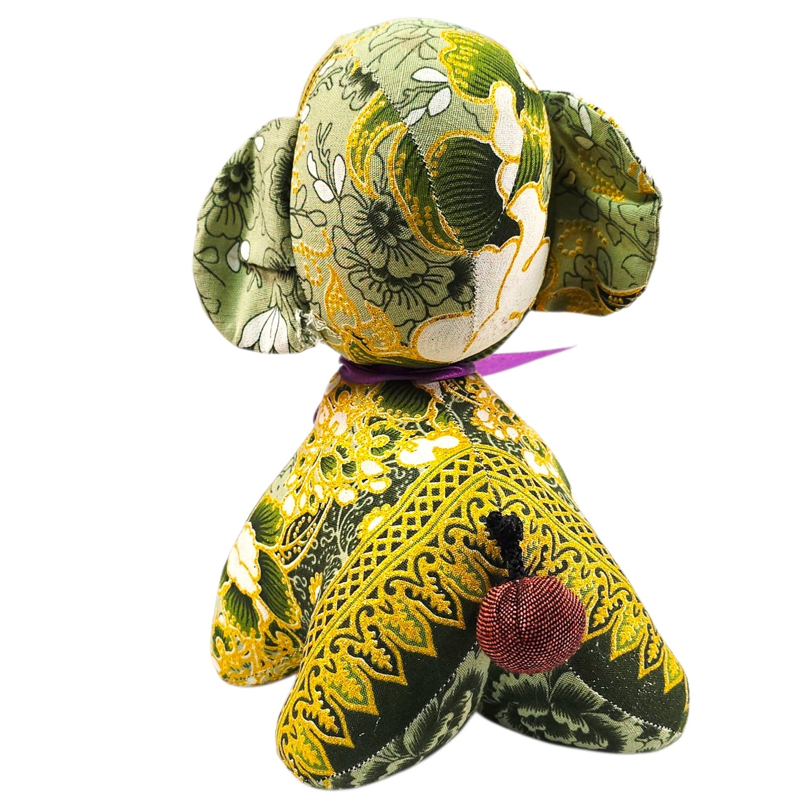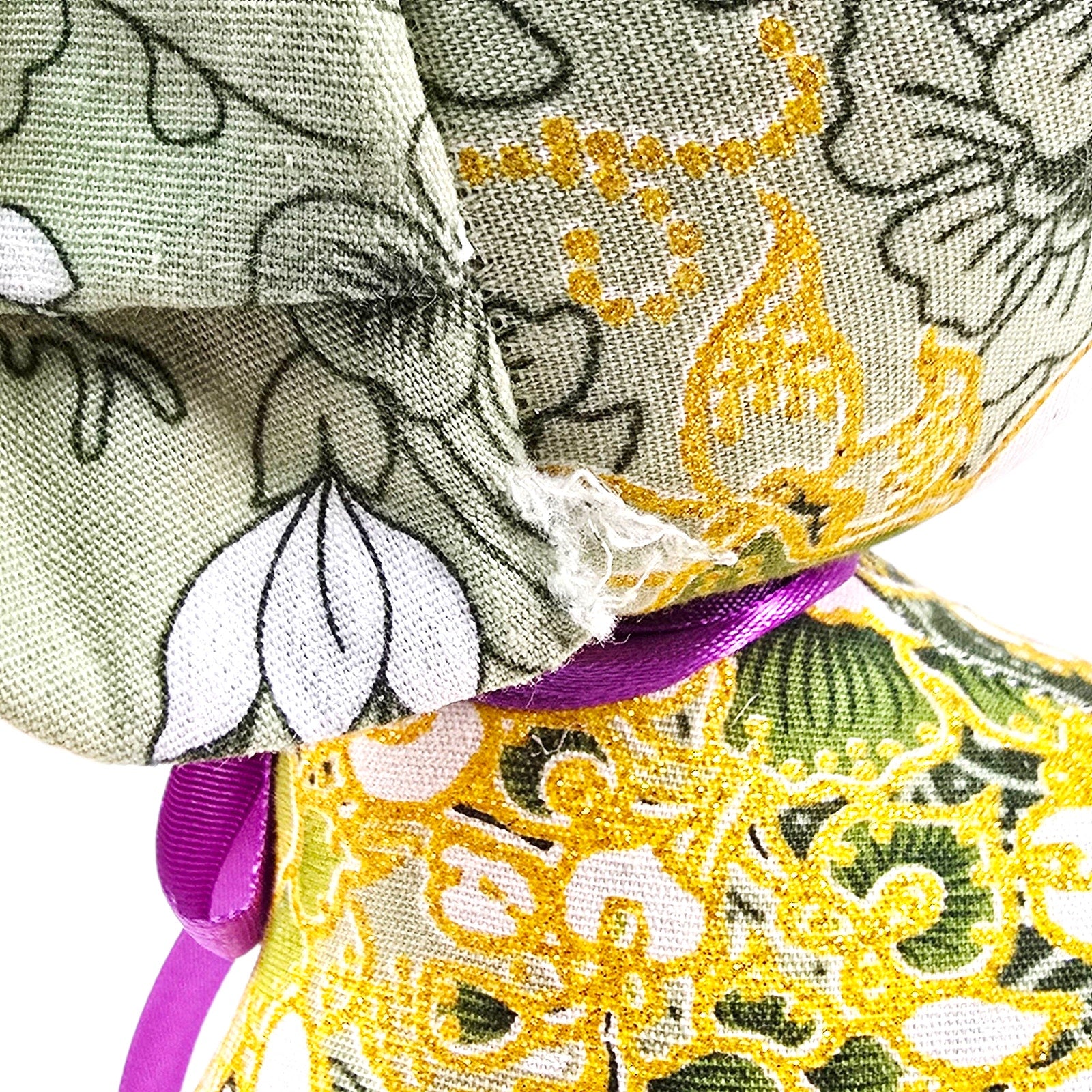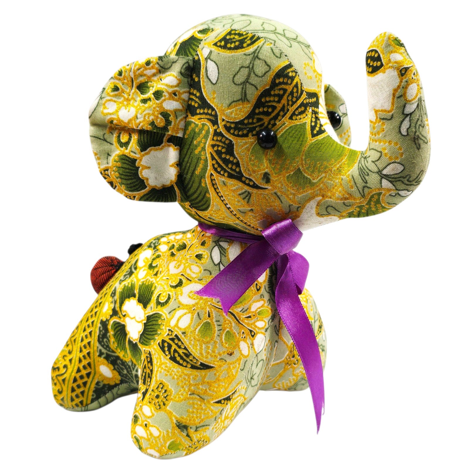 Thai Elephant Doll Handmade Stuffed Toy Green & Yellow Fabric Purple Ribbon AS IS