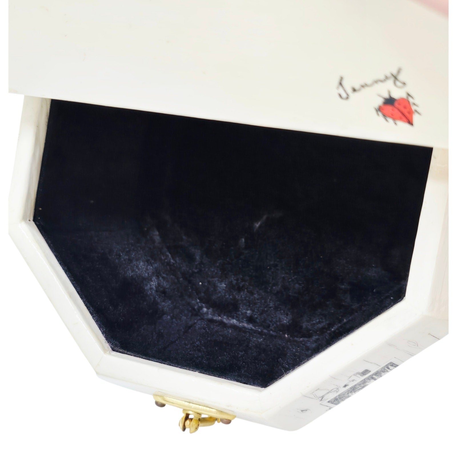 Interior: Black velvet/flocked lining; lid interior features a hand-written Christmas 1973 dedication and a ladybug motif.