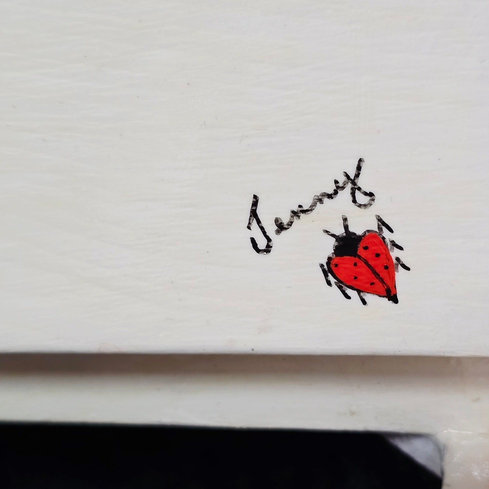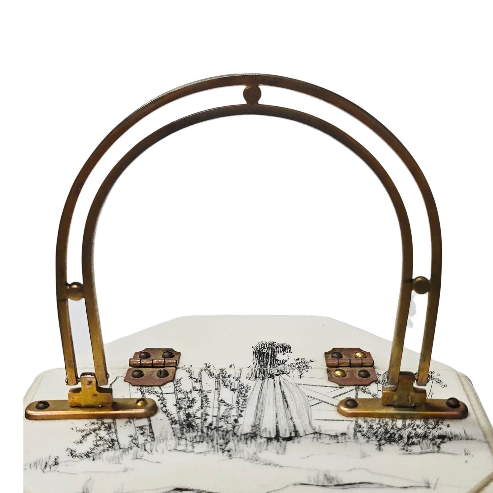 The personalized message and ladybug motif inside the lid suggest this was part of the DIY "box purse" movement of the early 70s, where artists like Beki customized pieces for specific clients. These purses were often viewed as wearable pieces of art rather than just functional accessories.