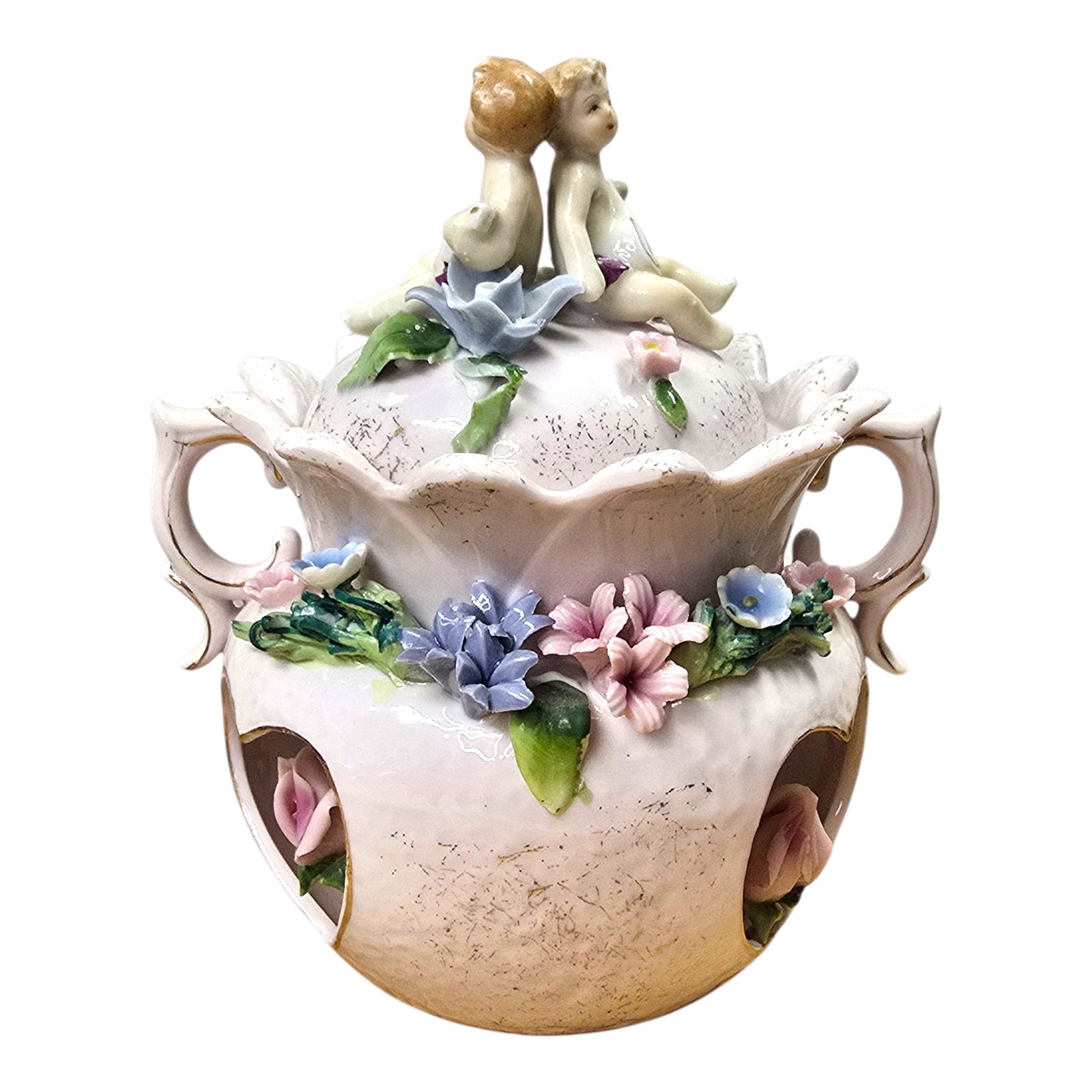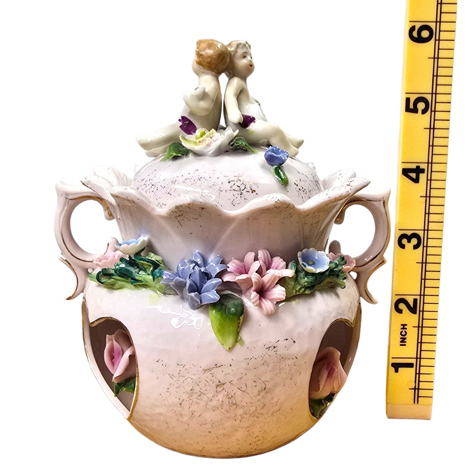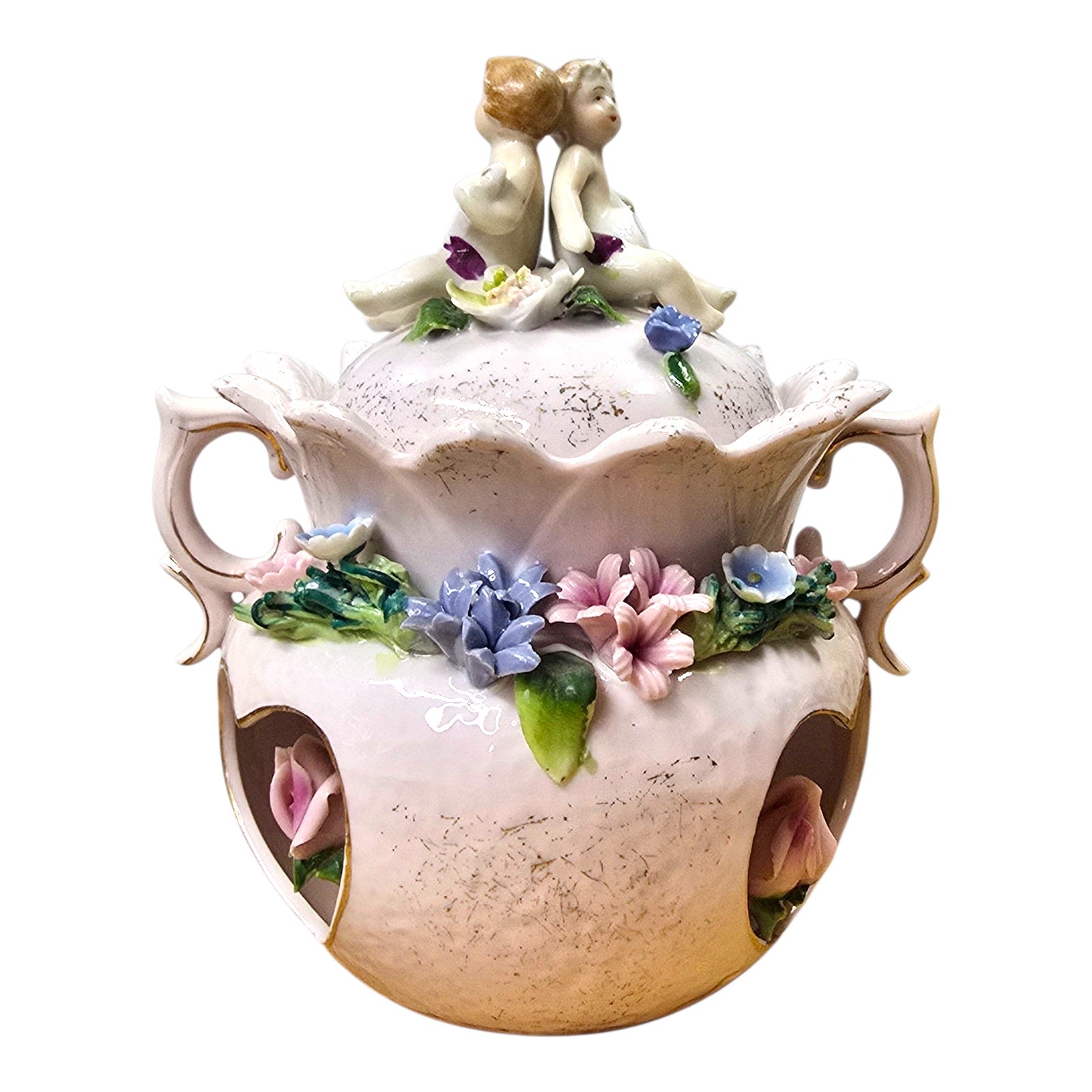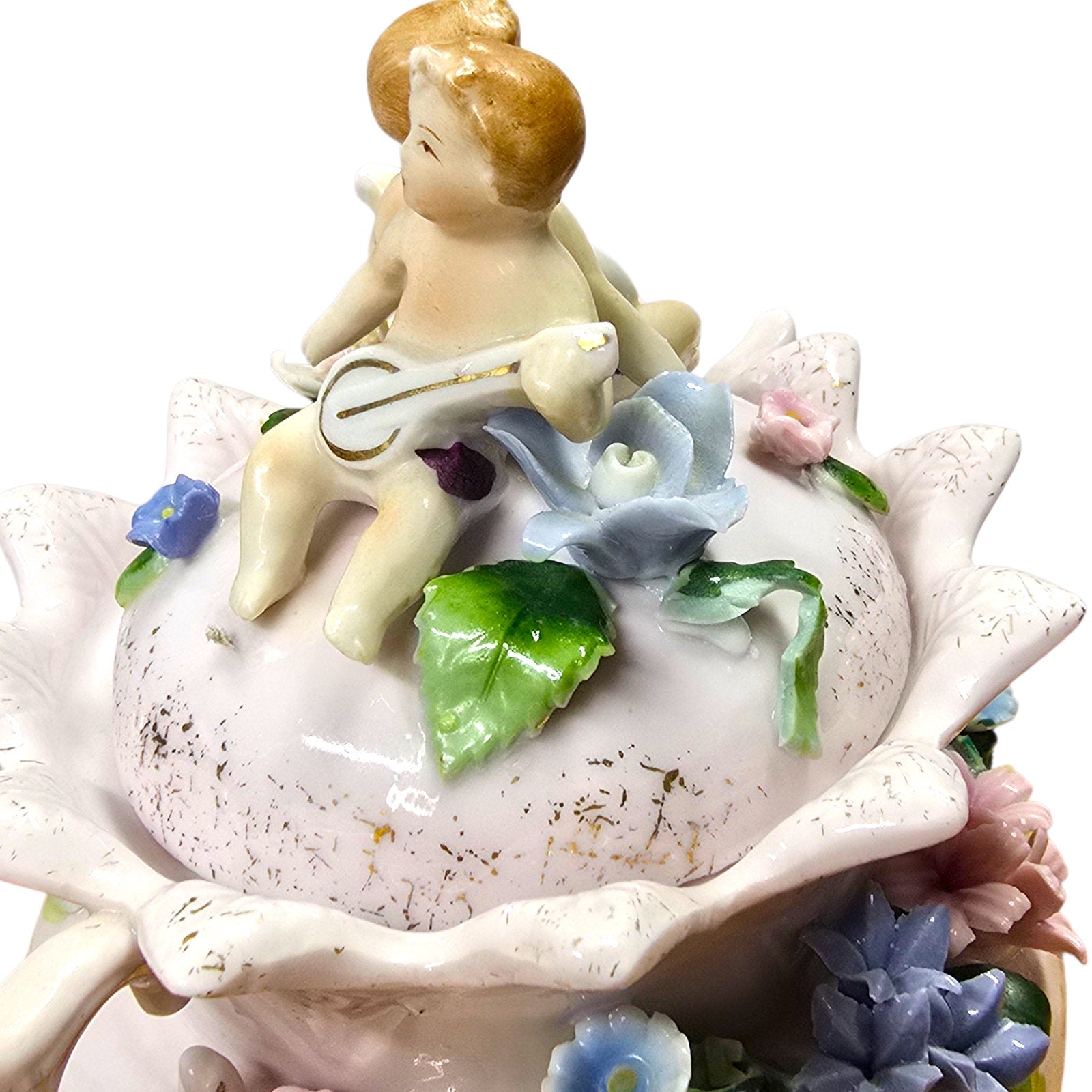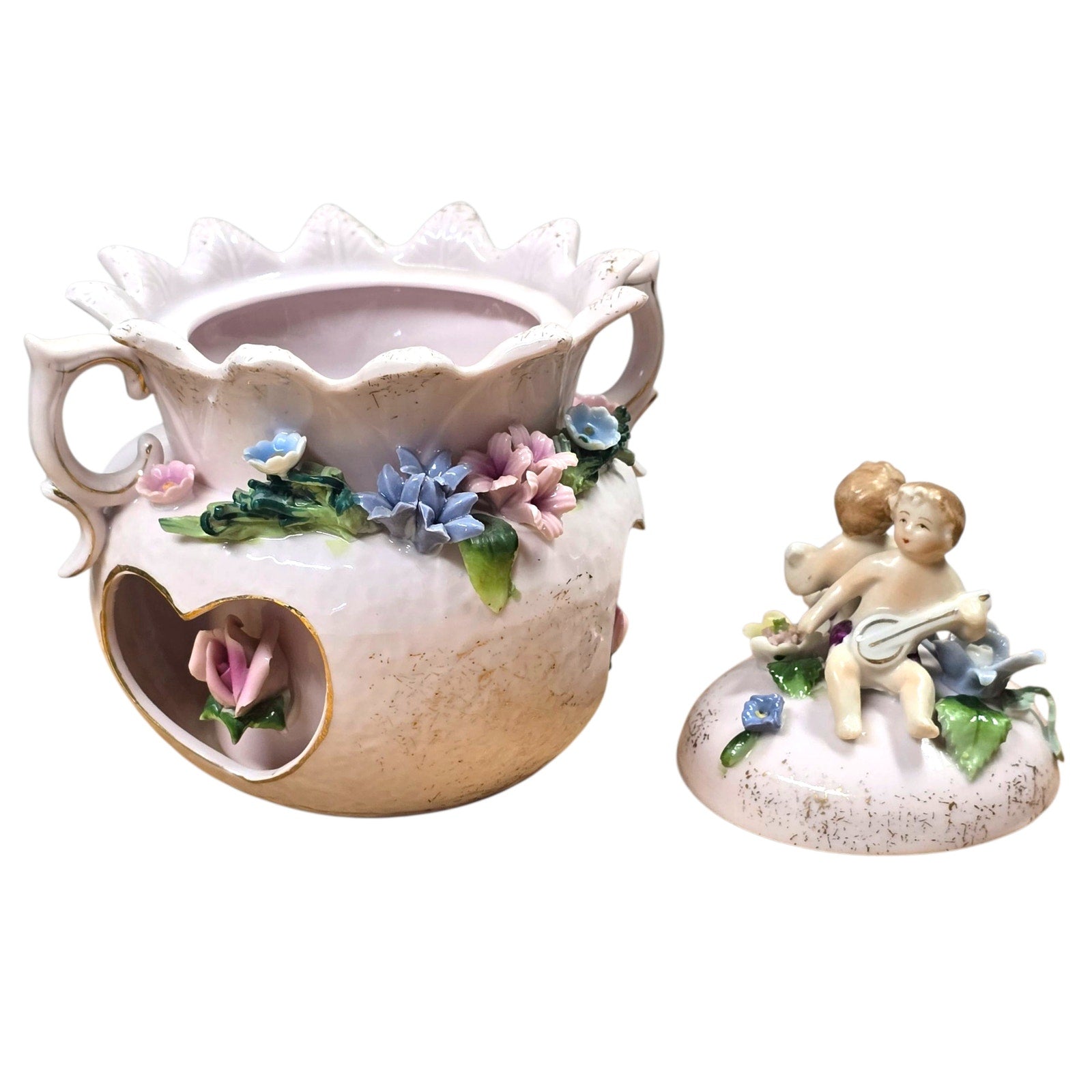 Vintage Capodimonte Style Porcelain Jar Cherub Lid Floral Applied Flowers Pink