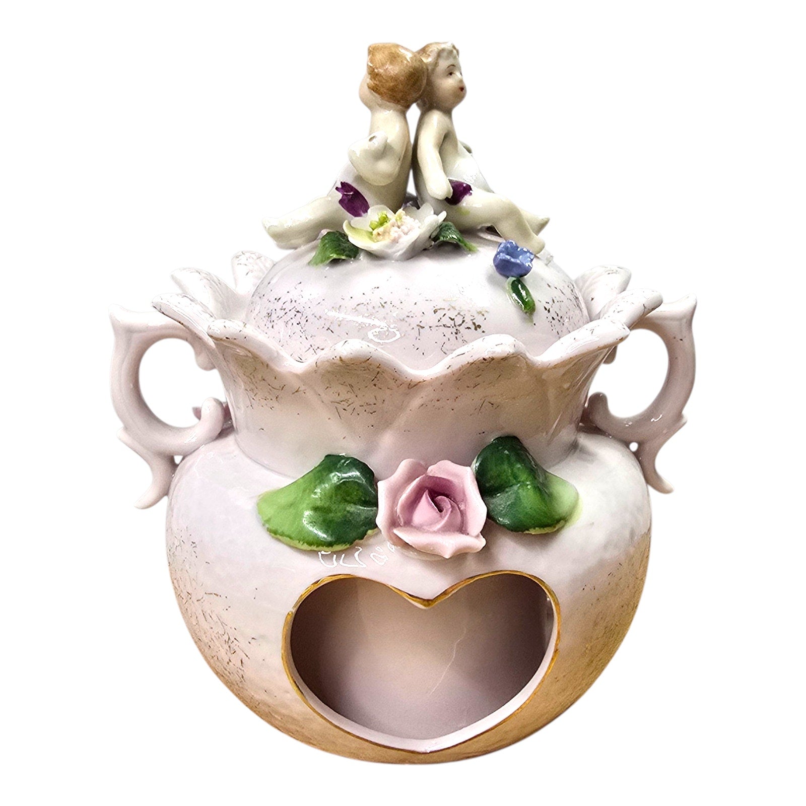 Romantic Capodimonte-style porcelain lidded jar with applied pastel florals and heart cut-outs—sweet statement for vintage vanity or grandmillennial décor. Stands about 5.75" H. Unmarked.
