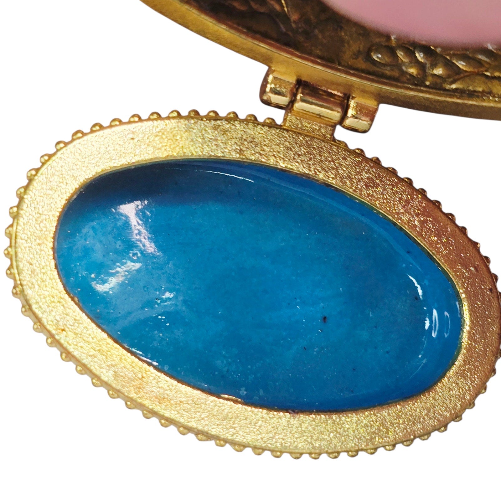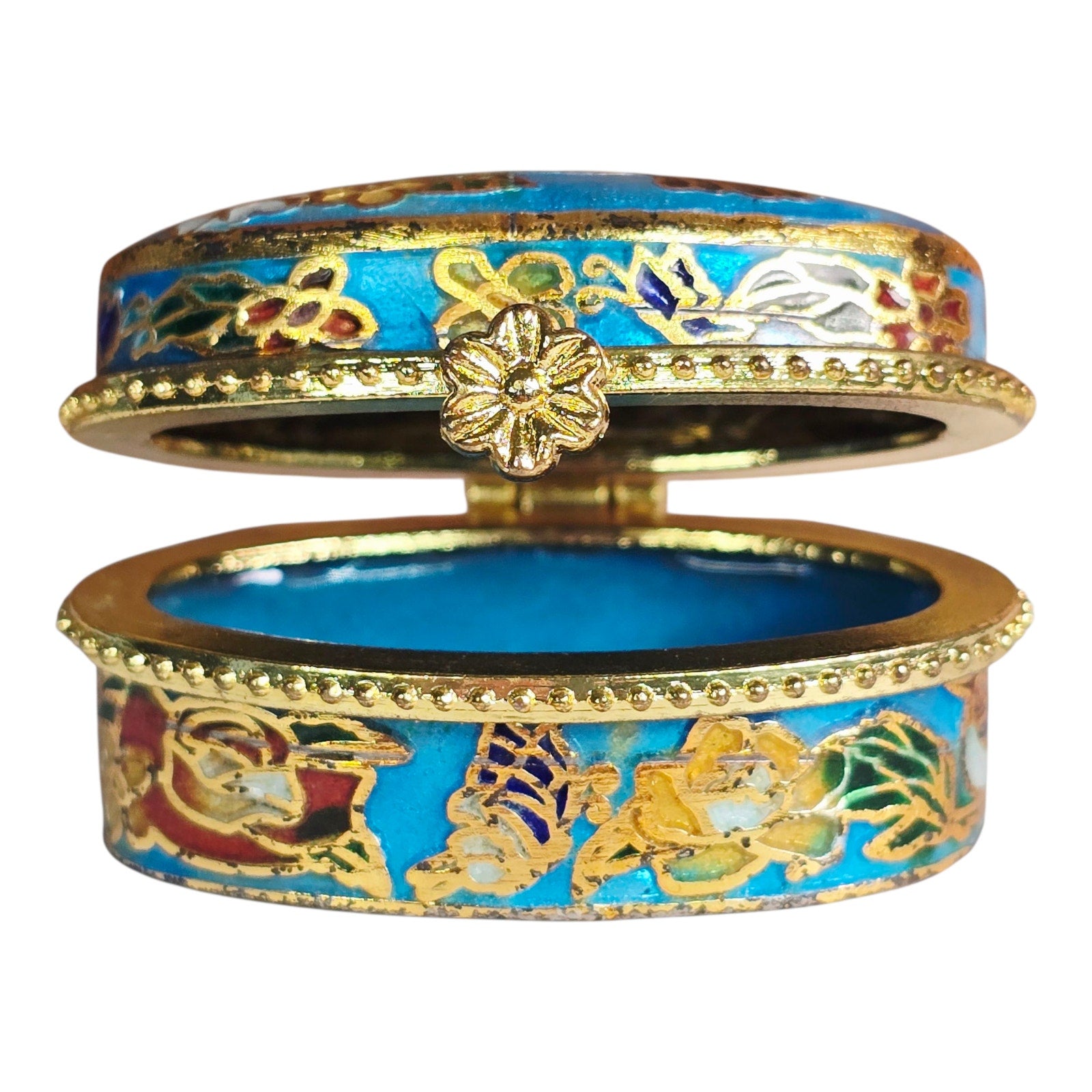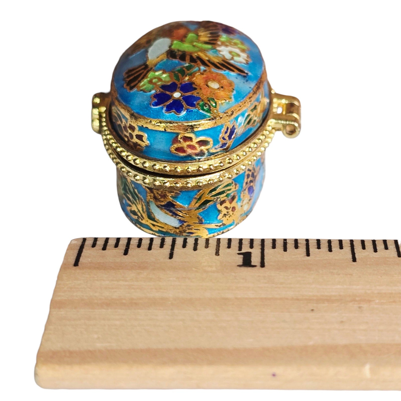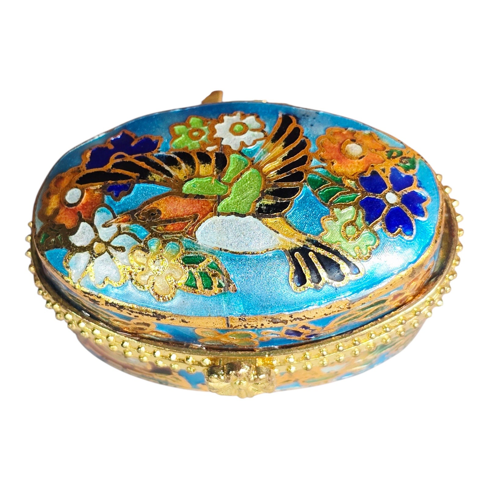 This is a beautiful vintage cloisonne trinket box featuring a delicate hummingbird and floral design against a lovely blue background. The box is small and oval-shaped, perfect for storing small treasures or as a decorative piece.