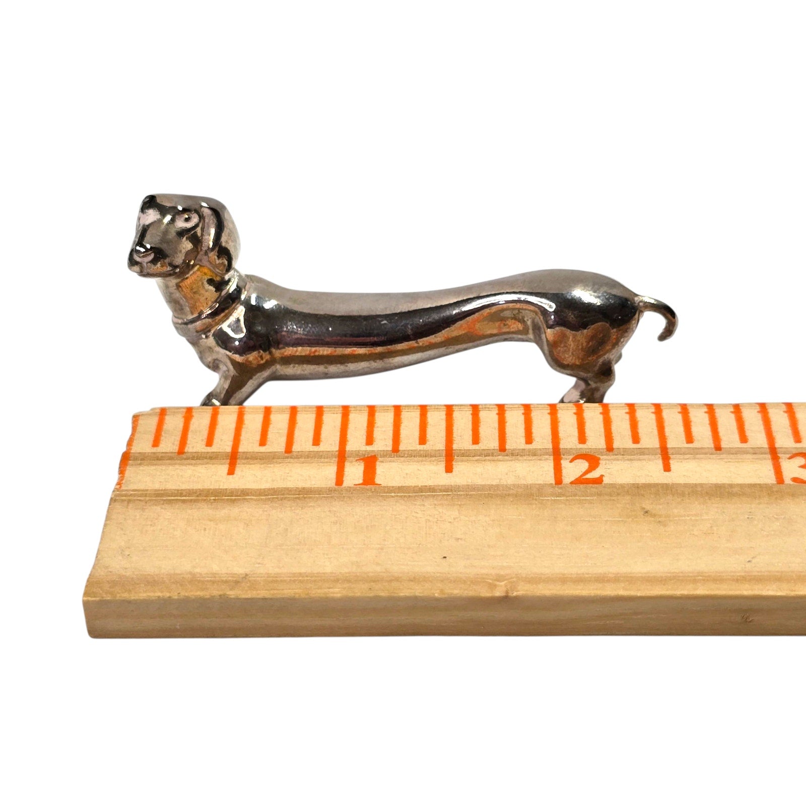 Set of five dachshund figural knife rests in silver-tone metal. Mid-century style table accessory.