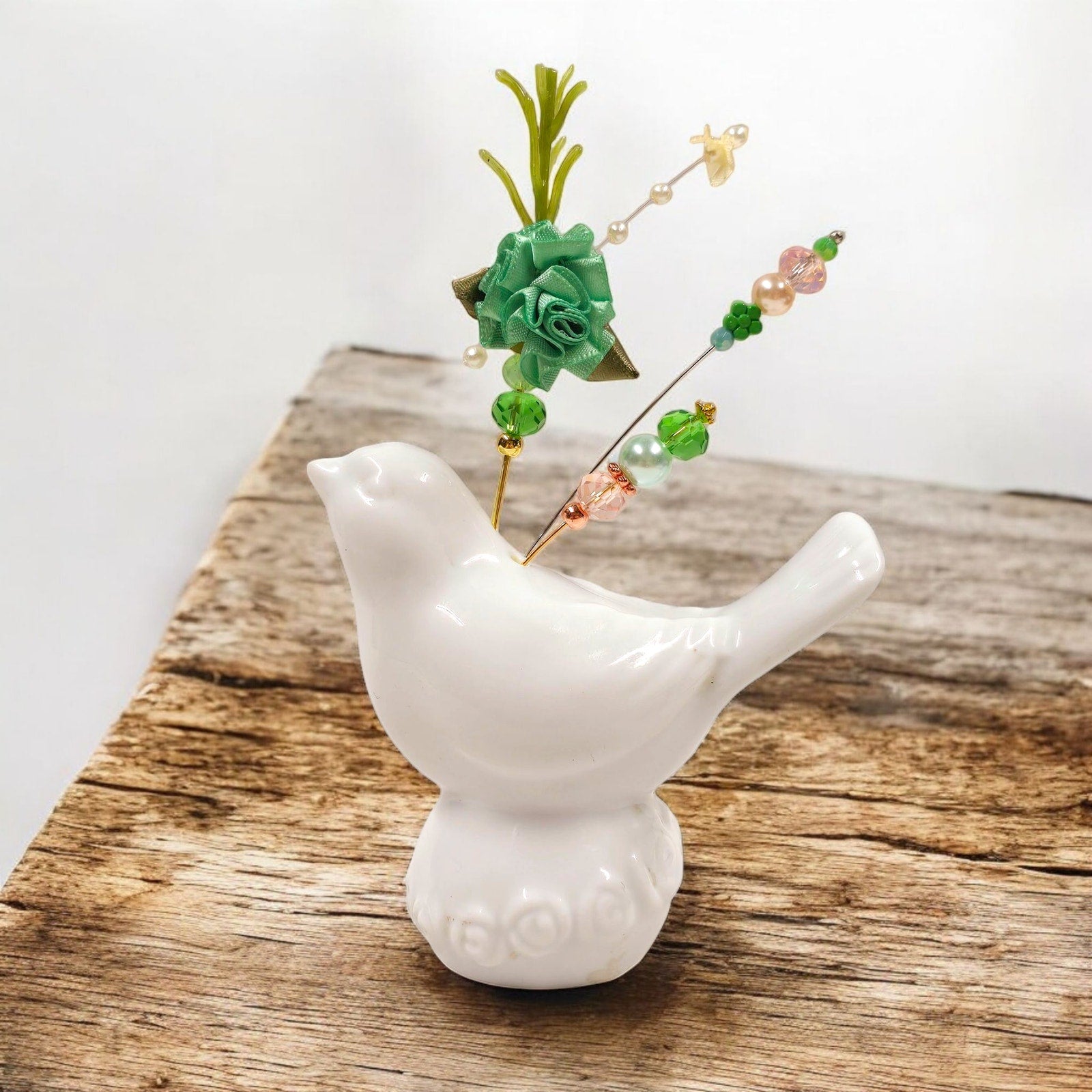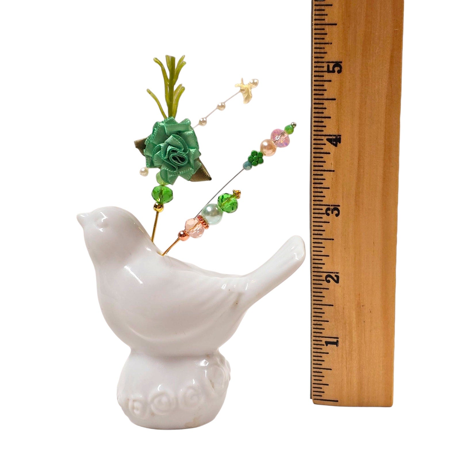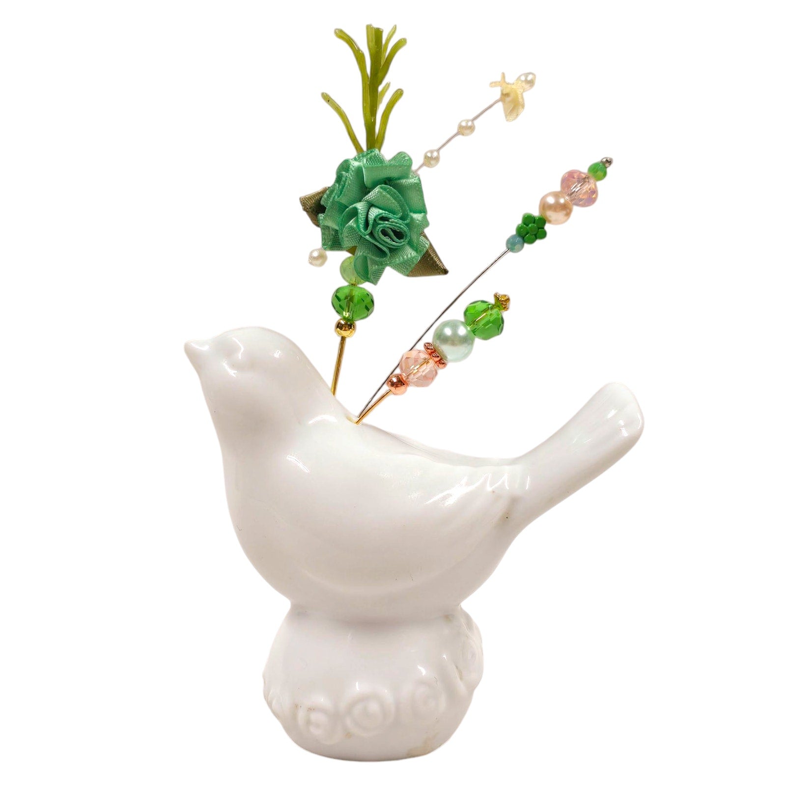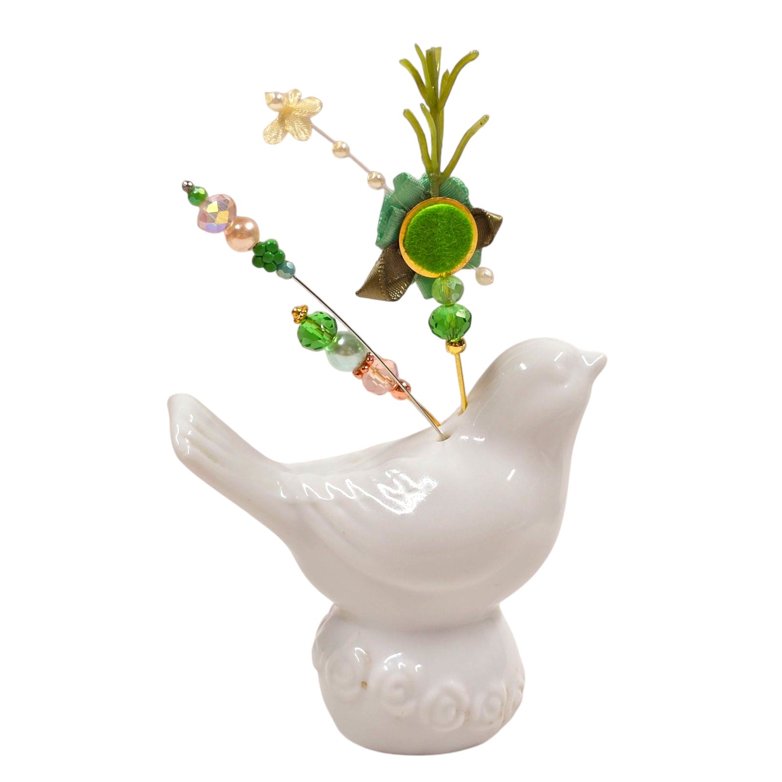 Vintage Green Floral Accent White Bird Salt Shaker Hat Pin Display