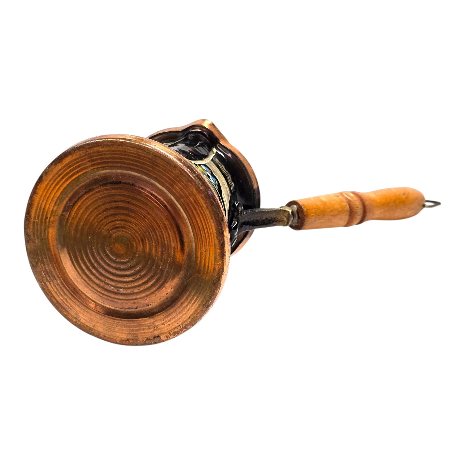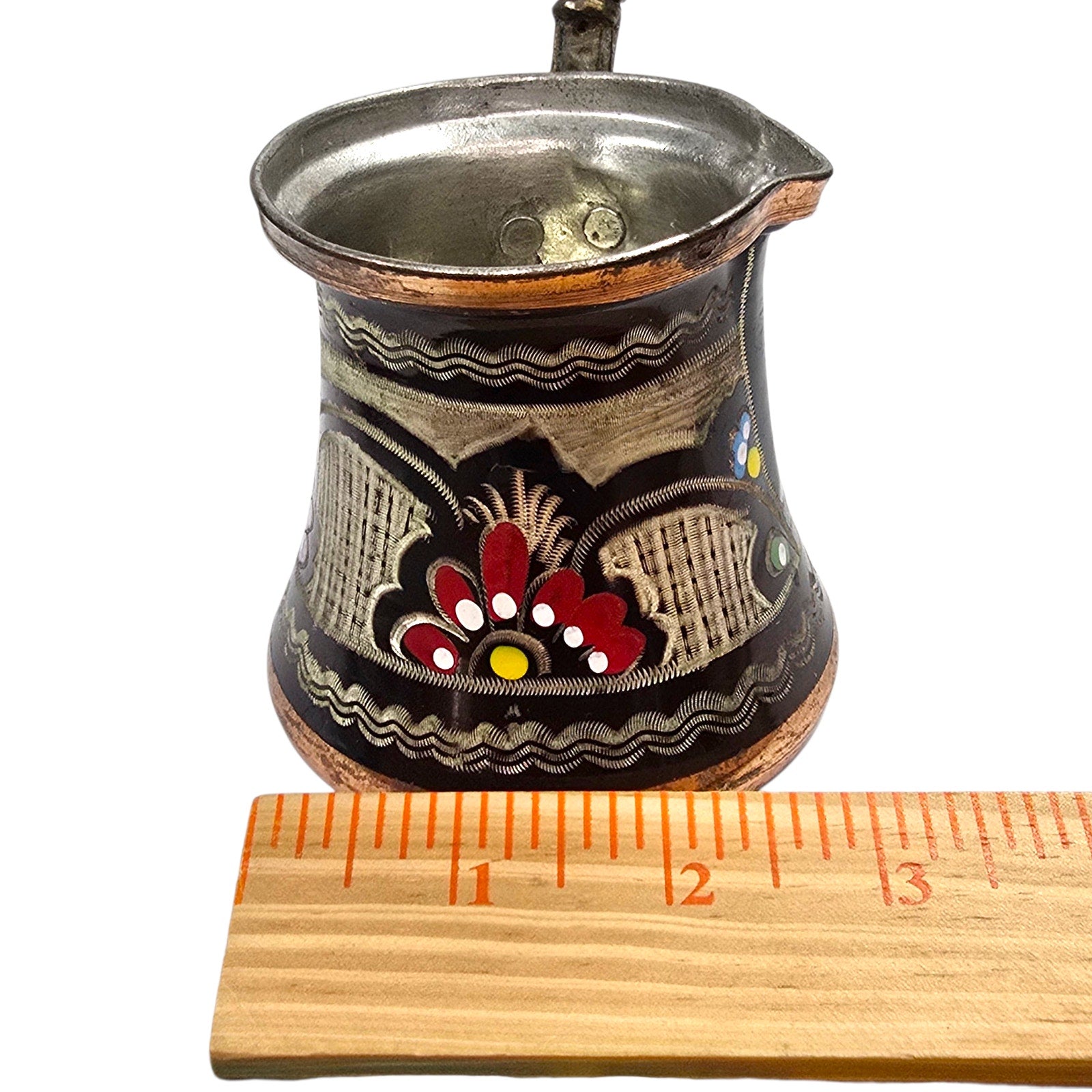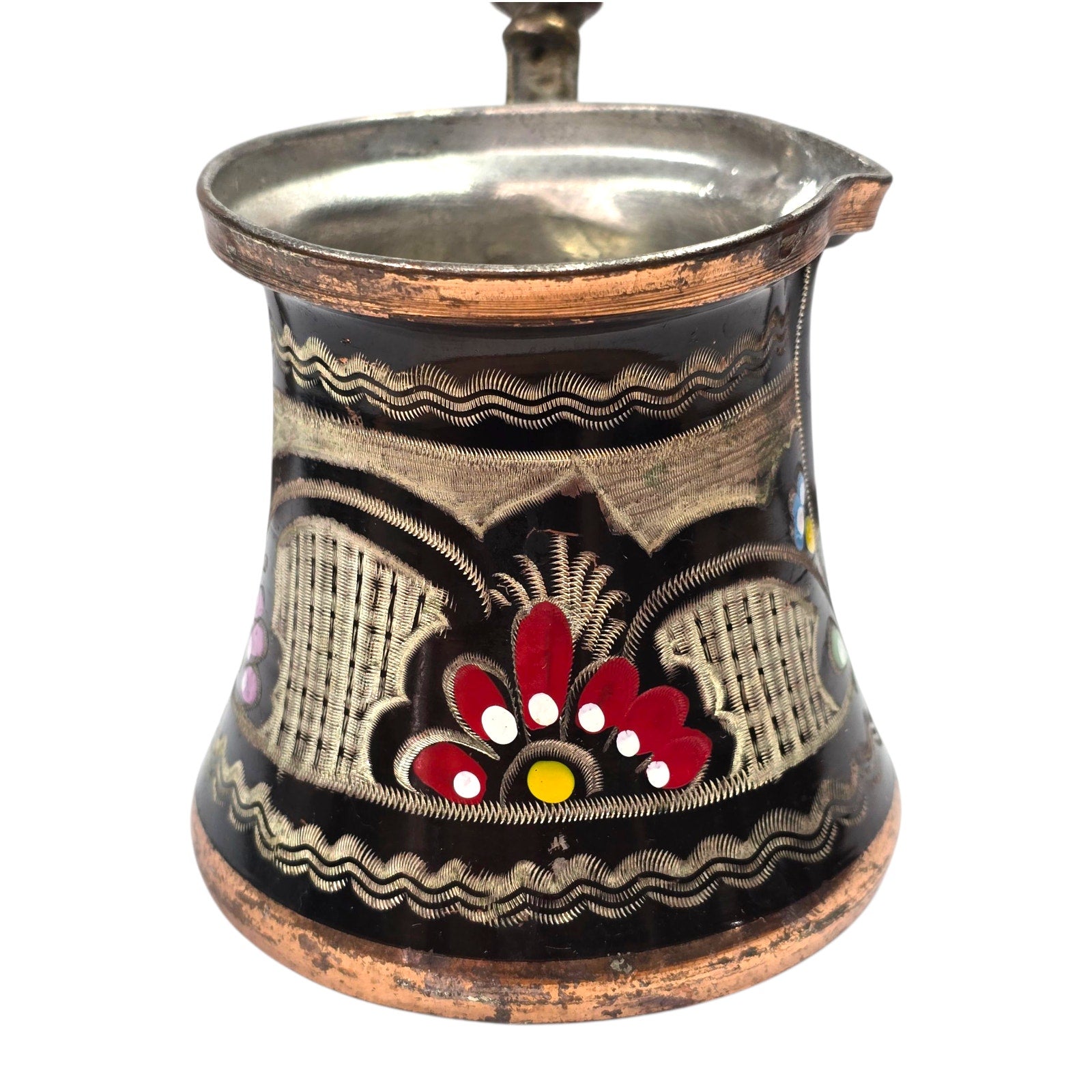 Vintage Hand Painted Copper Turkish Coffee Pot 6oz Enamel Floral Folk Art Cezve w/ Wood Handle